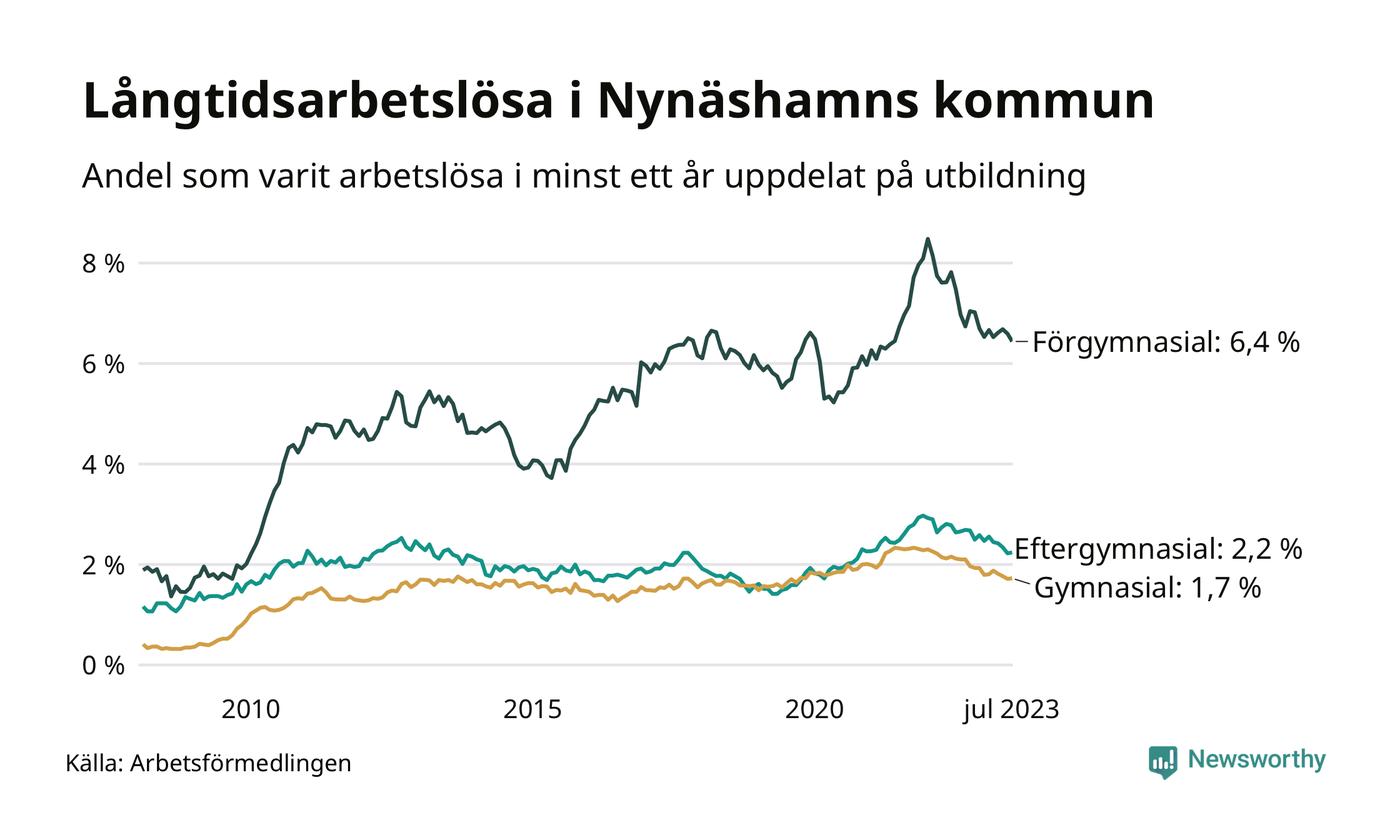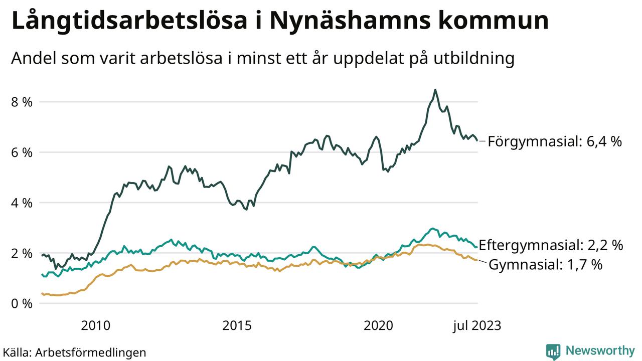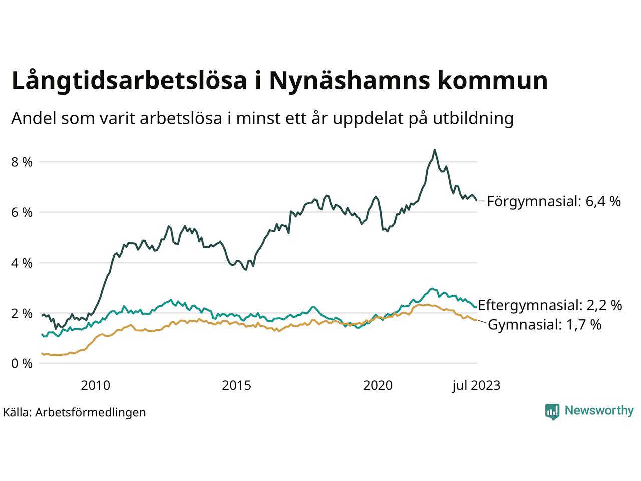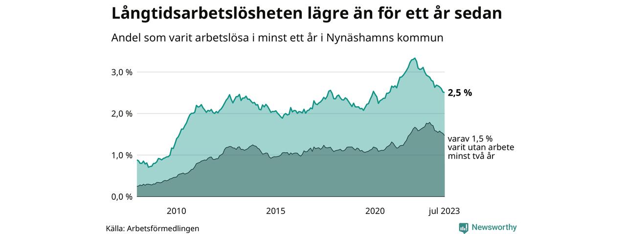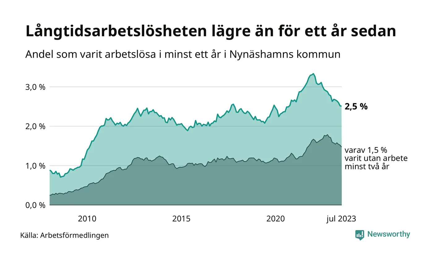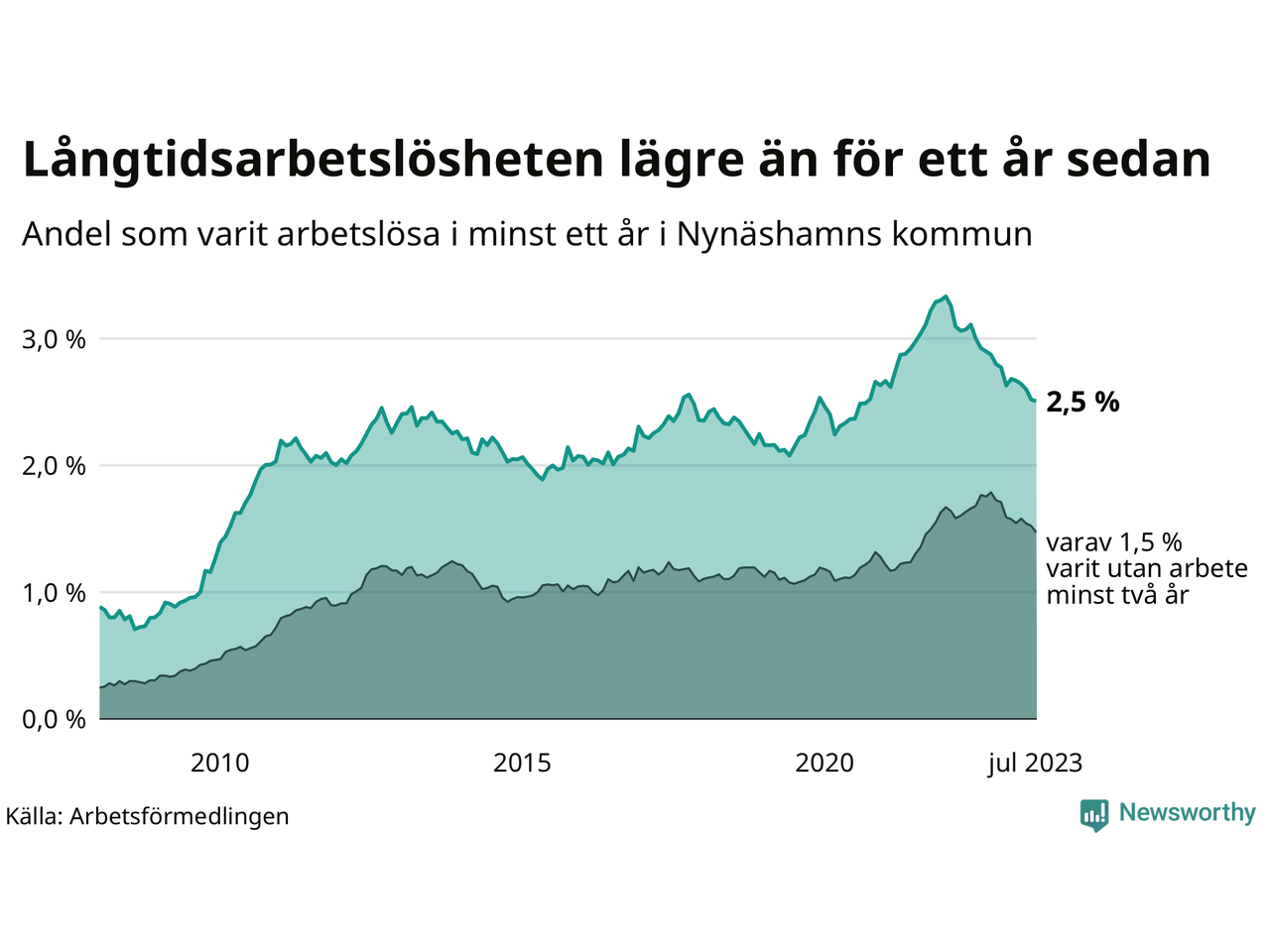 I juli hade 363 Nynäshamnsbor varit arbetslösa i minst ett år, vilket är en färre än månaden innan. Det är den femte månaden i rad med minskande antal långtidsarbetslösa. 363 personer motsvarar 2,5 procent av arbetskraften i kommunen – andelen långtidsarbetslösa är 0,5 procentenheter lägre än samma månad för ett år sedan.
