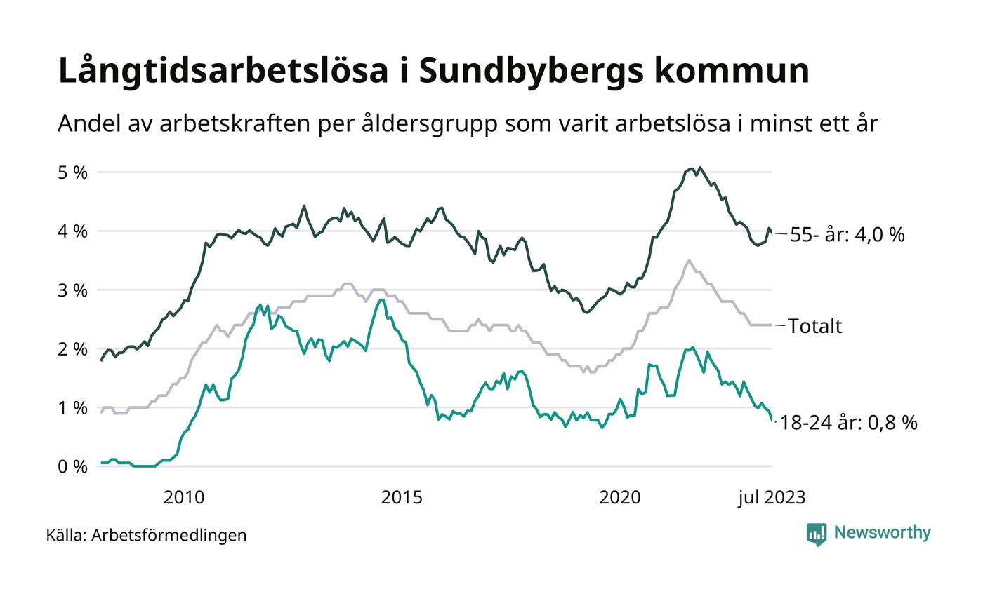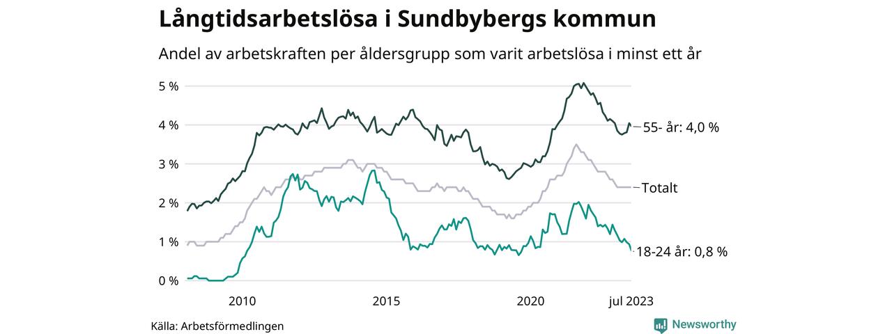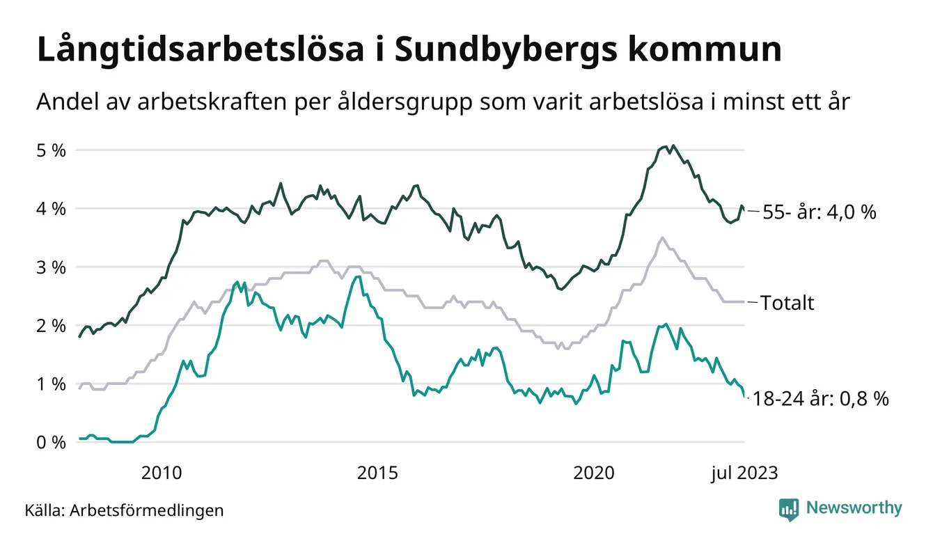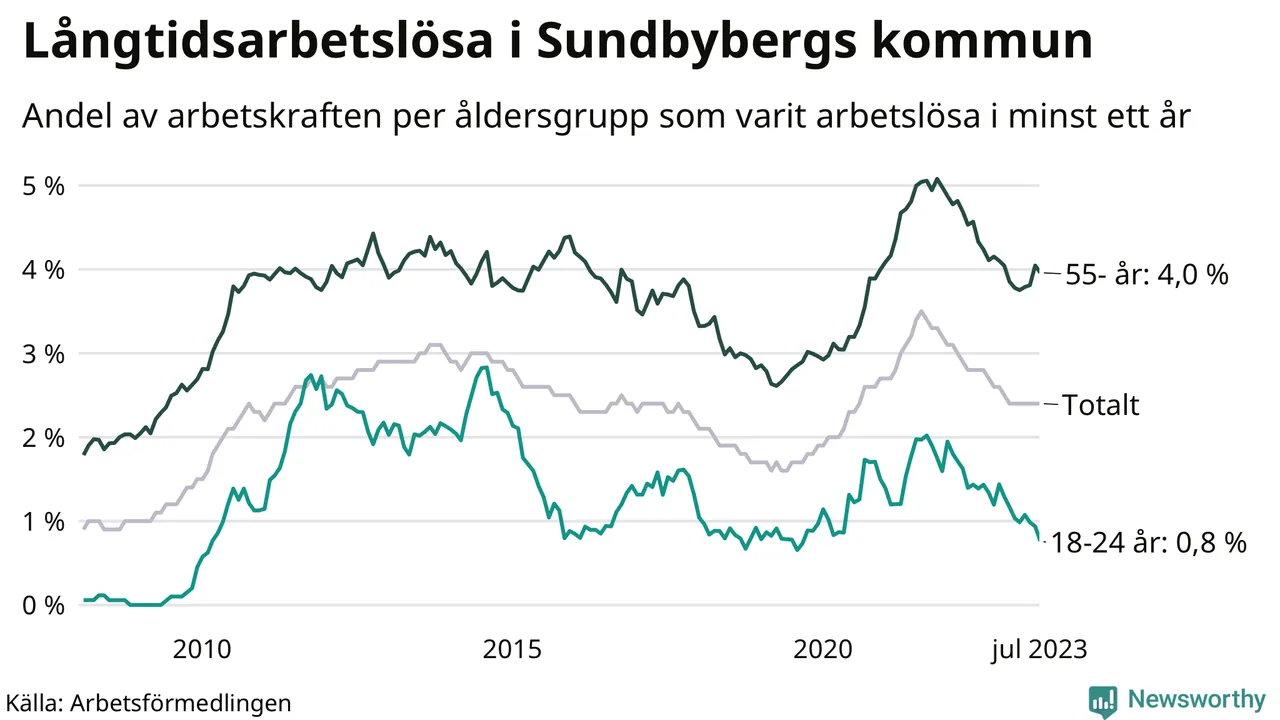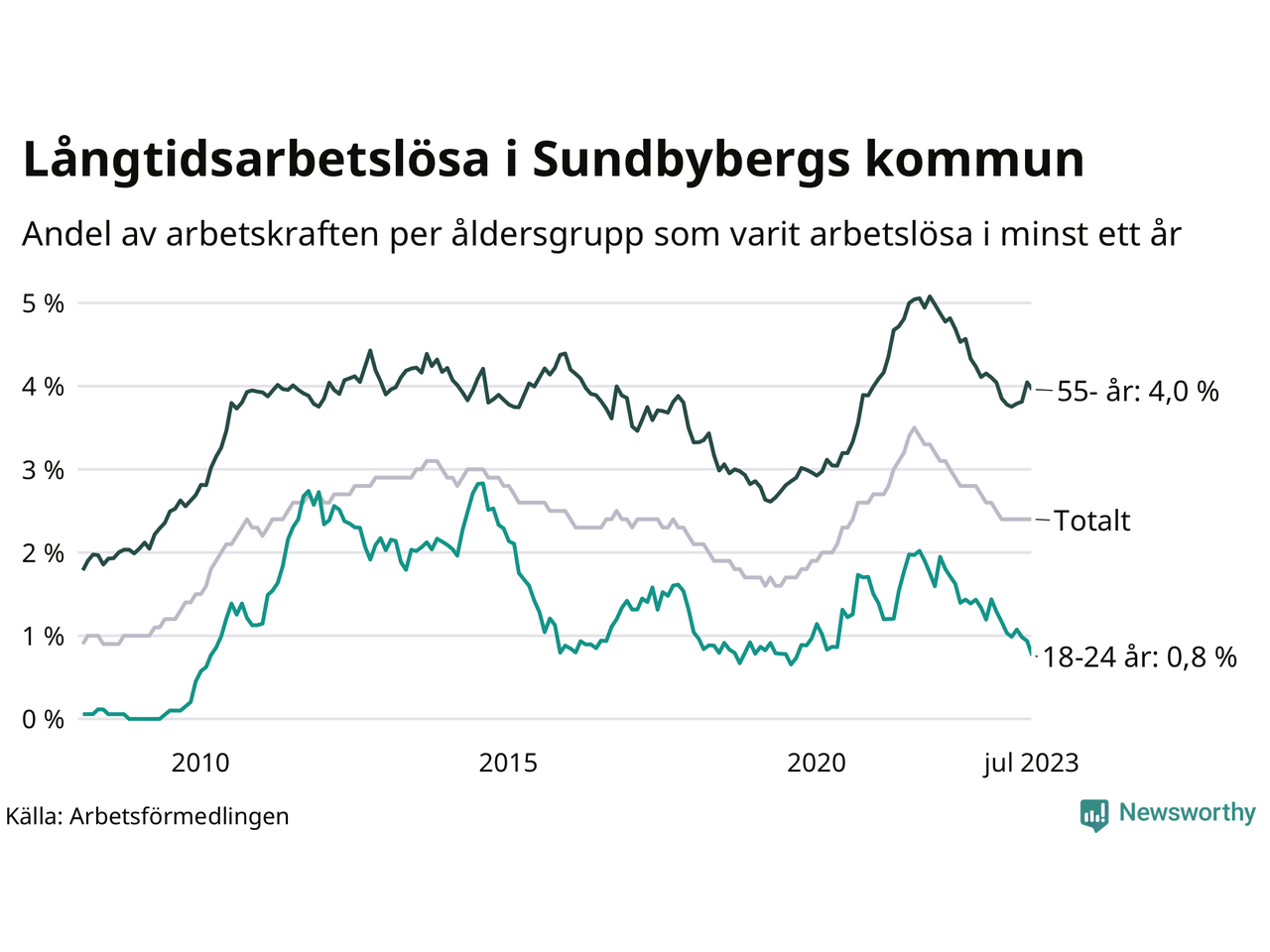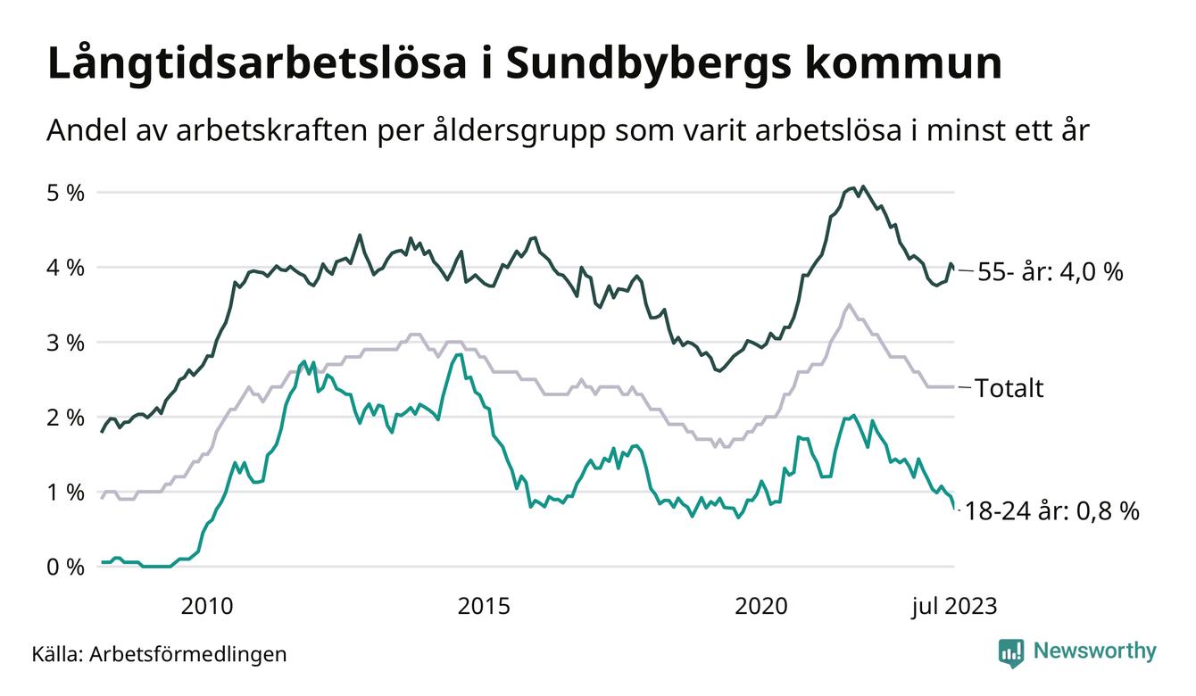 Av de 747 personerna som varit arbetslösa i mer än ett år i Sundbybergs kommun är 184 personer mellan 55 och 651 år och 17 är mellan 18 och 24 år. För den äldre gruppen är andelen arbetslösa 4,0 procent medan den i den yngre gruppen är 0,8 procent. Även i riket som helhet är långtidsarbetslösheten högre i gruppen äldre.