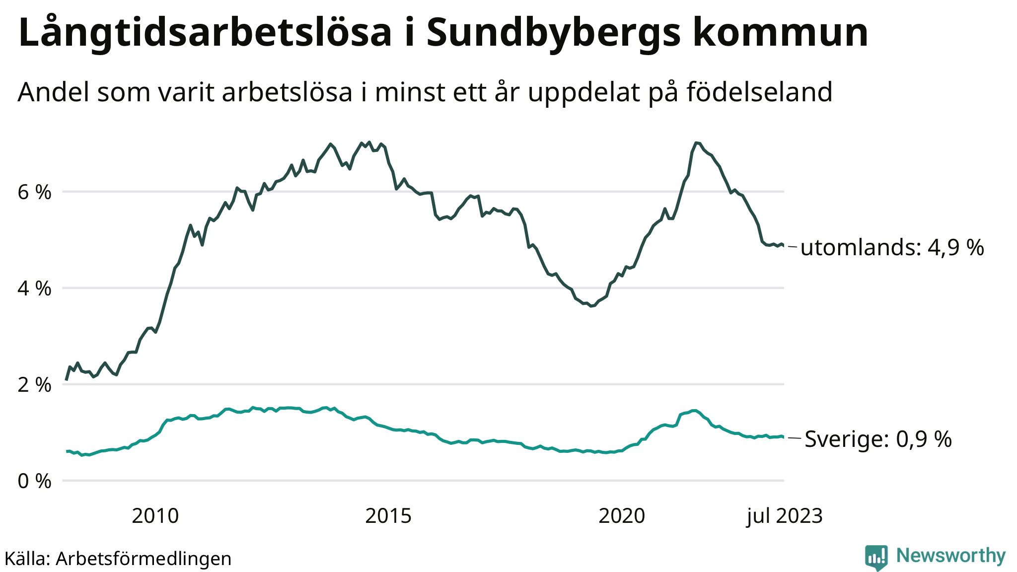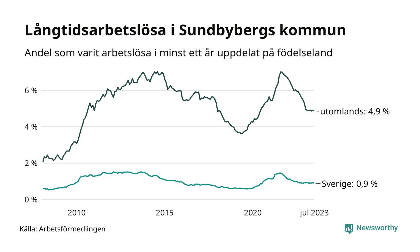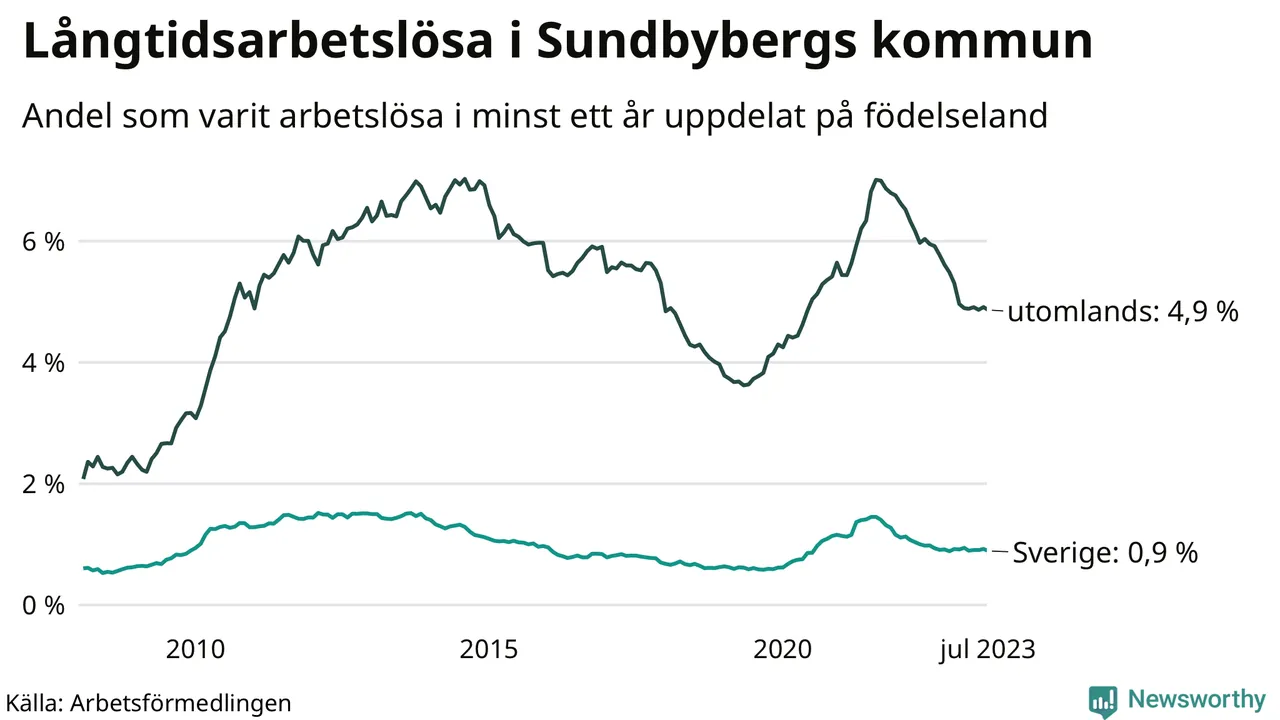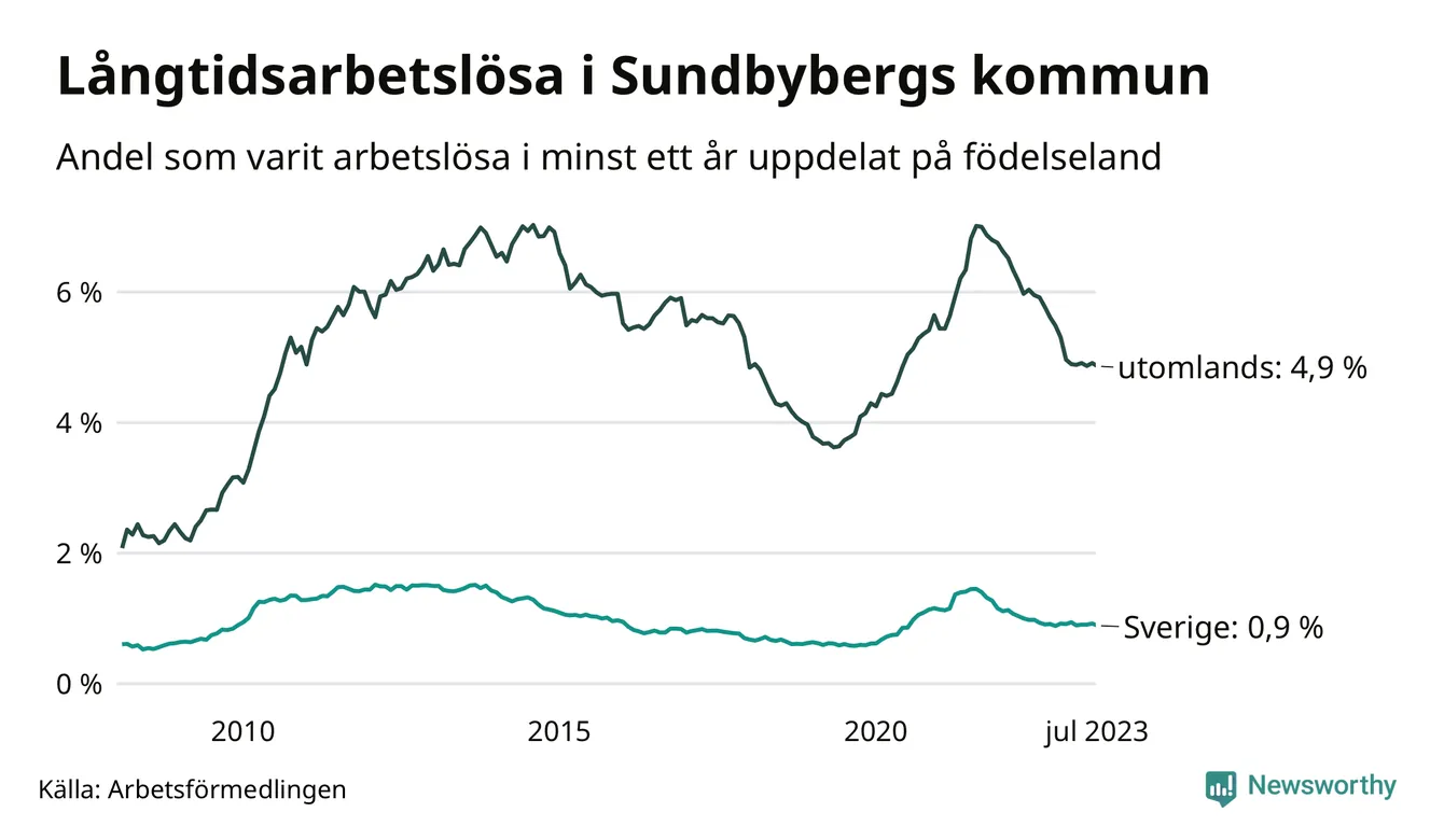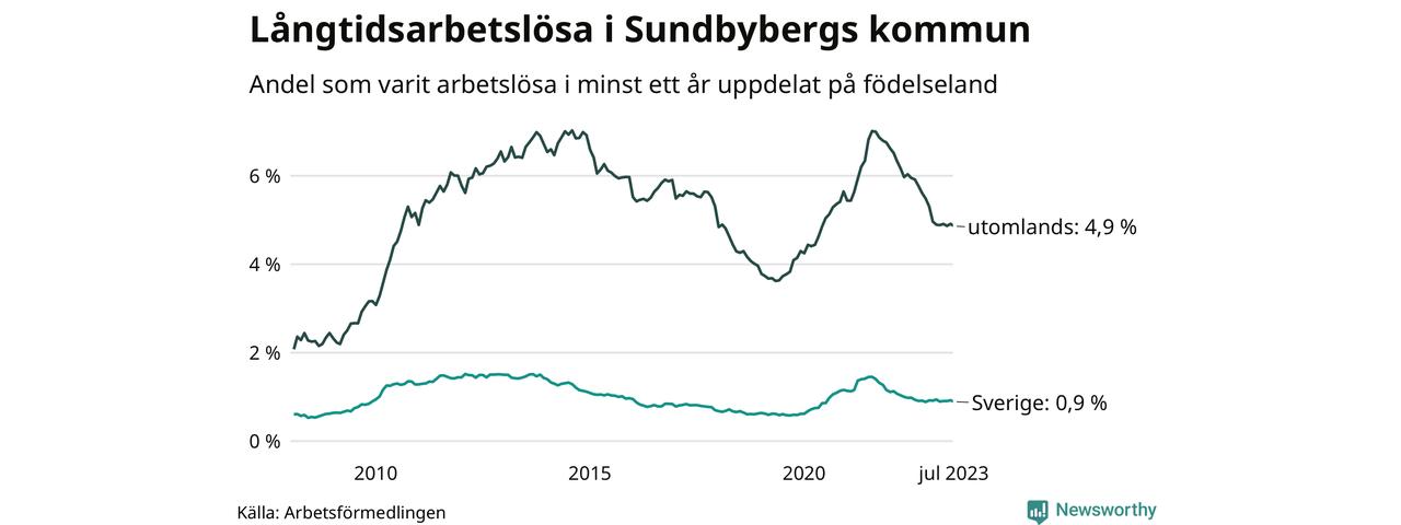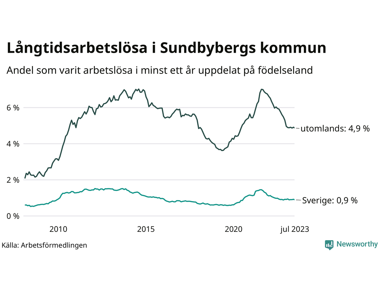 176 av de långtidsarbetslösa i Sundbyberg är födda i Sverige, medan 571 är födda utomlands. Det innebär att långtidsarbetslösheten bland Sverigefödda är 0,9 procent, medan den är fem gånger så hög – 4,9 procent – bland födda utomlands. Även i riket som helhet är arbetslösheten högre bland utrikesfödda.