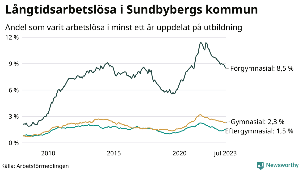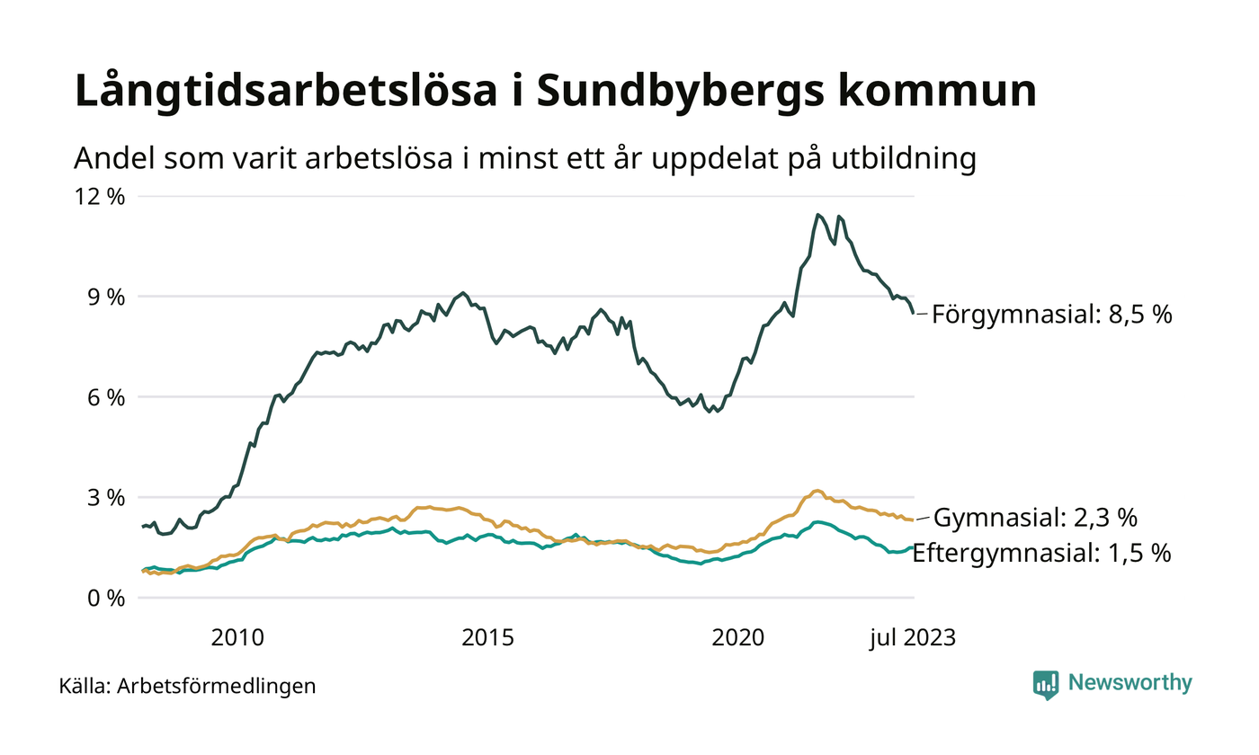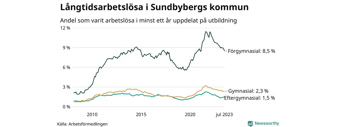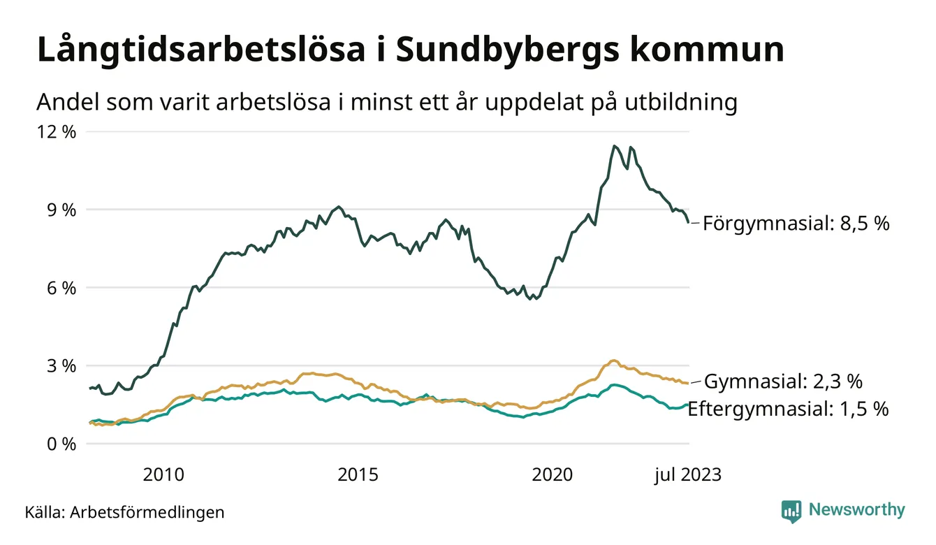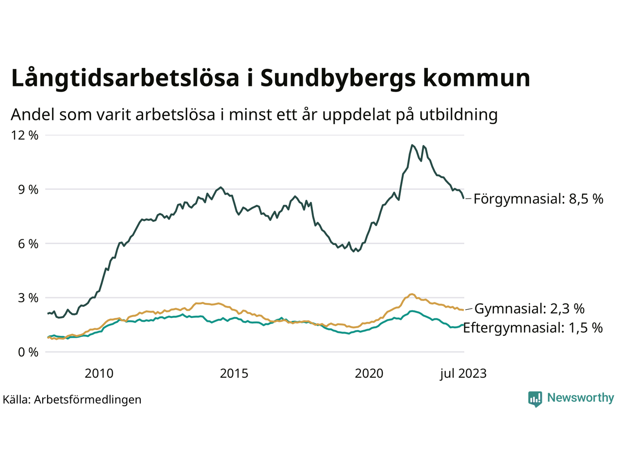 Graf över andel långtidsarbetslösa i Sundbyberg uppdelat på utbildningsnivå