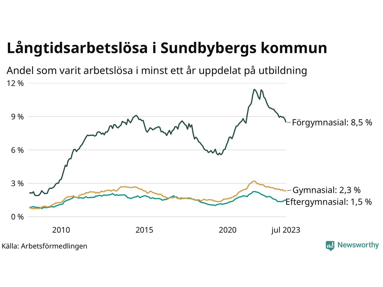 Graf: Andel arbetslösa i Sundbyberg som varit utan arbete i minst 12 månader