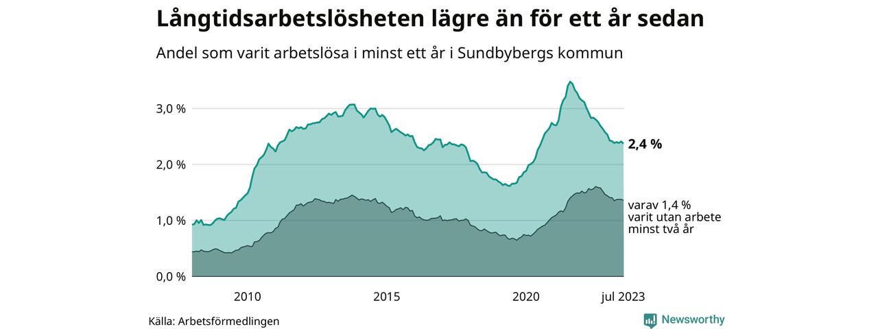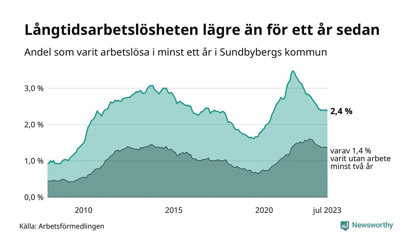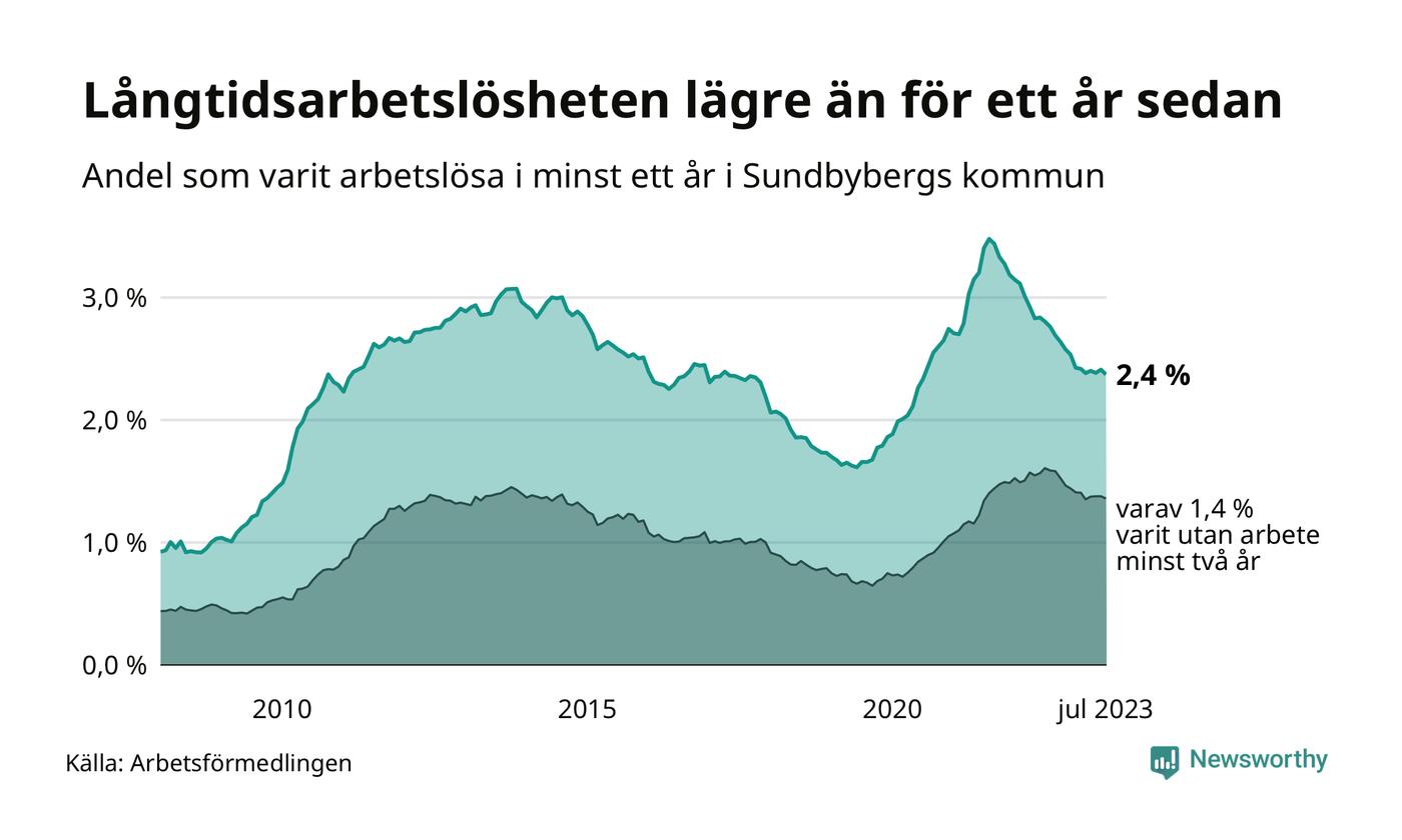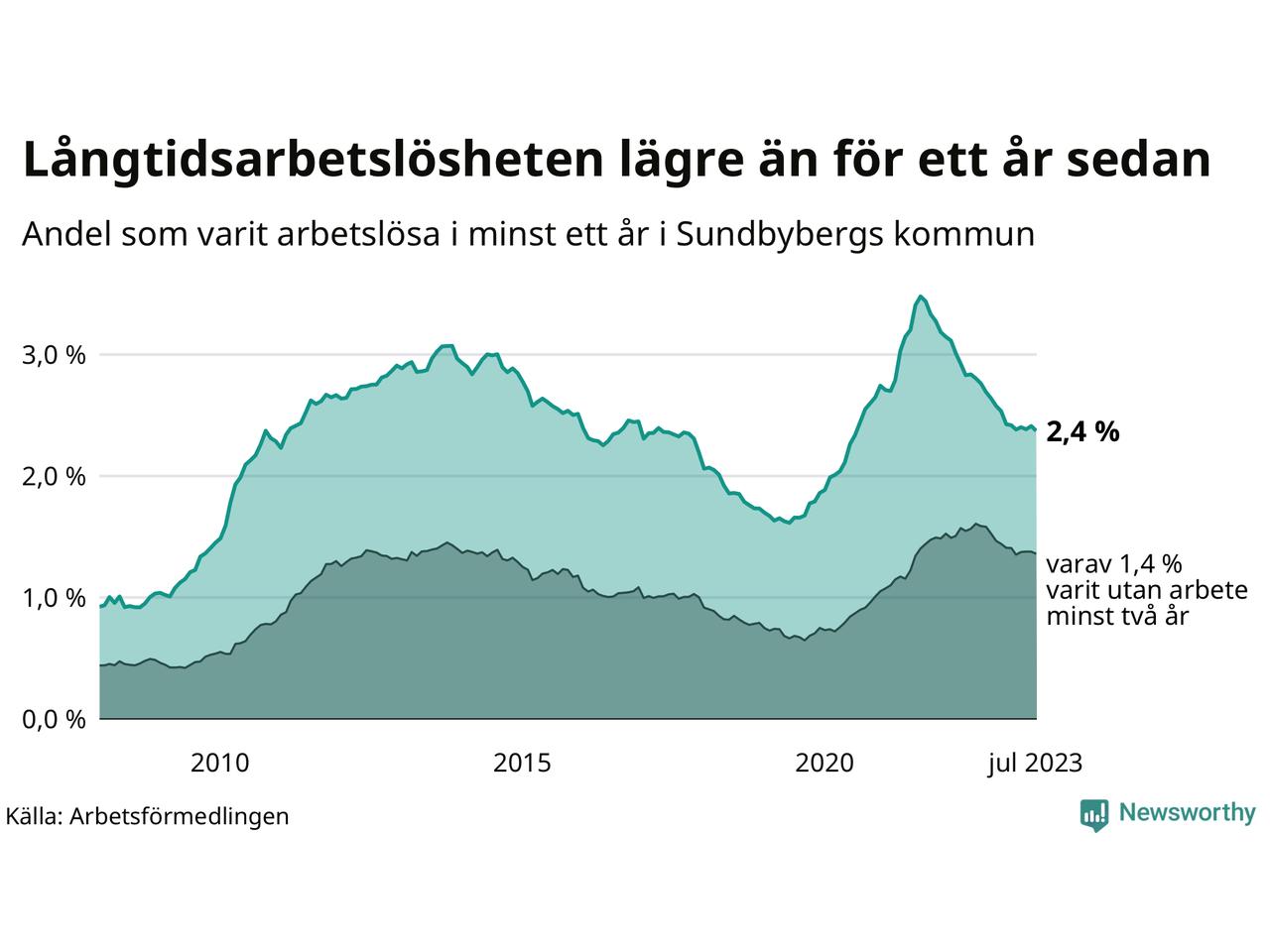I juli hade 747 Sundbybergsbor varit arbetslösa i minst ett år, vilket är elva färre än månaden innan. 747 personer motsvarar 2,4 procent av arbetskraften i kommunen – andelen långtidsarbetslösa är 0,4 procentenheter lägre än samma månad för ett år sedan.