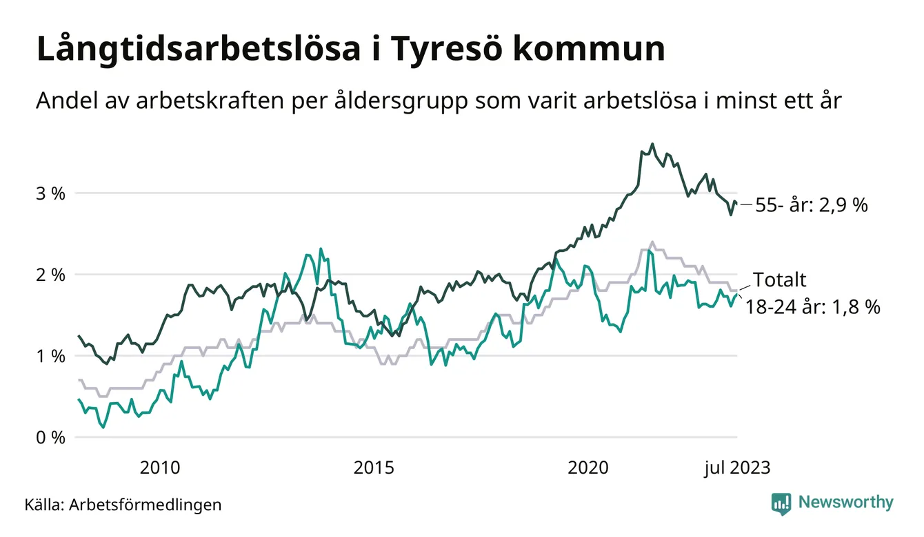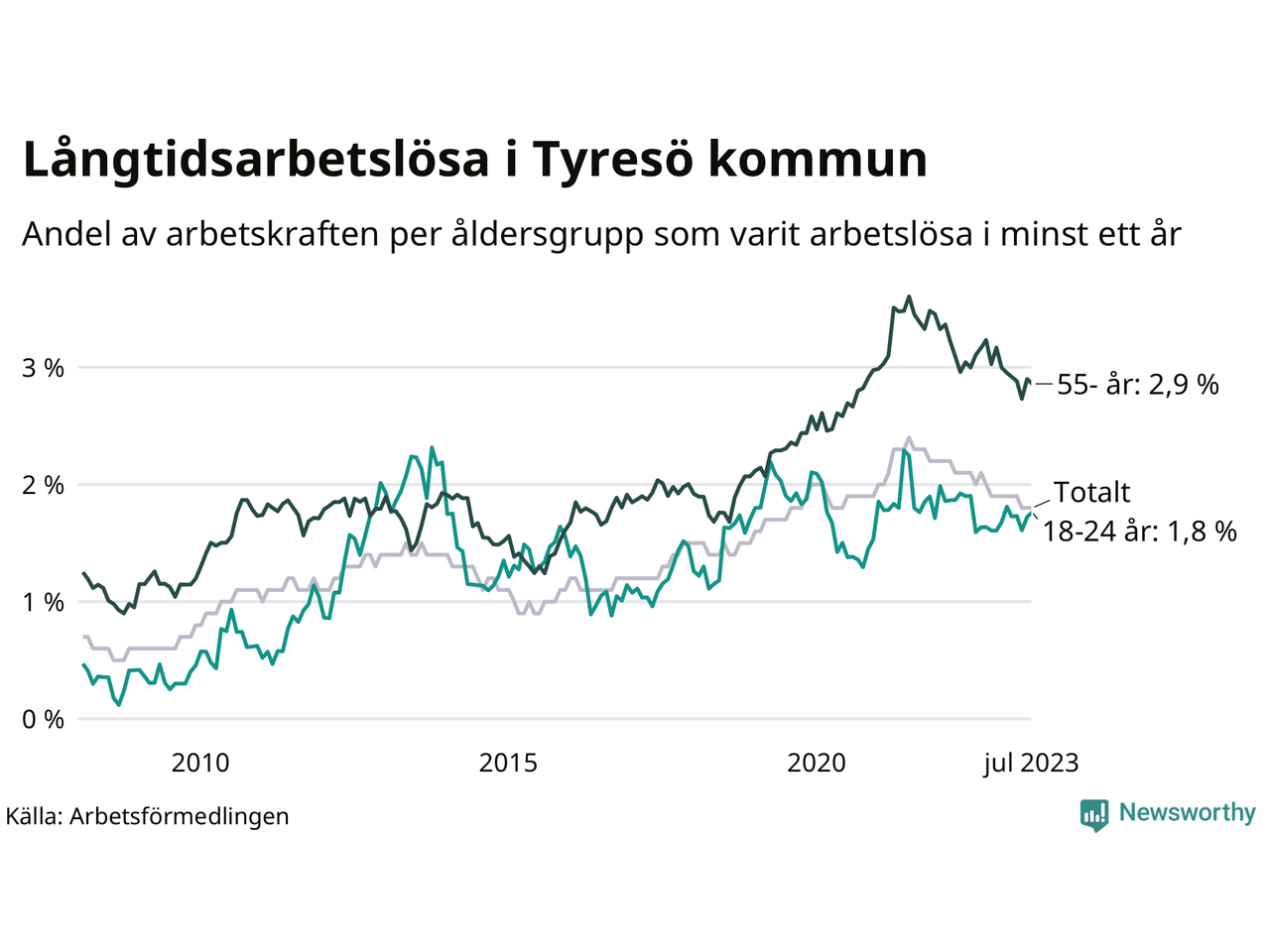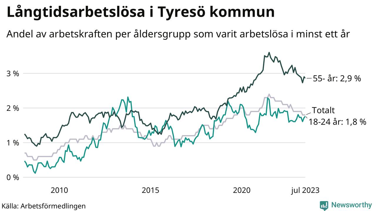 Av de 454 personerna som varit arbetslösa i mer än ett år i Tyresö kommun är 150 personer mellan 55 och 651 år och 41 är mellan 18 och 24 år. För den äldre gruppen är andelen arbetslösa 2,9 procent medan den i den yngre gruppen är 1,8 procent. Även i riket som helhet är långtidsarbetslösheten högre i gruppen äldre.
