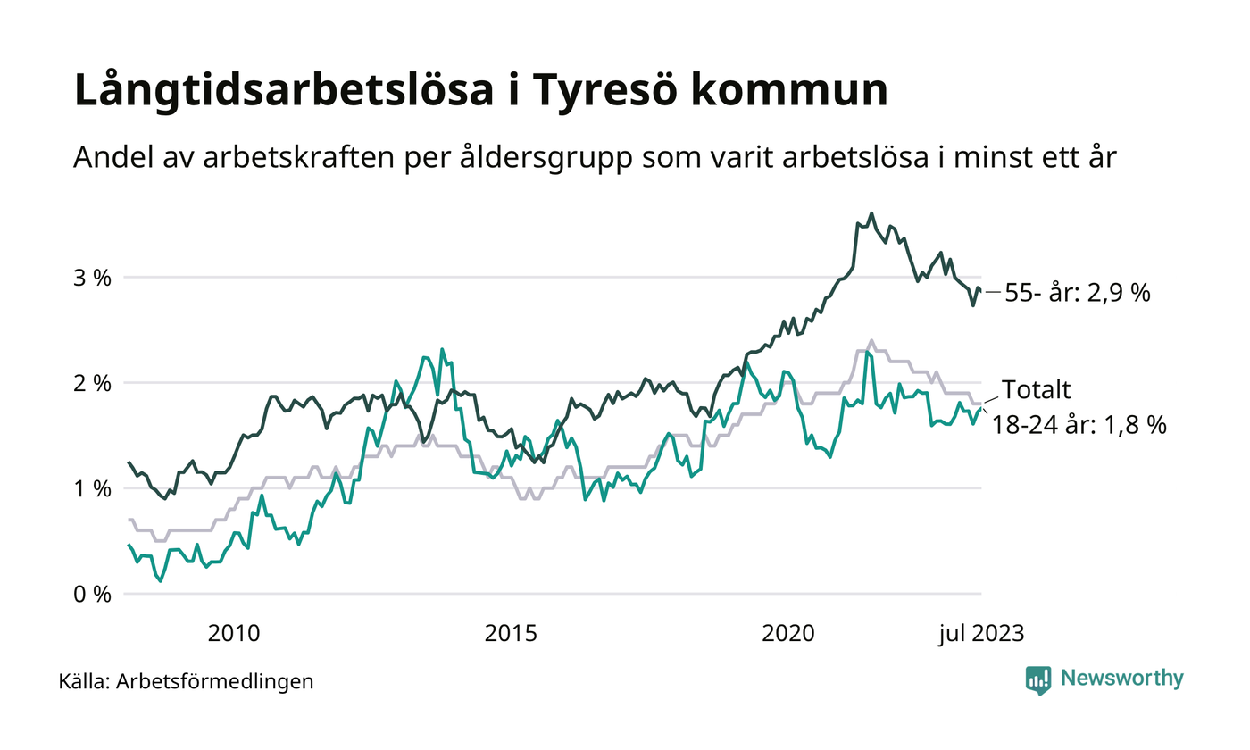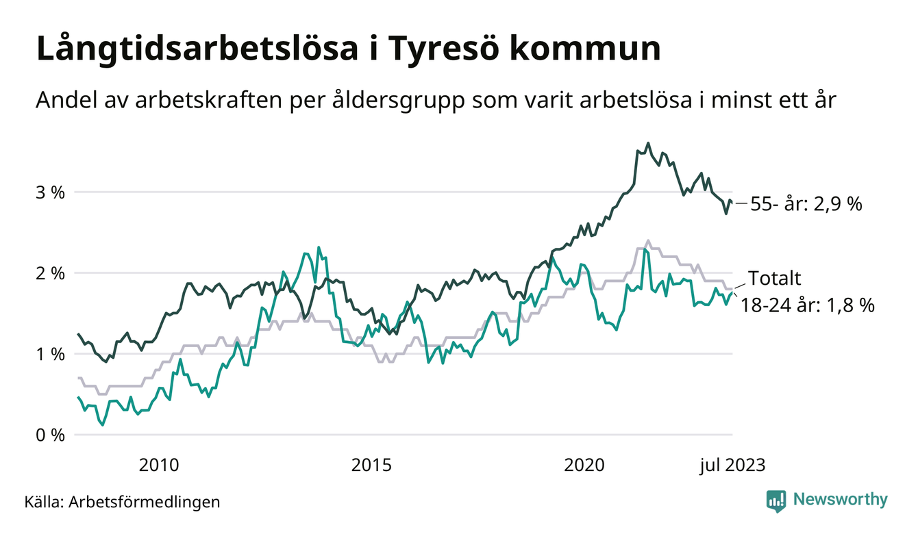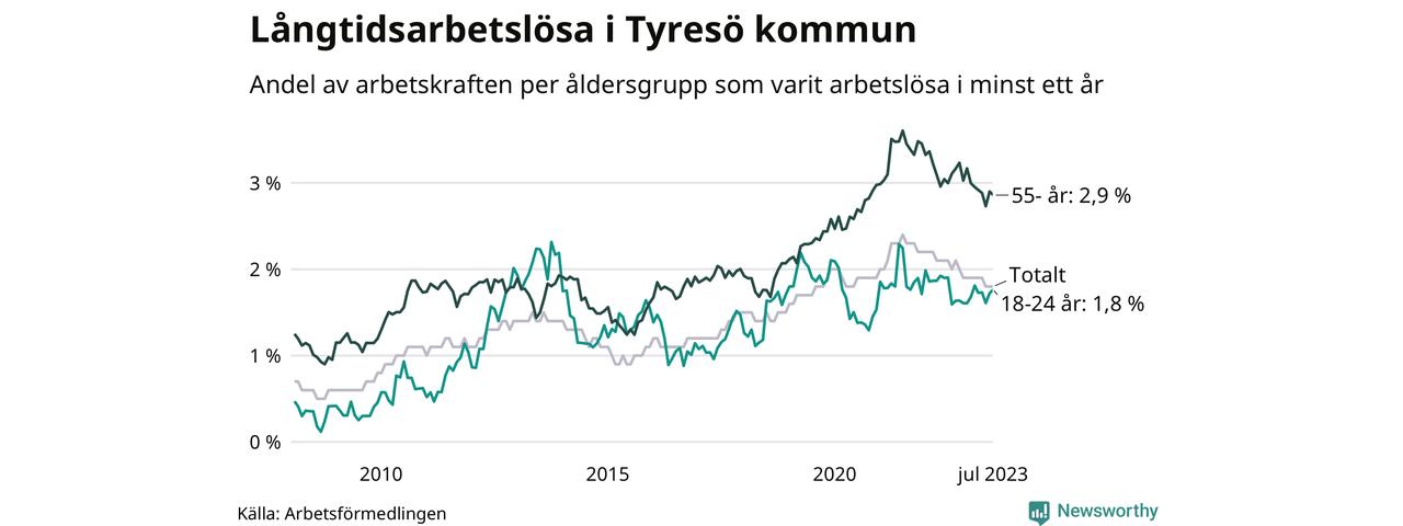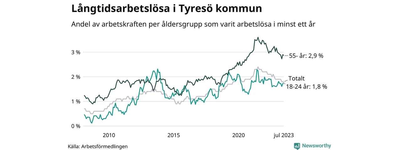 Av de 454 personerna som varit arbetslösa i mer än ett år i Tyresö kommun är 150 personer mellan 55 och 651 år och 41 är mellan 18 och 24 år. För den äldre gruppen är andelen arbetslösa 2,9 procent medan den i den yngre gruppen är 1,8 procent. Även i riket som helhet är långtidsarbetslösheten högre i gruppen äldre.