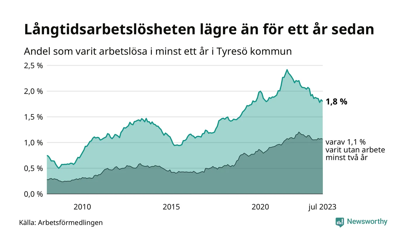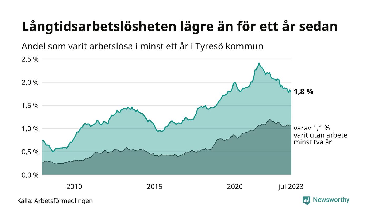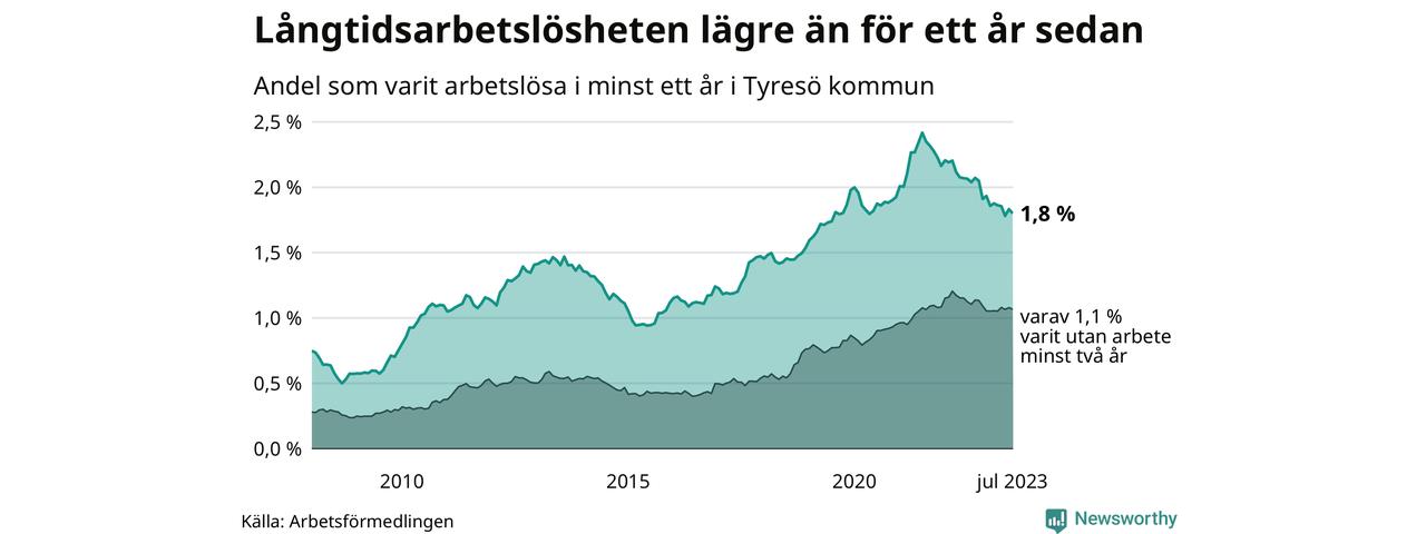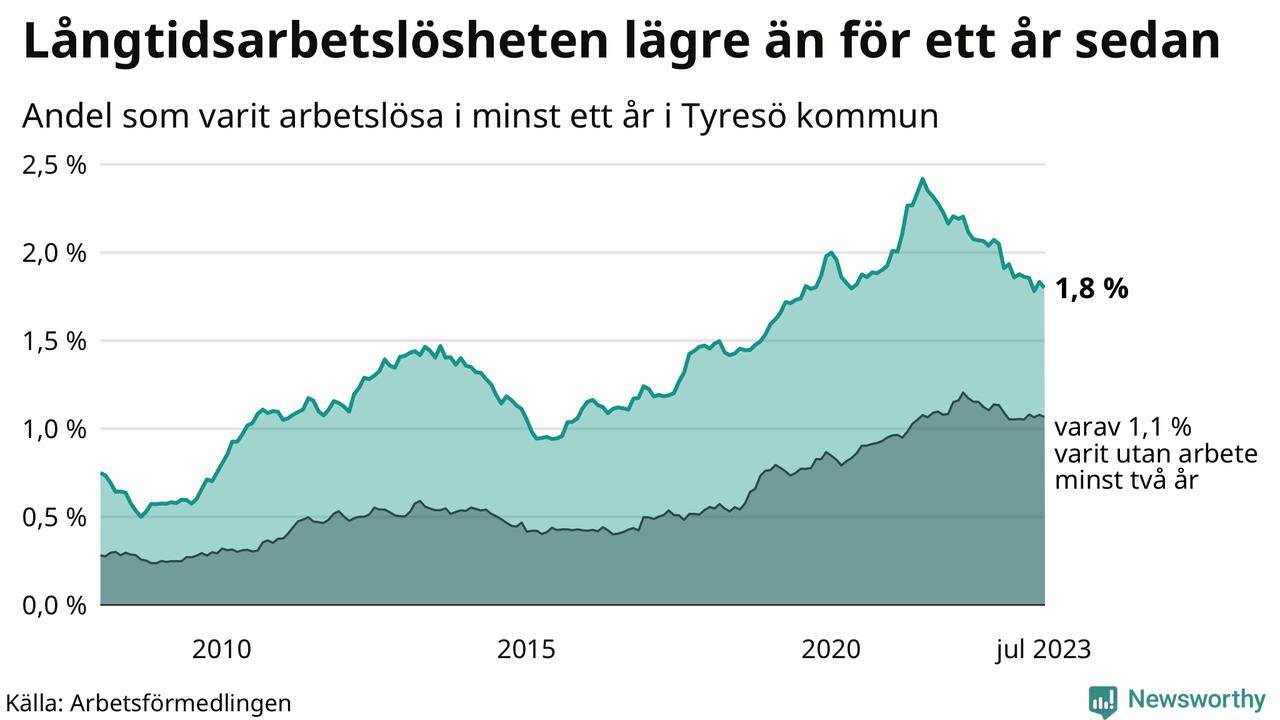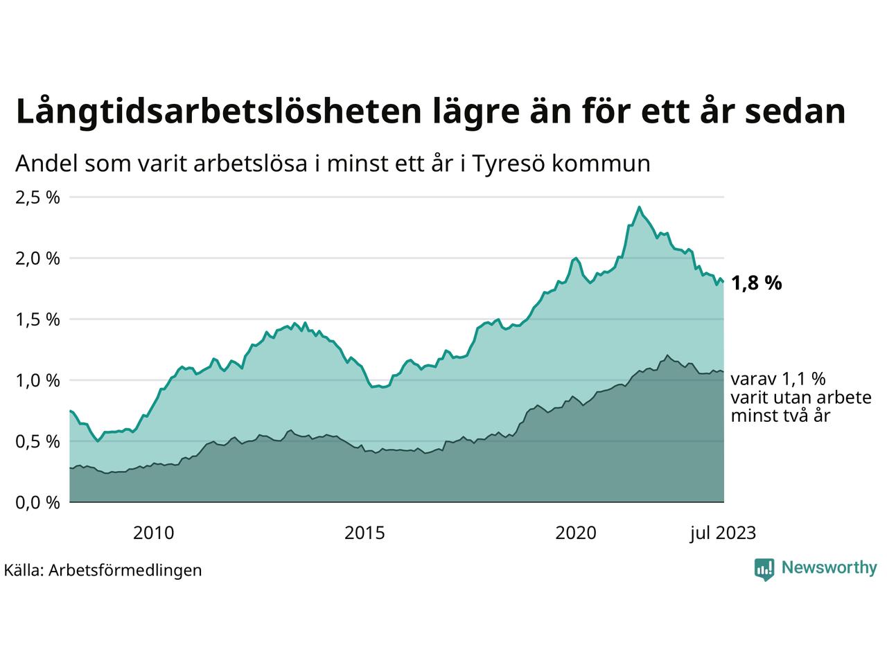 I juli hade 454 Tyresöbor varit arbetslösa i minst ett år, vilket är åtta färre än månaden innan. 454 personer motsvarar 1,8 procent av arbetskraften i kommunen – andelen långtidsarbetslösa är 0,3 procentenheter lägre än samma månad för ett år sedan.