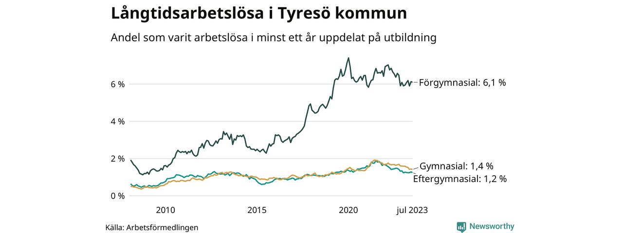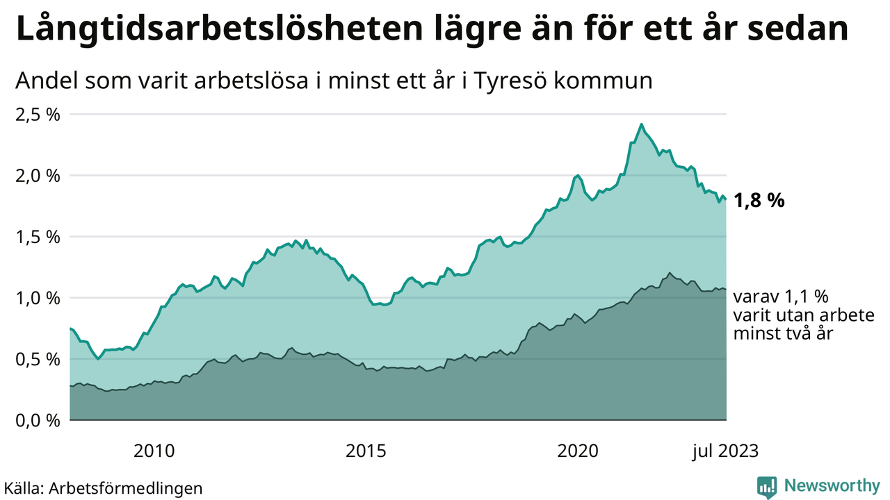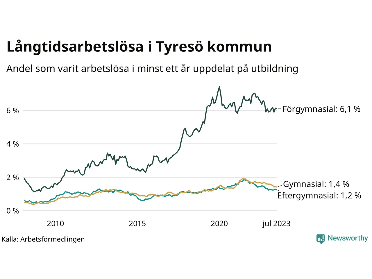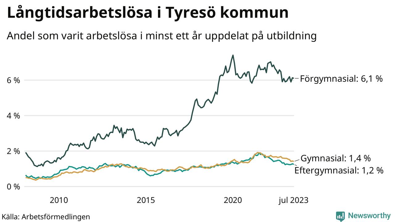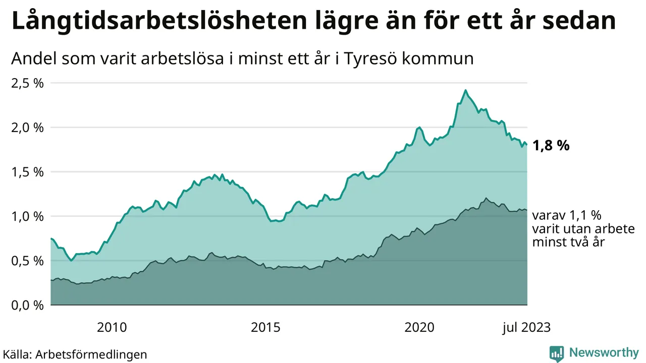I juli hade 454 Tyresöbor varit arbetslösa i minst ett år, vilket är åtta färre än månaden innan. 454 personer motsvarar 1,8 procent av arbetskraften i kommunen – andelen långtidsarbetslösa är 0,3 procentenheter lägre än samma månad för ett år sedan.