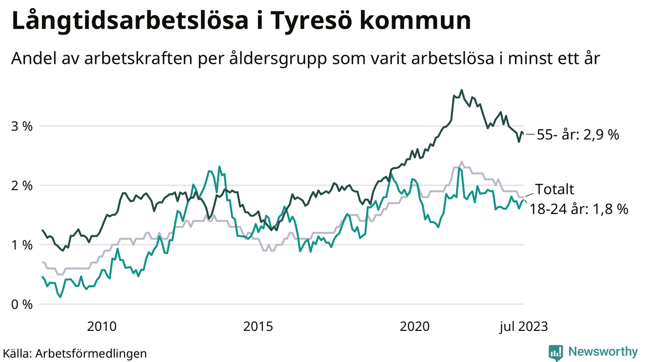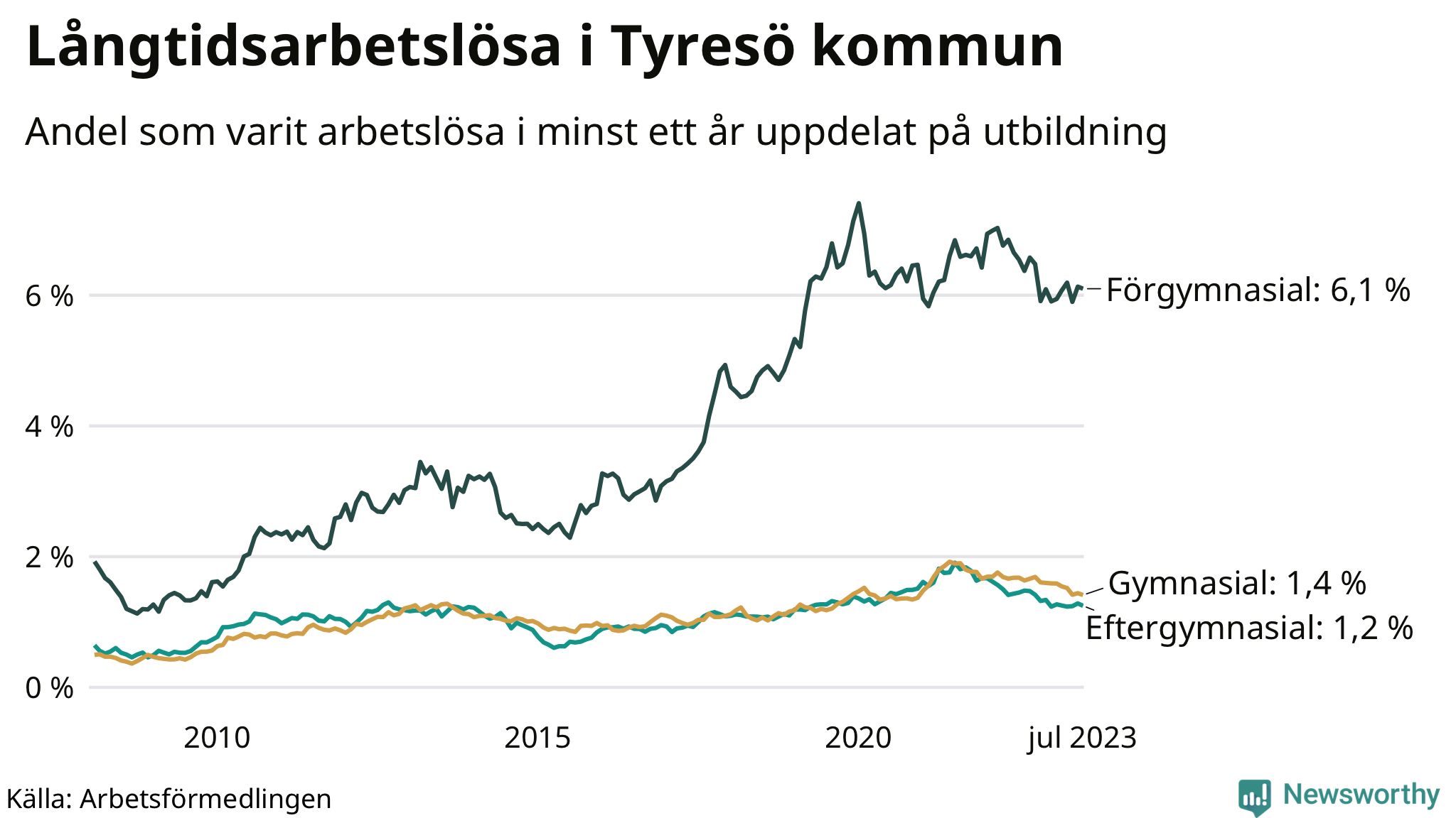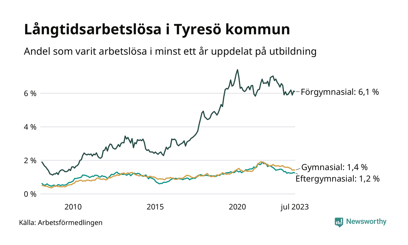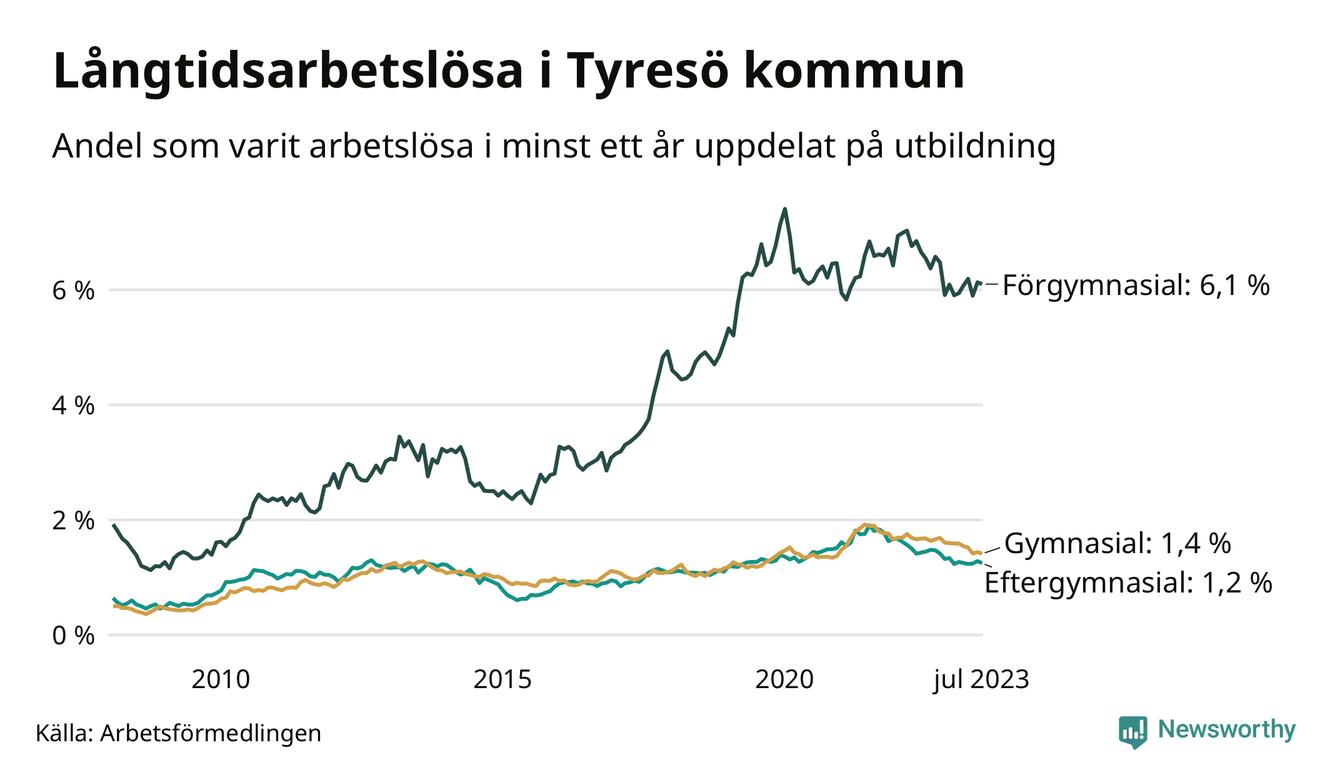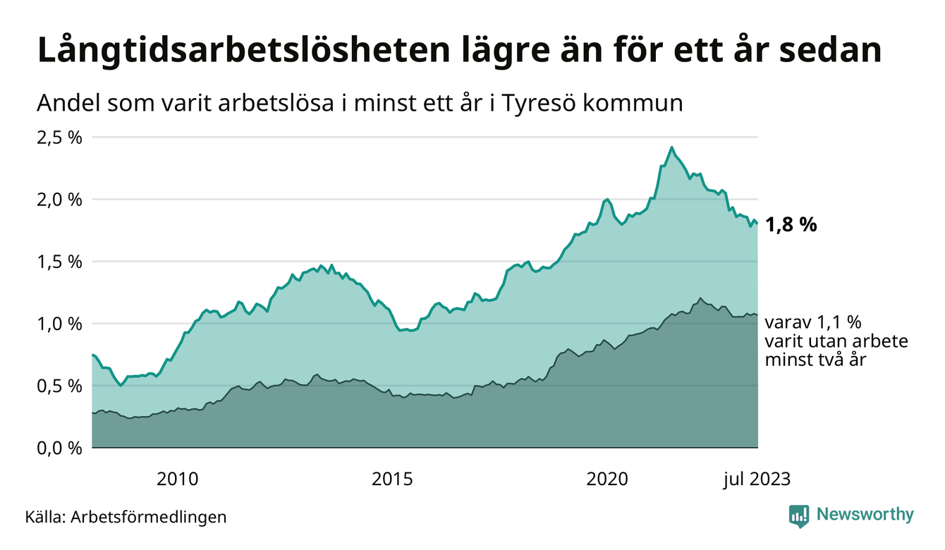 I juli hade 454 Tyresöbor varit arbetslösa i minst ett år, vilket är åtta färre än månaden innan. 454 personer motsvarar 1,8 procent av arbetskraften i kommunen – andelen långtidsarbetslösa är 0,3 procentenheter lägre än samma månad för ett år sedan.