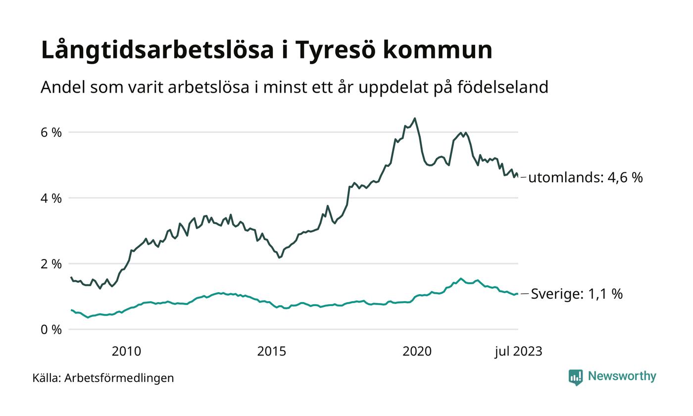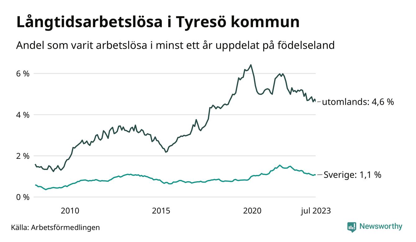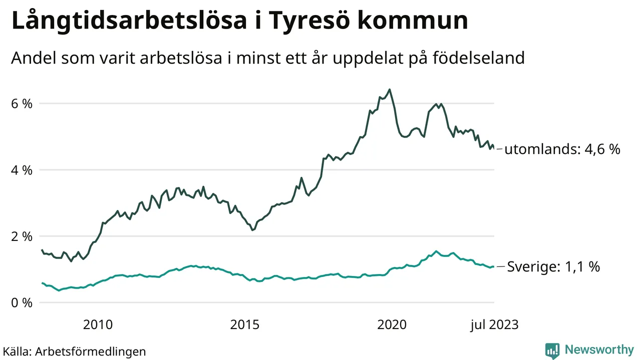 216 av de långtidsarbetslösa i Tyresö är födda i Sverige, medan 238 är födda utomlands. Det innebär att långtidsarbetslösheten bland Sverigefödda är 1,1 procent, medan den är fyra gånger så hög – 4,6 procent – bland födda utomlands. Även i riket som helhet är arbetslösheten högre bland utrikesfödda.