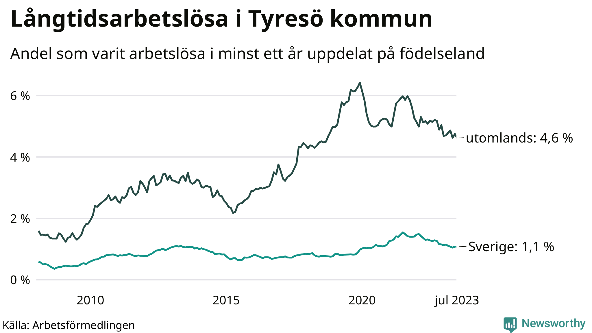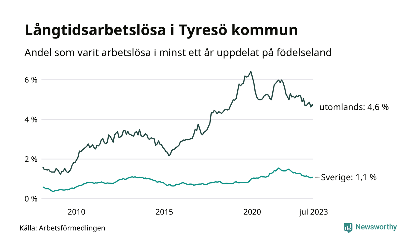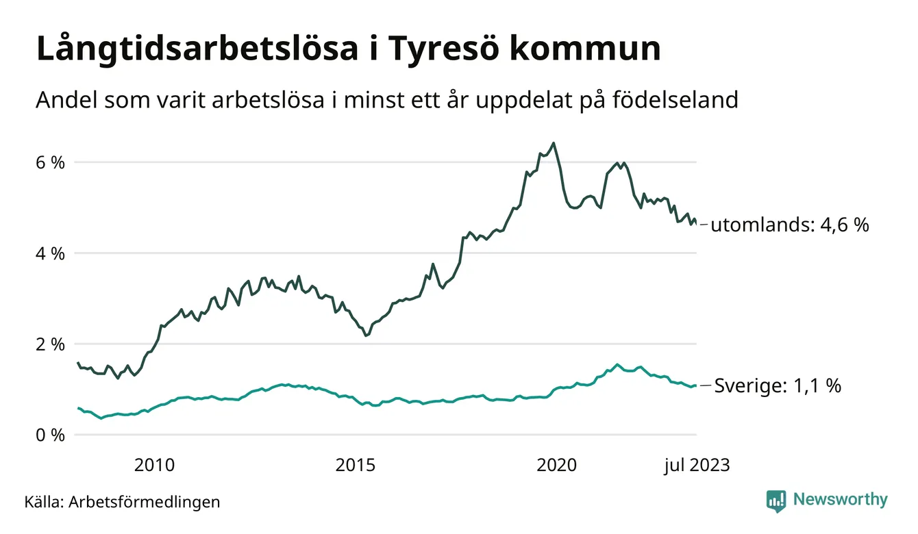 216 av de långtidsarbetslösa i Tyresö är födda i Sverige, medan 238 är födda utomlands. Det innebär att långtidsarbetslösheten bland Sverigefödda är 1,1 procent, medan den är fyra gånger så hög – 4,6 procent – bland födda utomlands. Även i riket som helhet är arbetslösheten högre bland utrikesfödda.
