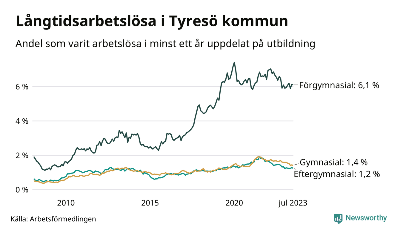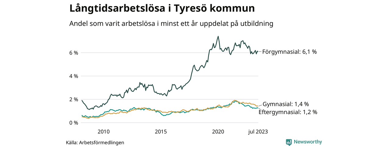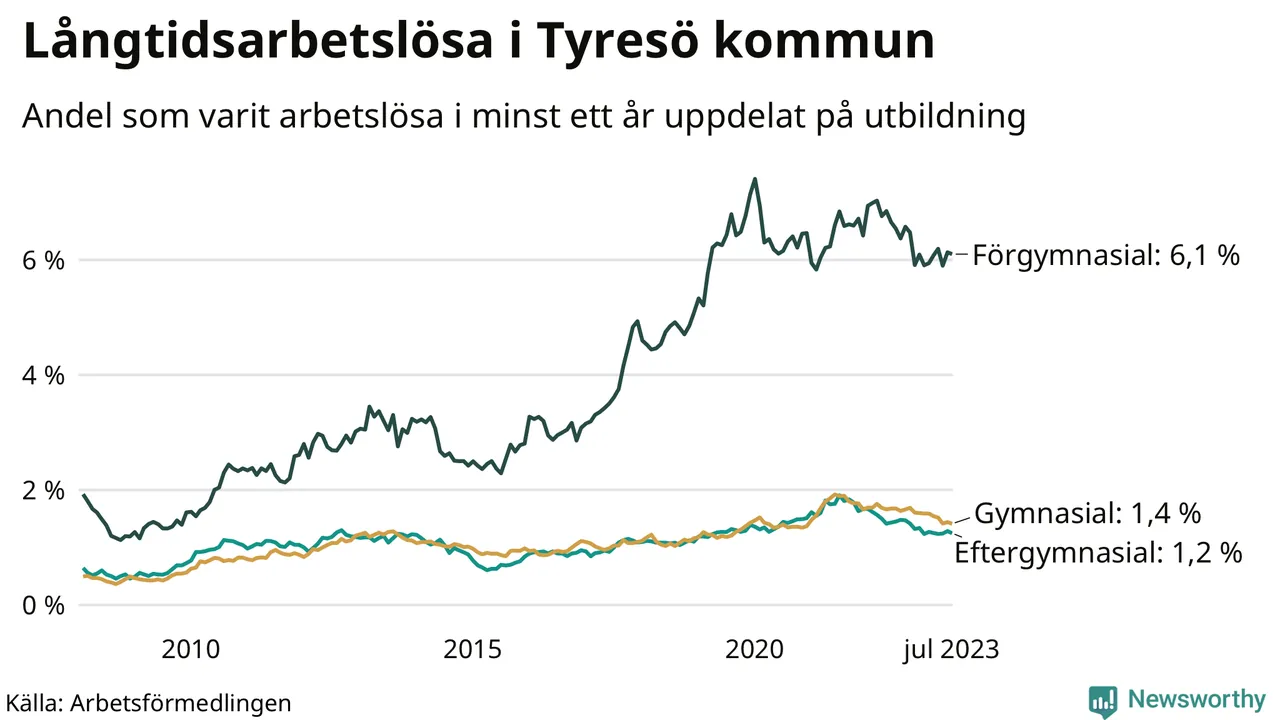Andelen som varit utan arbete i minst ett år i Tyresö var lägre i juli jämfört med samma månad för ett år sedan. Det visar Arbetsfömedlingens senaste månadsstatistik.