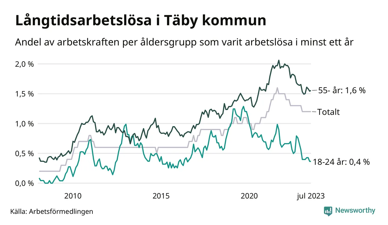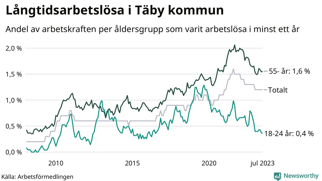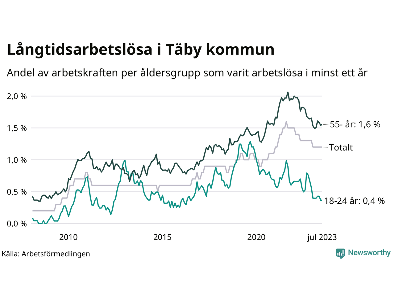 Av de 436 personerna som varit arbetslösa i mer än ett år i Täby kommun är 118 personer mellan 55 och 651 år och tolv är mellan 18 och 24 år. För den äldre gruppen är andelen arbetslösa 1,6 procent medan den i den yngre gruppen är 0,4 procent. Även i riket som helhet är långtidsarbetslösheten högre i gruppen äldre.