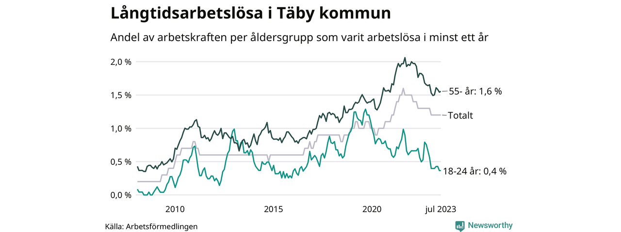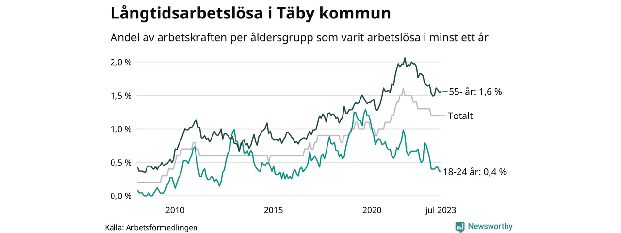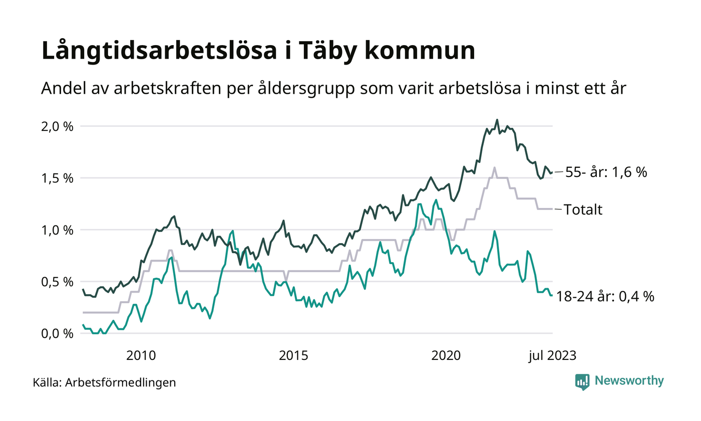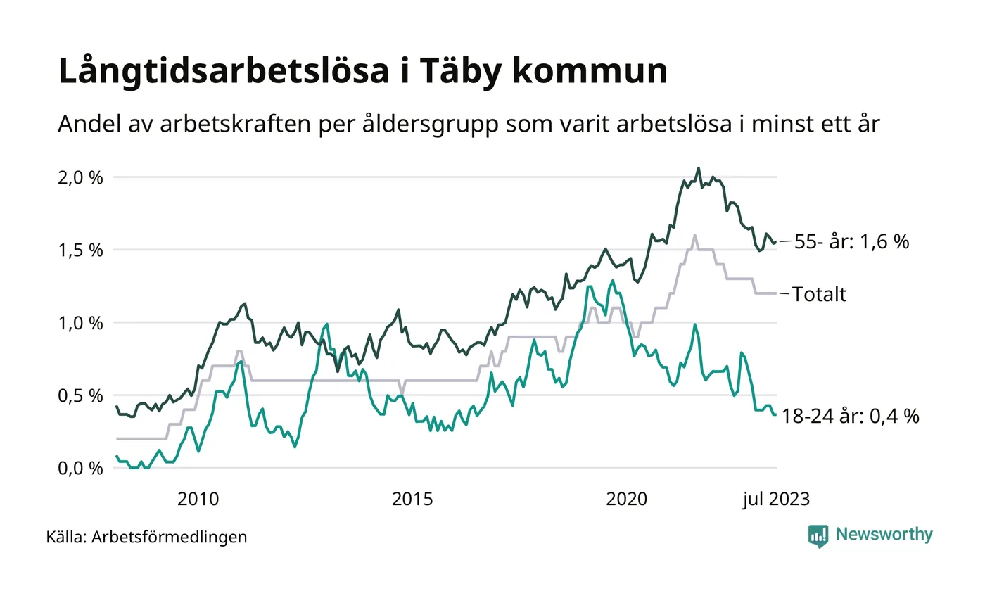 Av de 436 personerna som varit arbetslösa i mer än ett år i Täby kommun är 118 personer mellan 55 och 651 år och tolv är mellan 18 och 24 år. För den äldre gruppen är andelen arbetslösa 1,6 procent medan den i den yngre gruppen är 0,4 procent. Även i riket som helhet är långtidsarbetslösheten högre i gruppen äldre.
