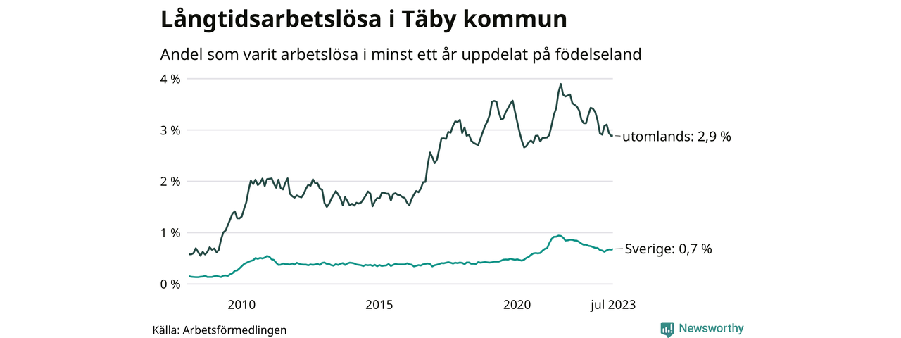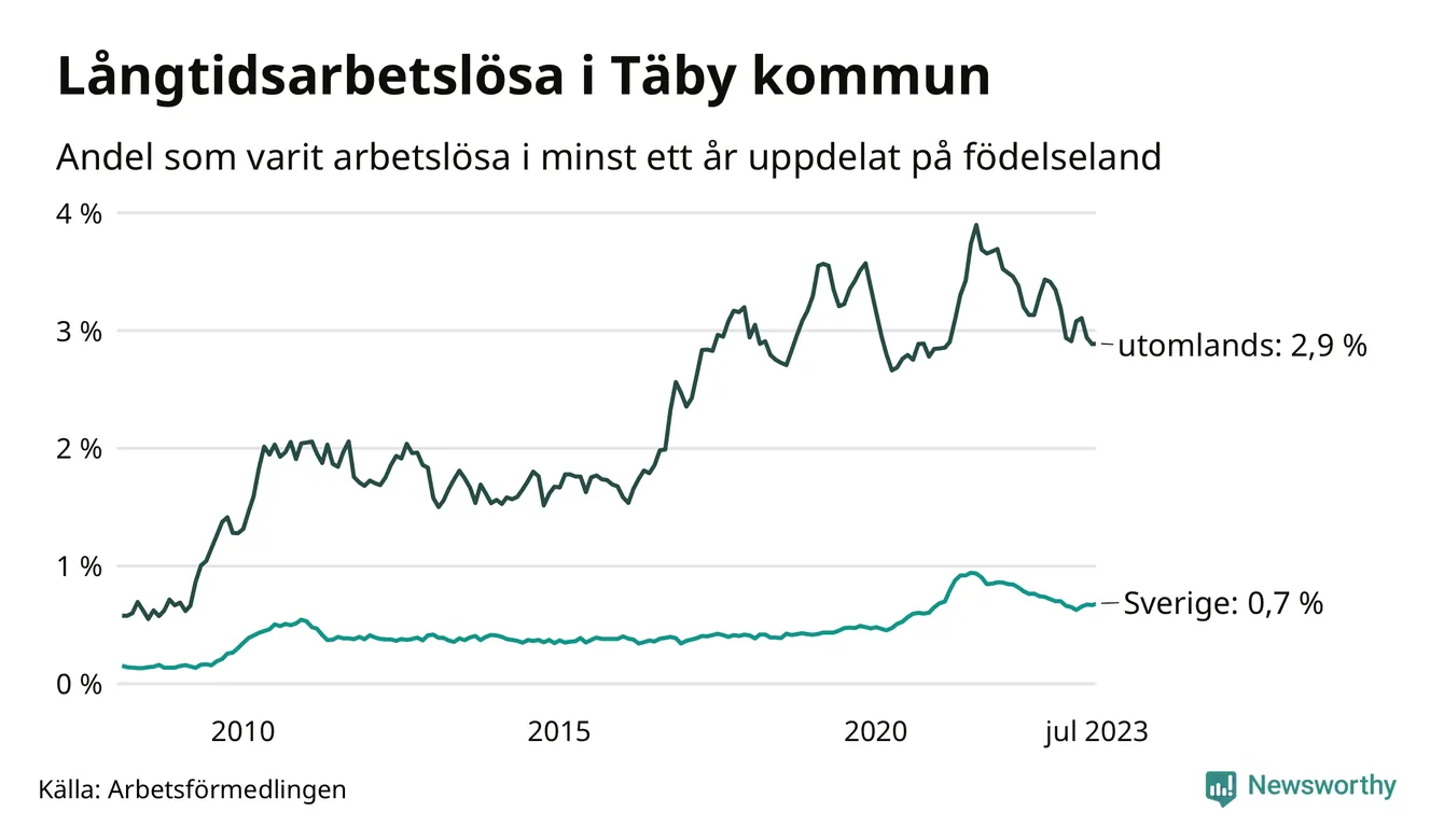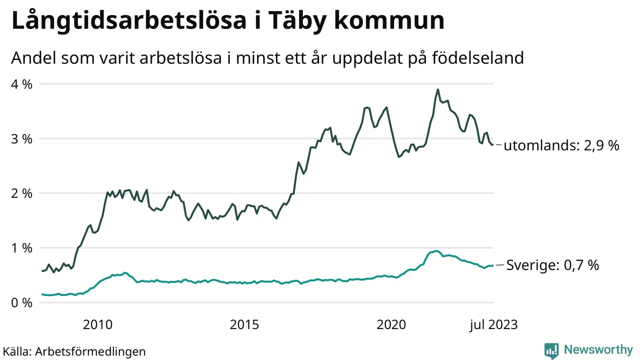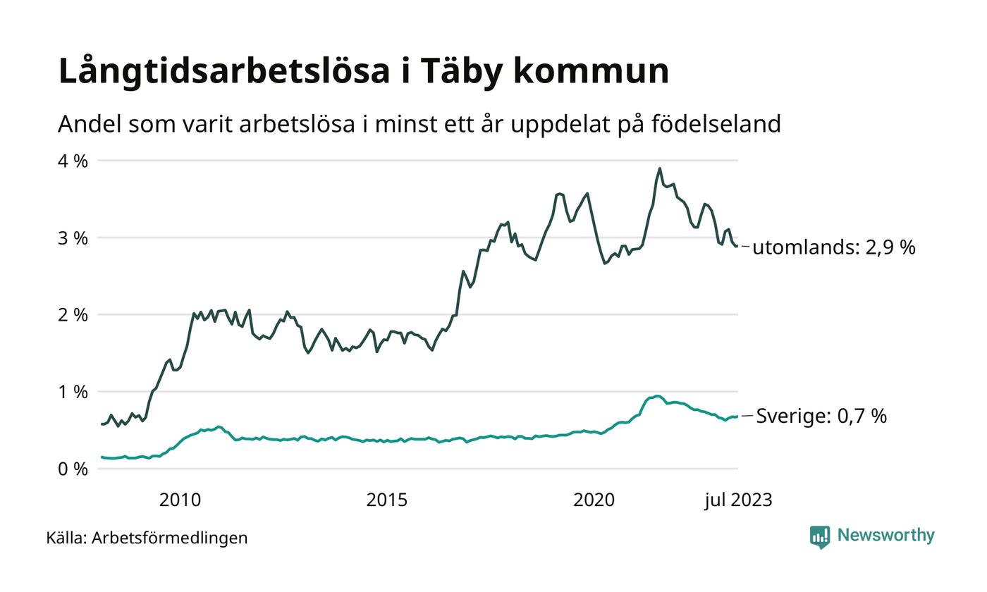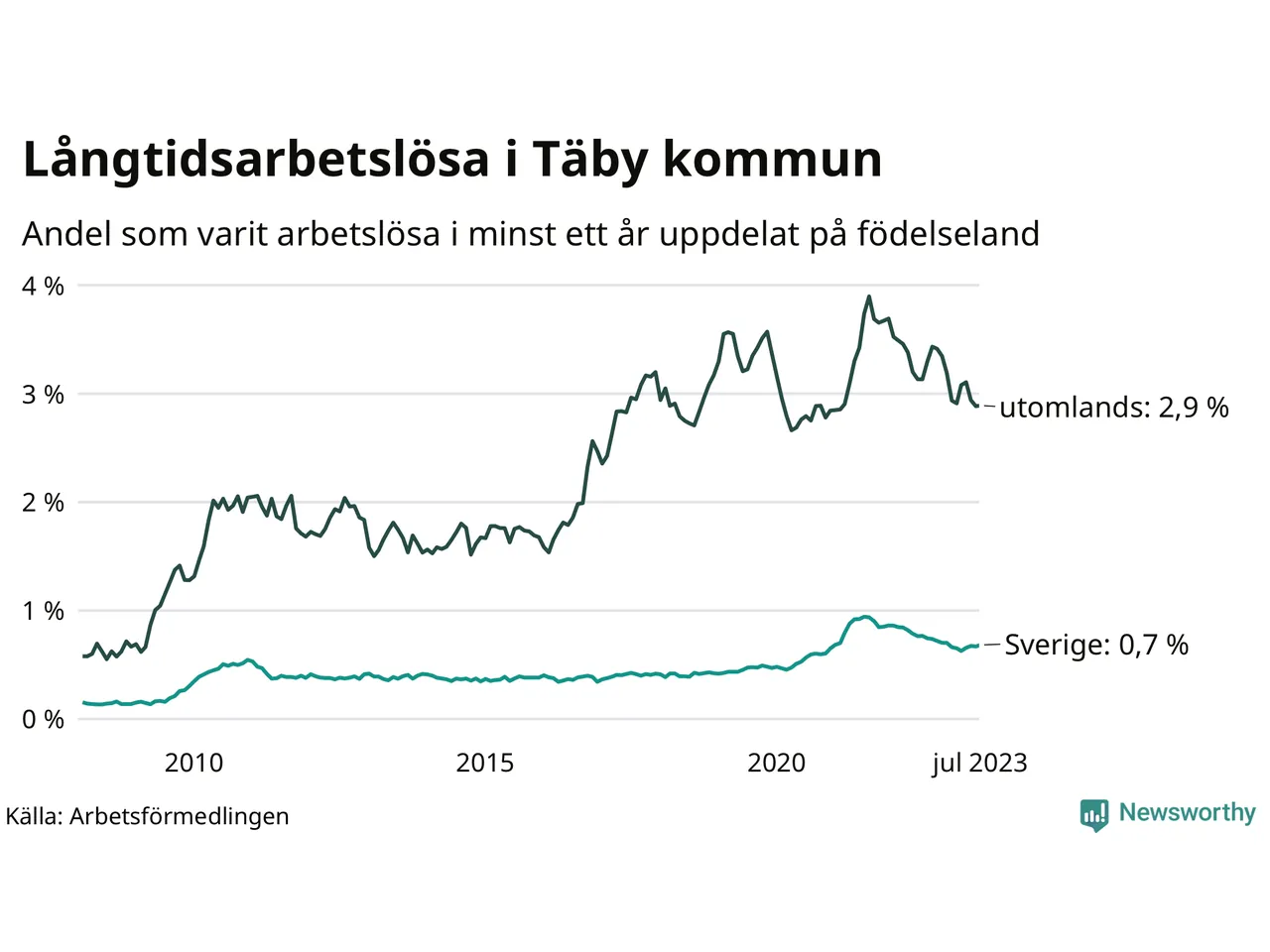 193 av de långtidsarbetslösa i Täby är födda i Sverige, medan 243 är födda utomlands. Det innebär att långtidsarbetslösheten bland Sverigefödda är 0,7 procent, medan den är fyra gånger så hög – 2,9 procent – bland födda utomlands. Även i riket som helhet är arbetslösheten högre bland utrikesfödda.
