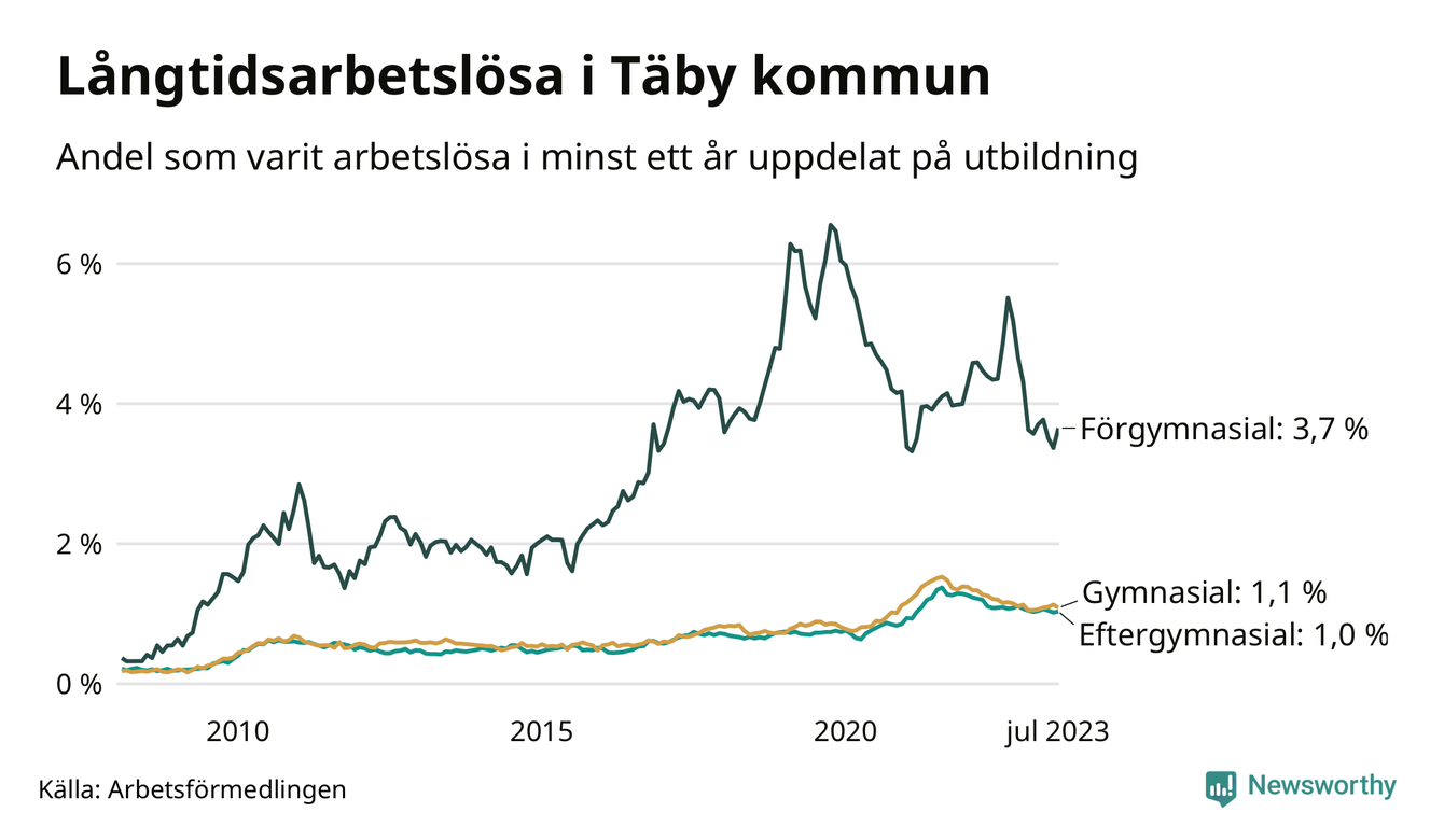 | Andel arbetslösa i minst två år | 0,6 % | 1,5 % | 1,6 % |