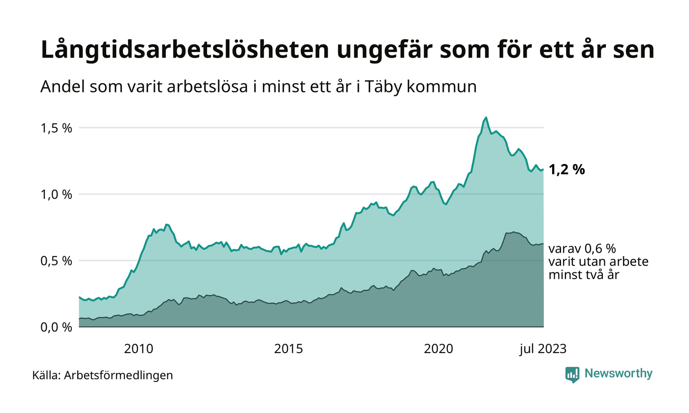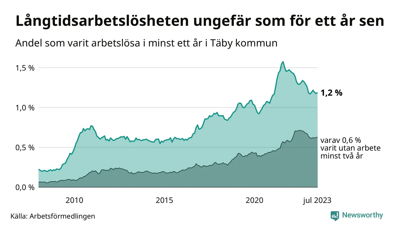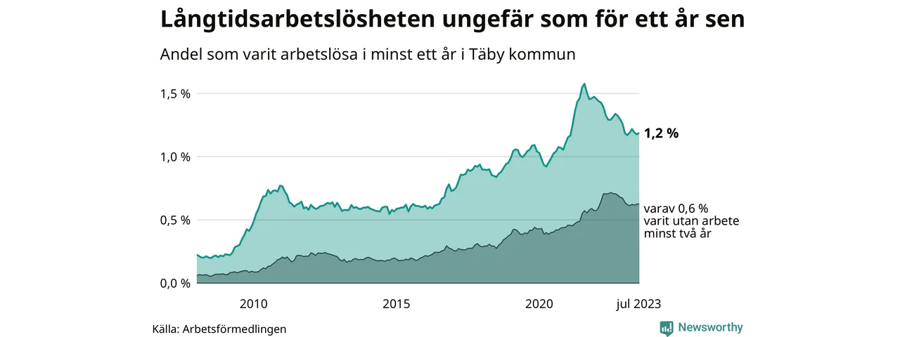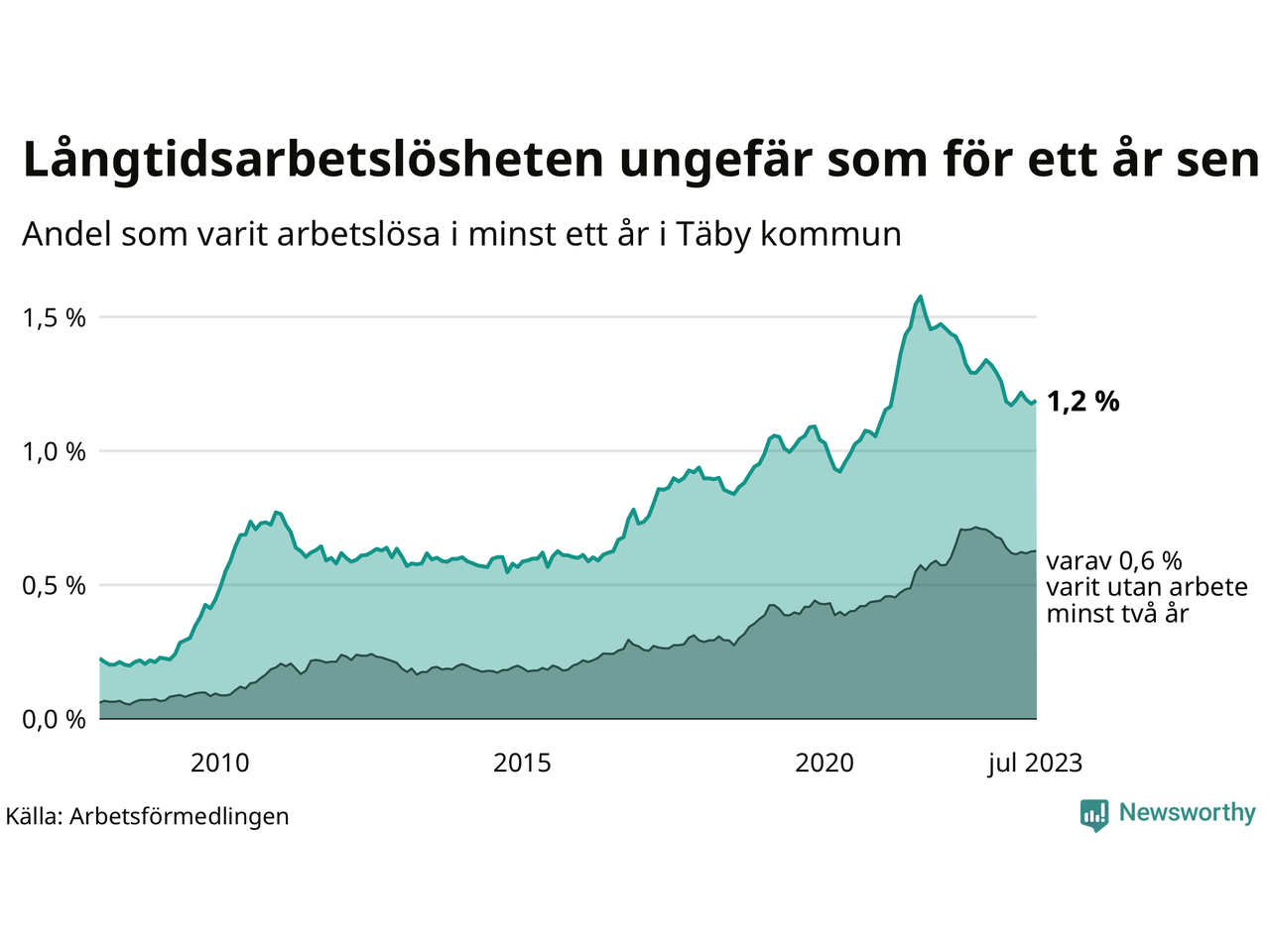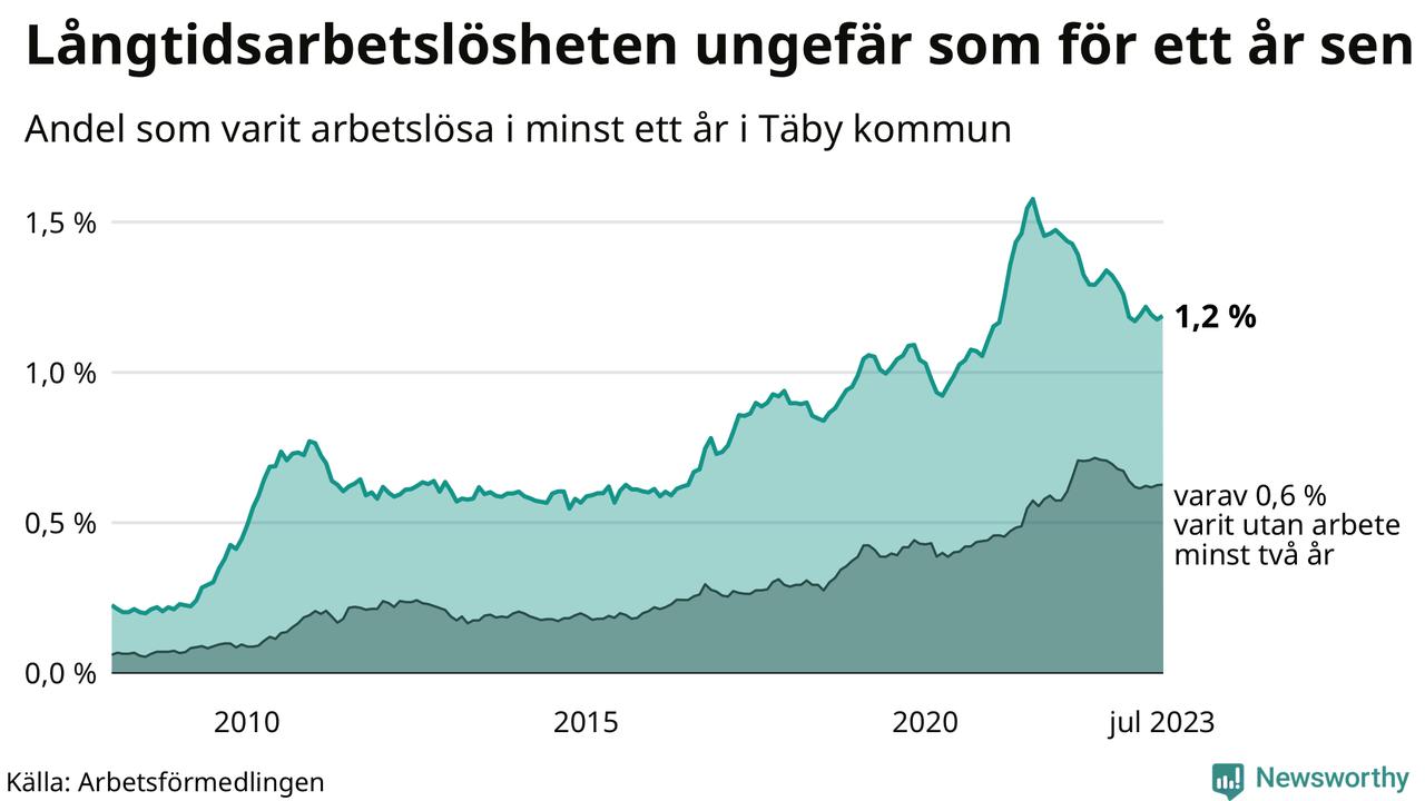 Andelen som varit utan arbete i minst ett år i Täby var ungefär lika stor i juli jämfört med samma månad för ett år sedan. Det visar Arbetsfömedlingens senaste månadsstatistik.