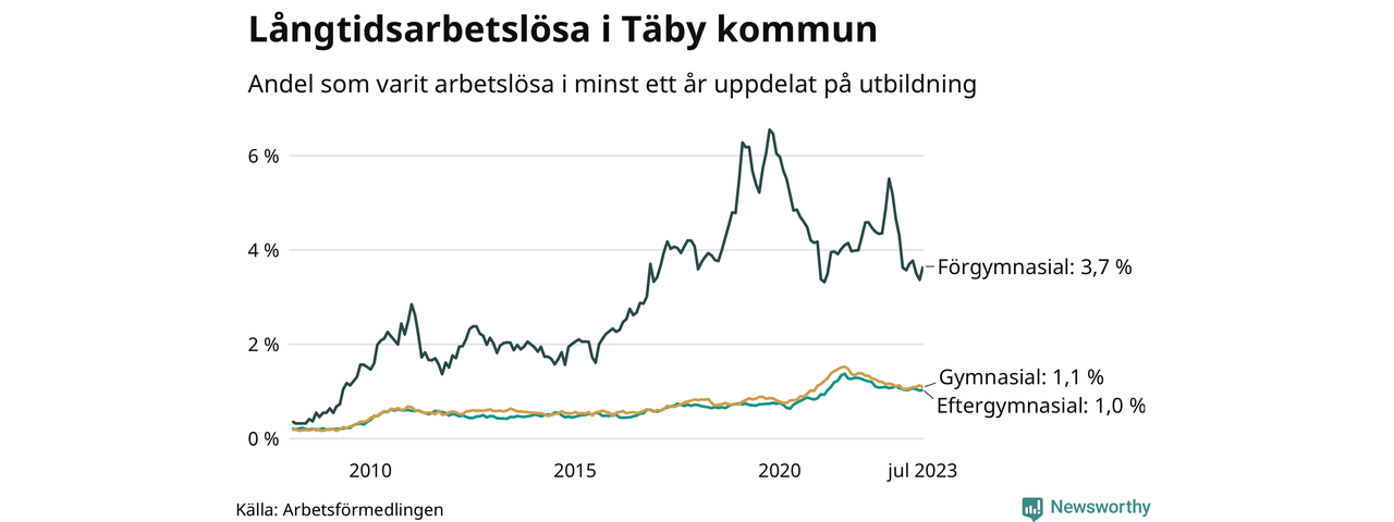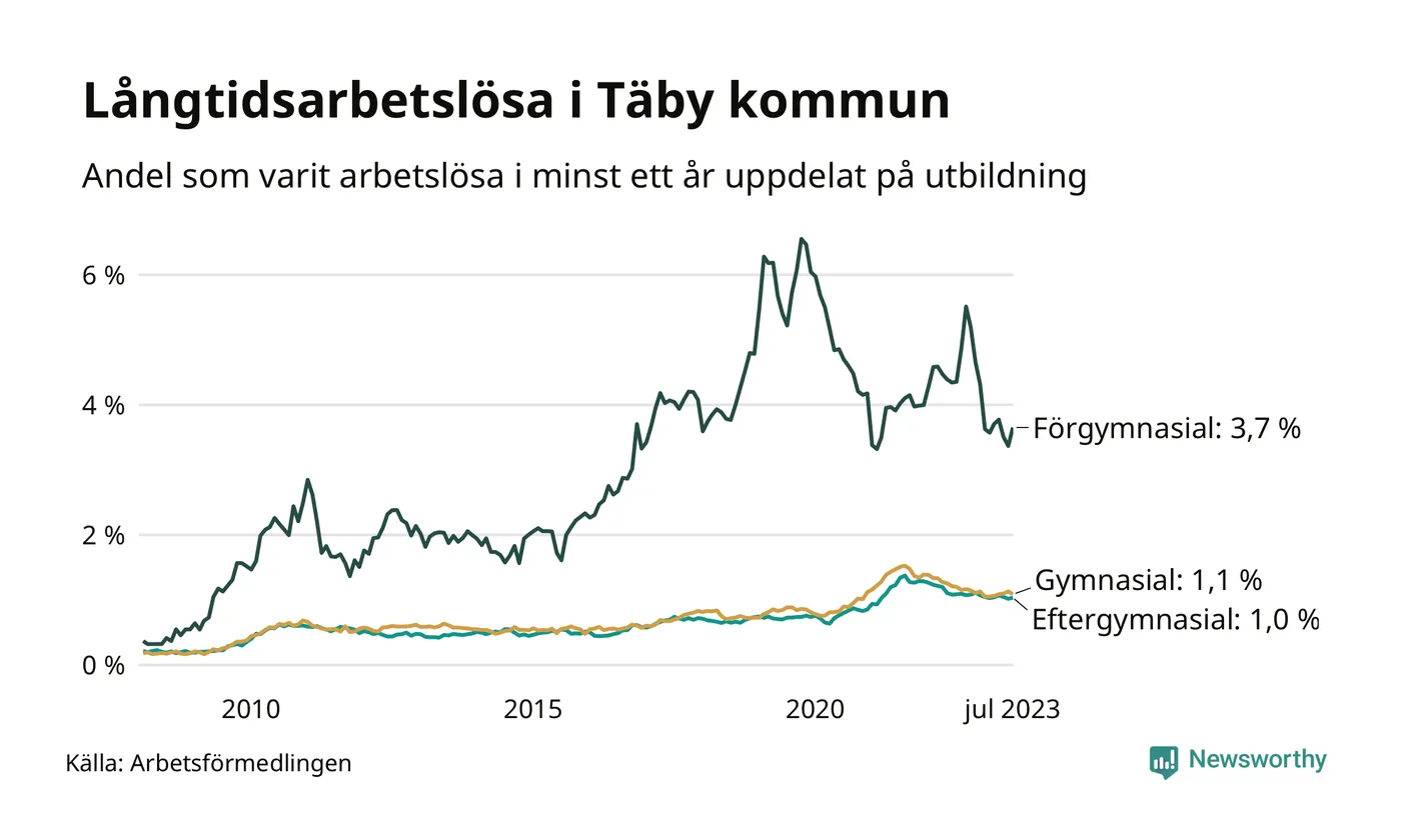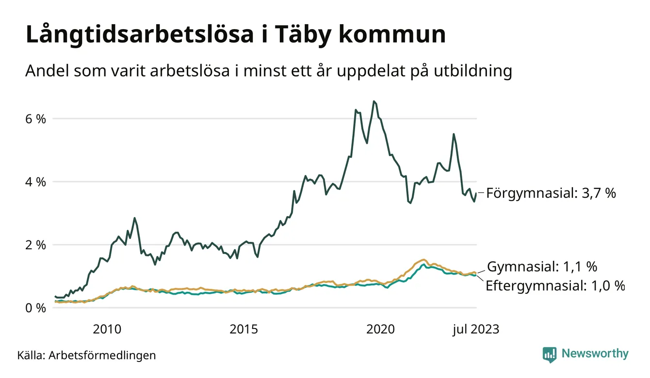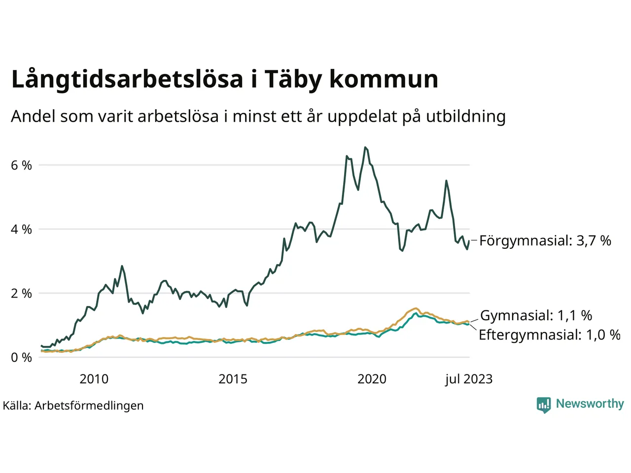 Andelen som varit utan arbete i minst ett år i Täby var ungefär lika stor i juli jämfört med samma månad för ett år sedan. Det visar Arbetsfömedlingens senaste månadsstatistik.