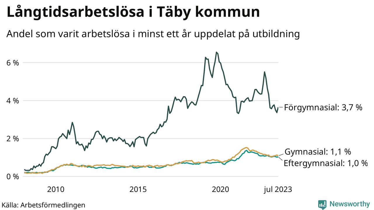 Andelen långtidsarbetslösa i Täby är den lägsta i Stockholms län. I Botkyrka finns länets högsta långtidsarbetslöshet, 4,9 procent. I Stockholms län som helhet hade 32 085 personer (2,5 procent) varit arbetslösa i minst ett år i juli. Det är 47 personer fler än månaden innan.