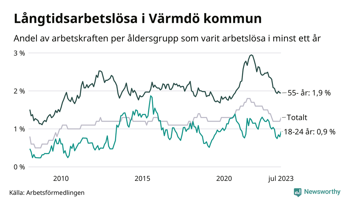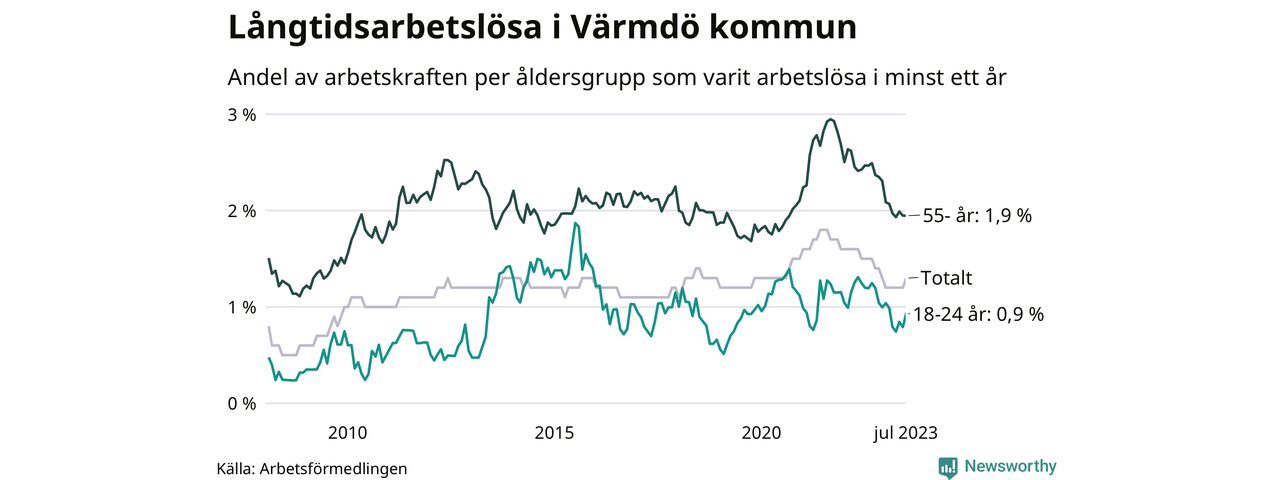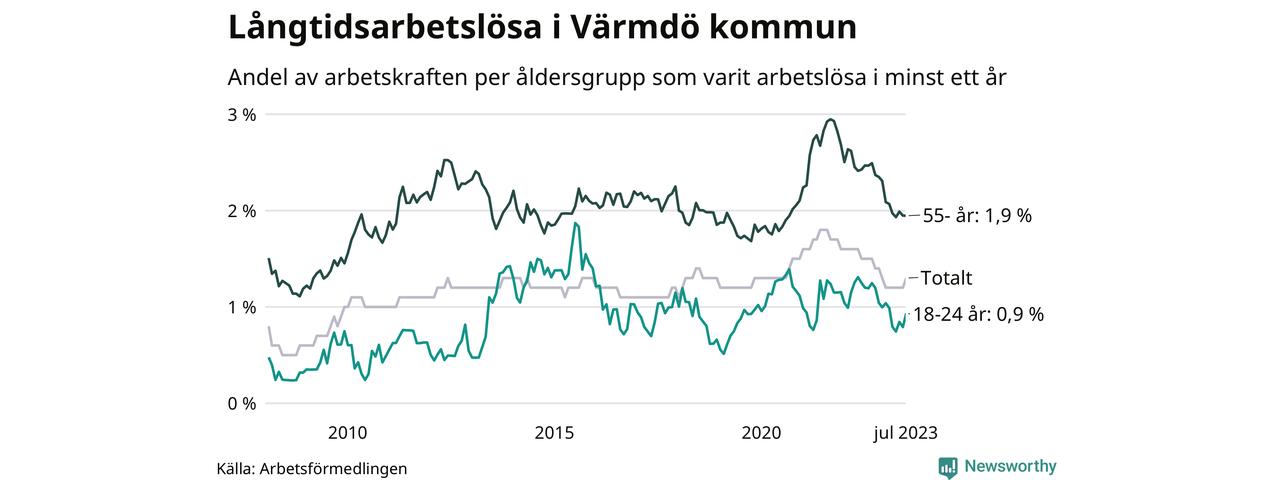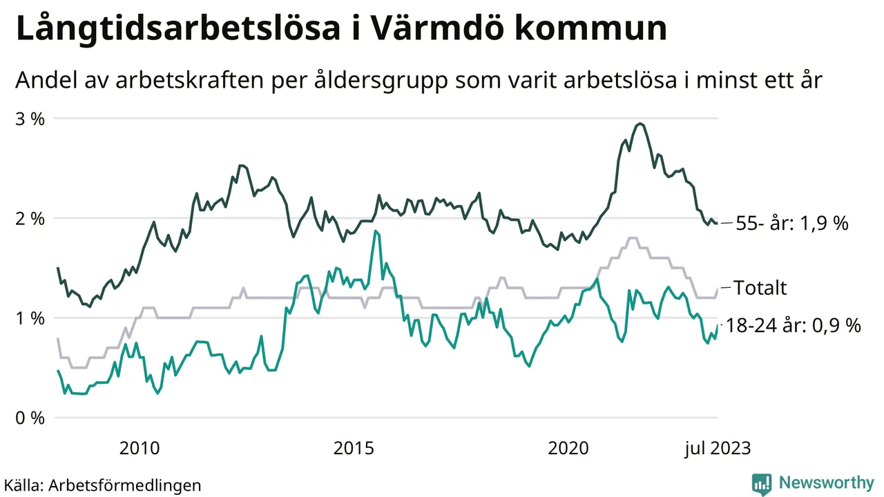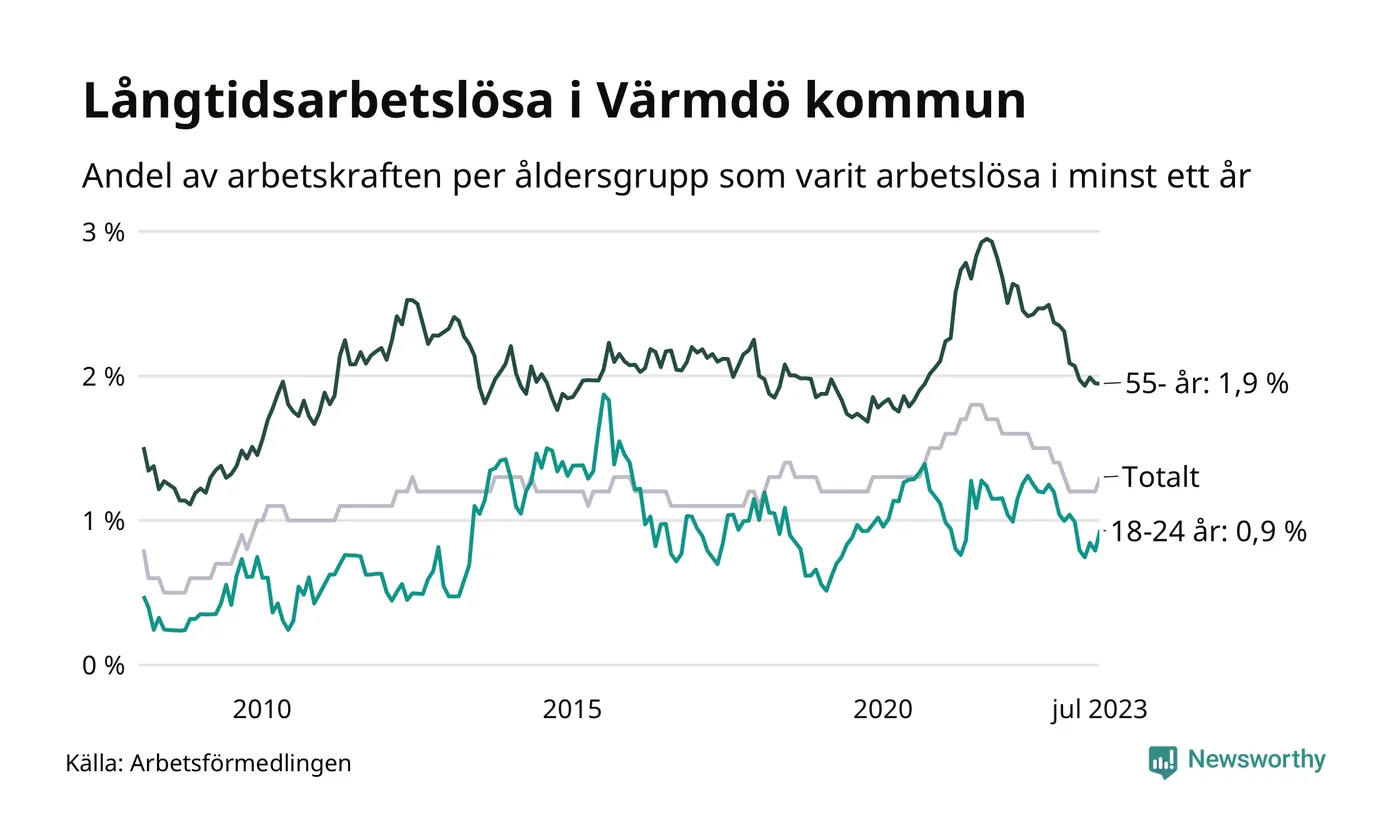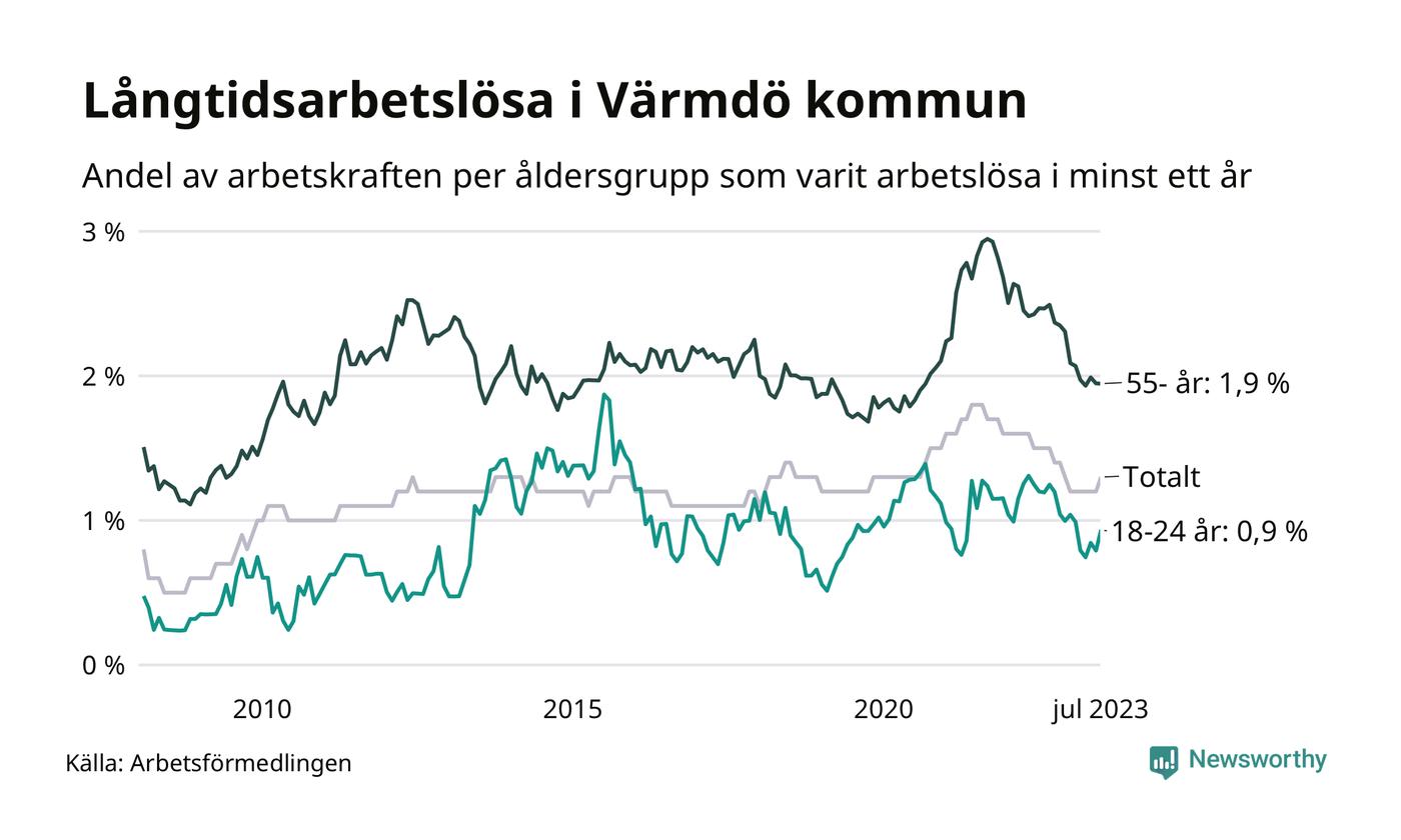 Av de 301 personerna som varit arbetslösa i mer än ett år i Värmdö kommun är 100 personer mellan 55 och 651 år och 19 är mellan 18 och 24 år. För den äldre gruppen är andelen arbetslösa 1,9 procent medan den i den yngre gruppen är 0,9 procent. Även i riket som helhet är långtidsarbetslösheten högre i gruppen äldre.