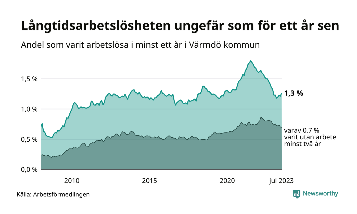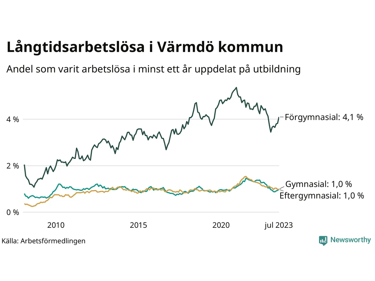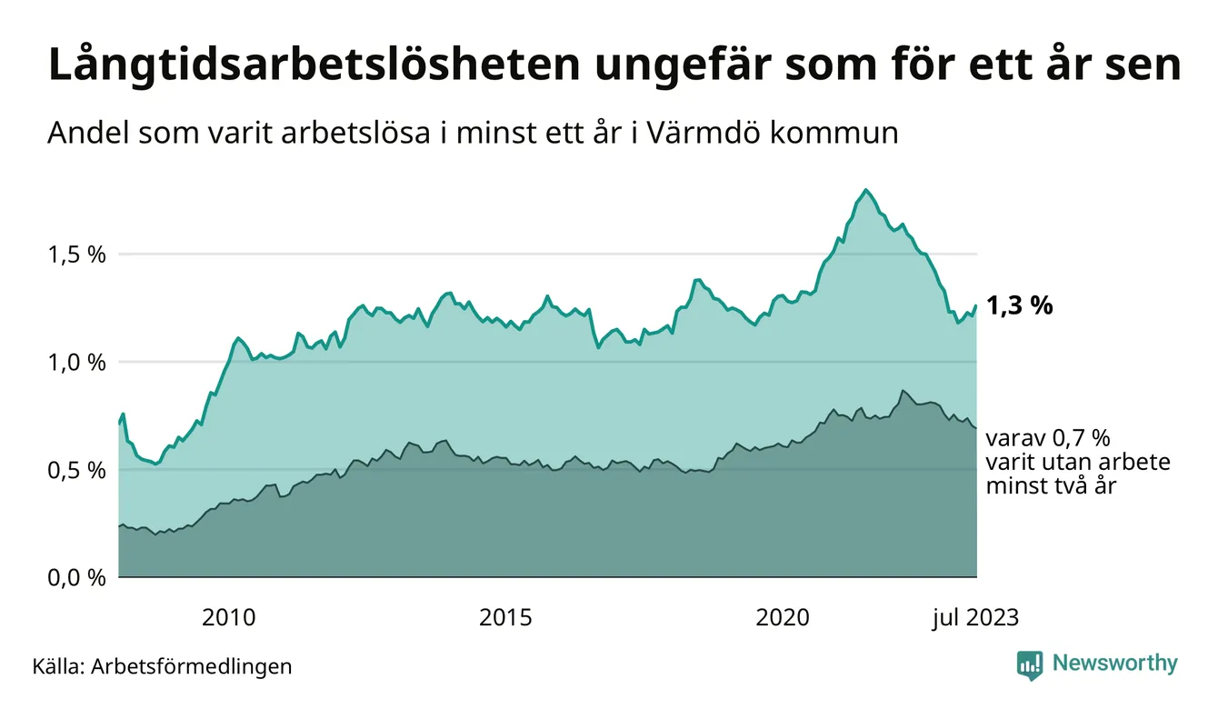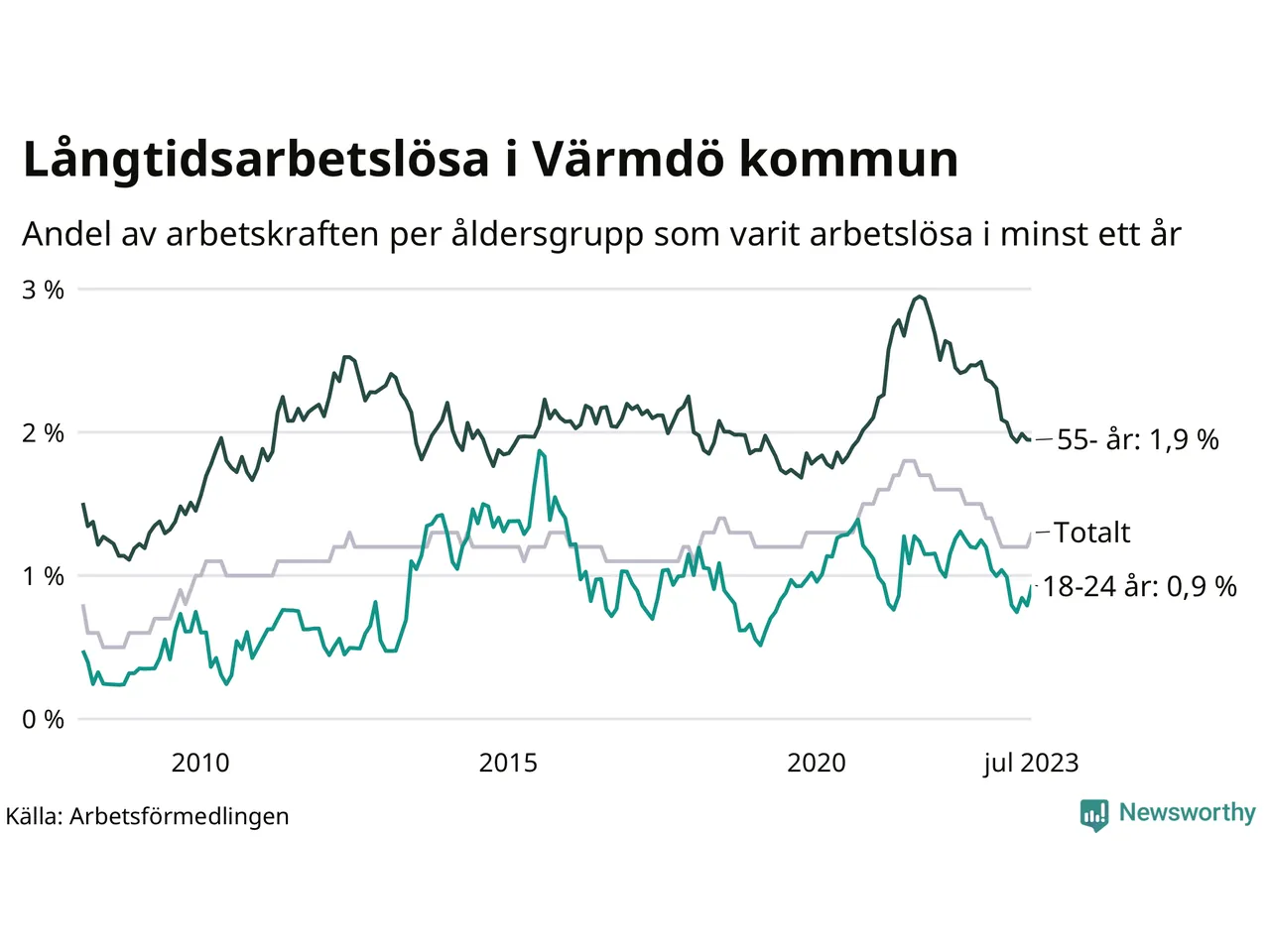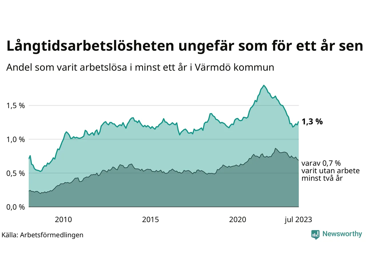 I juli hade 301 Värmdöbor varit arbetslösa i minst ett år, vilket är 13 fler än månaden innan. 301 personer motsvarar 1,3 procent av arbetskraften i kommunen – andelen långtidsarbetslösa är ungefär på samma nivå som för ett år sedan.