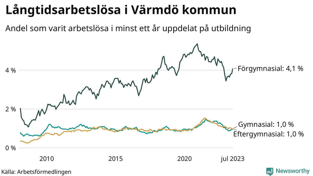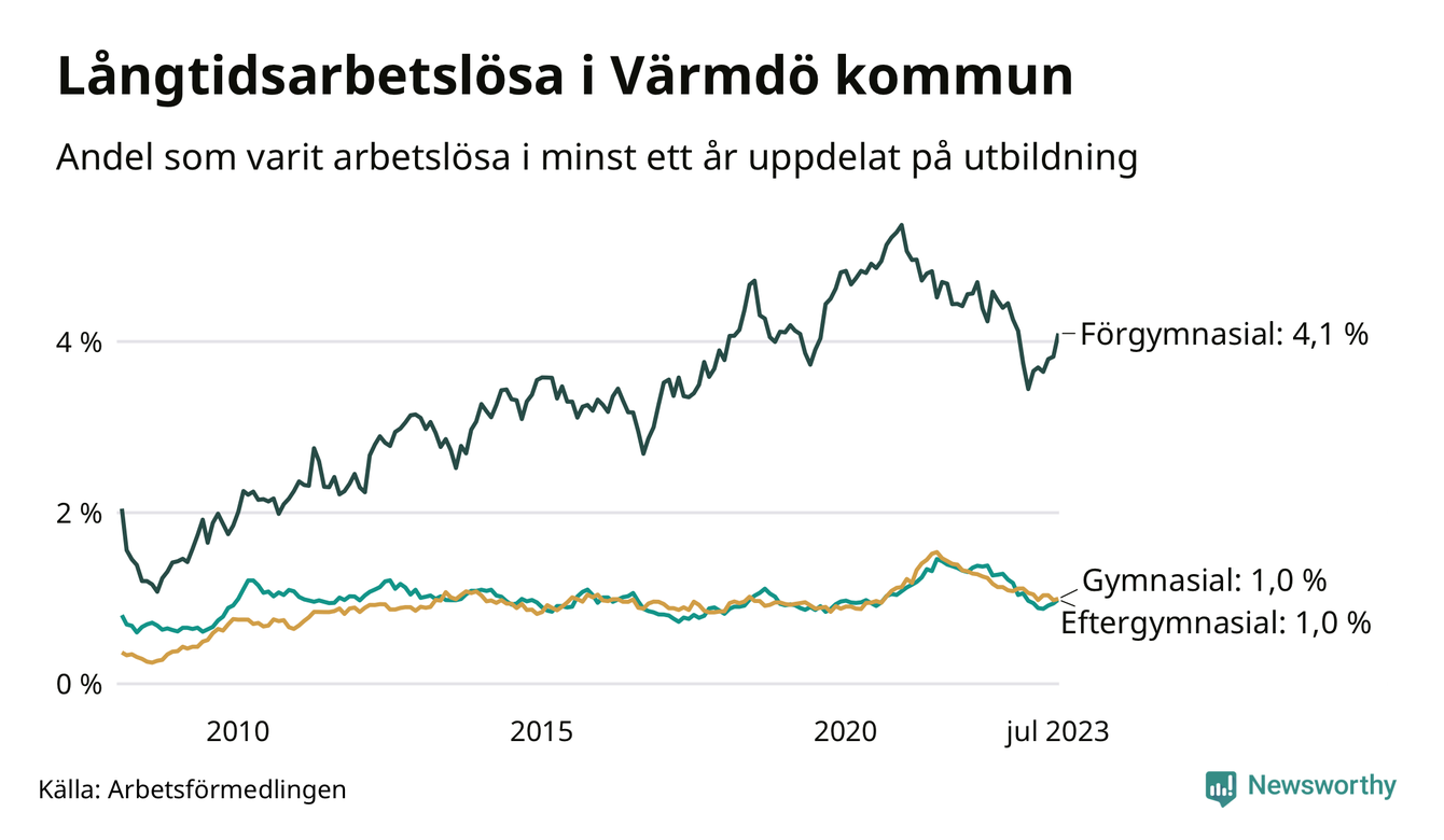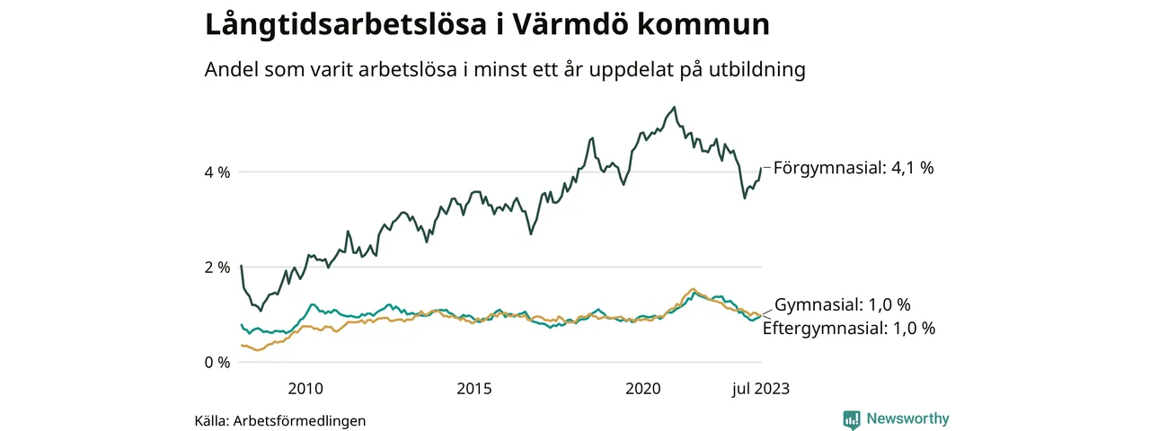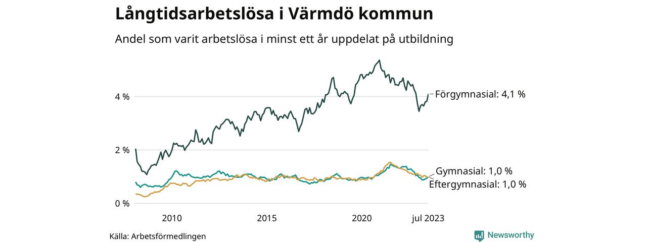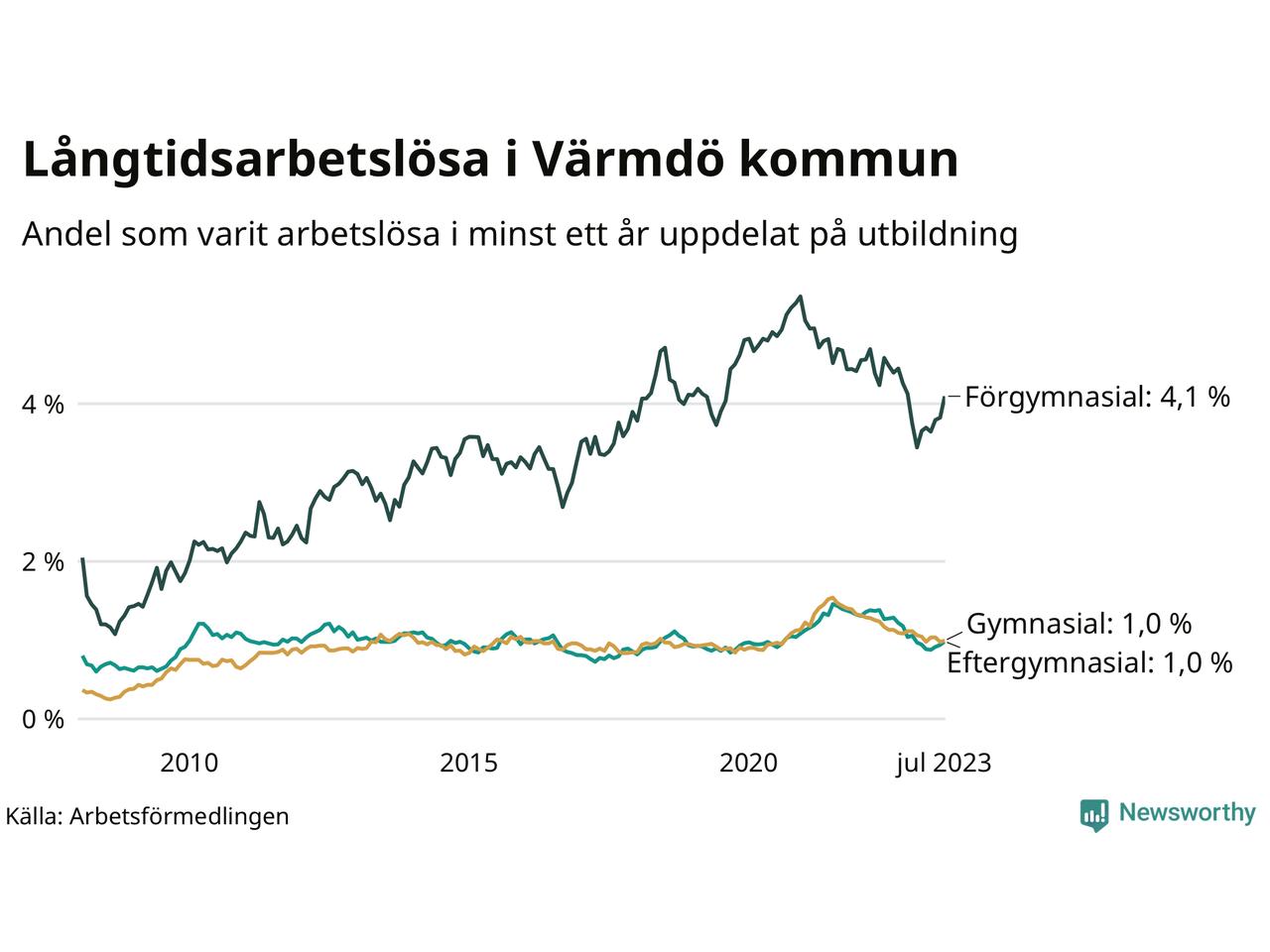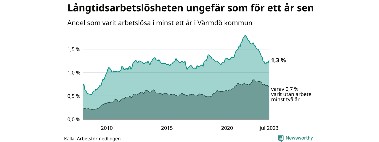 I juli hade 301 Värmdöbor varit arbetslösa i minst ett år, vilket är 13 fler än månaden innan. 301 personer motsvarar 1,3 procent av arbetskraften i kommunen – andelen långtidsarbetslösa är ungefär på samma nivå som för ett år sedan.
