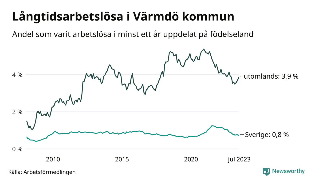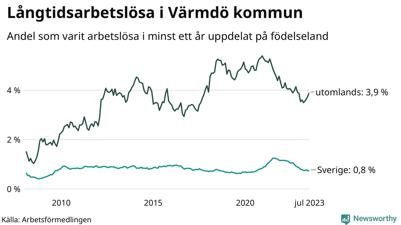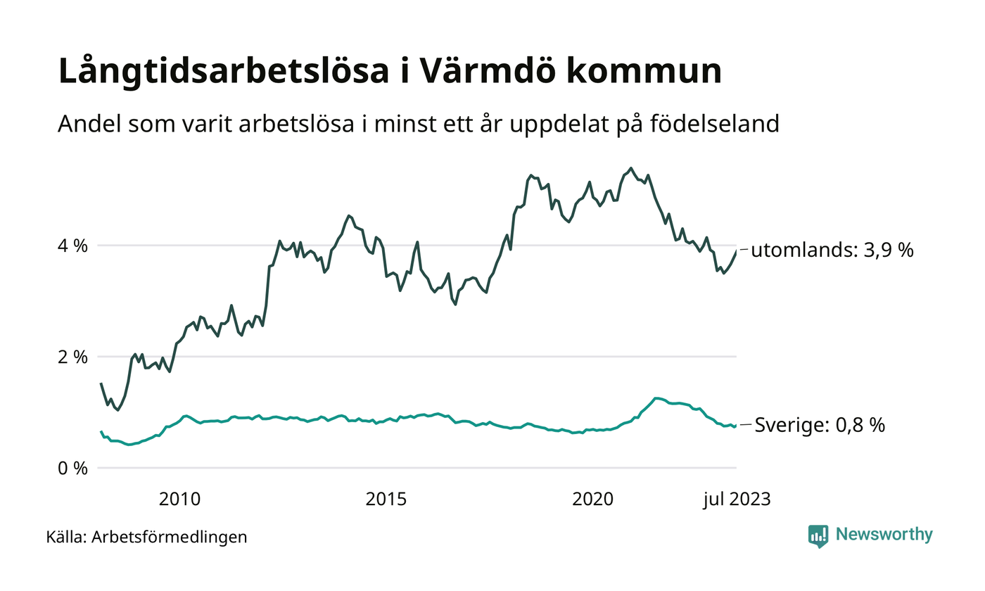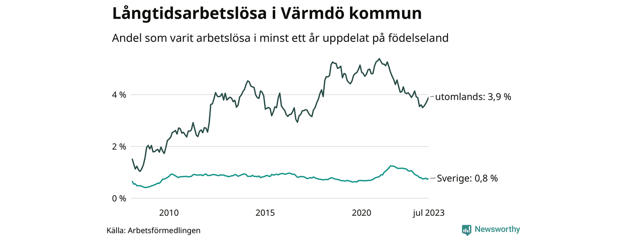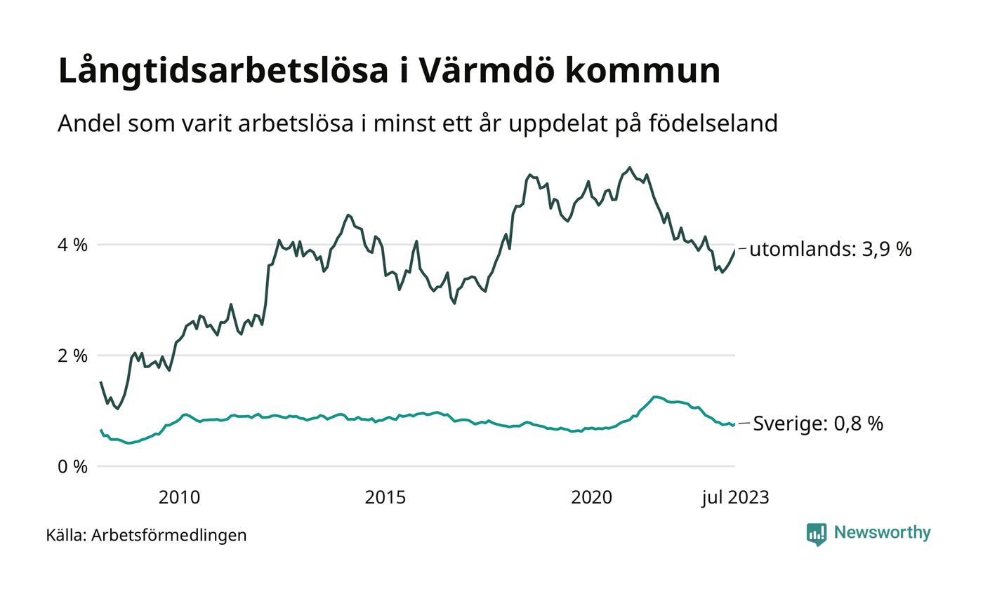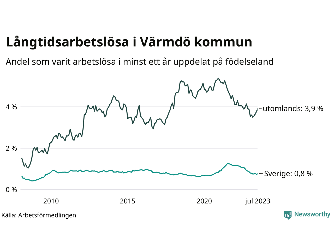 155 av de långtidsarbetslösa i Värmdö är födda i Sverige, medan 146 är födda utomlands. Det innebär att långtidsarbetslösheten bland Sverigefödda är 0,8 procent, medan den är fem gånger så hög – 3,9 procent – bland födda utomlands. Även i riket som helhet är arbetslösheten högre bland utrikesfödda.