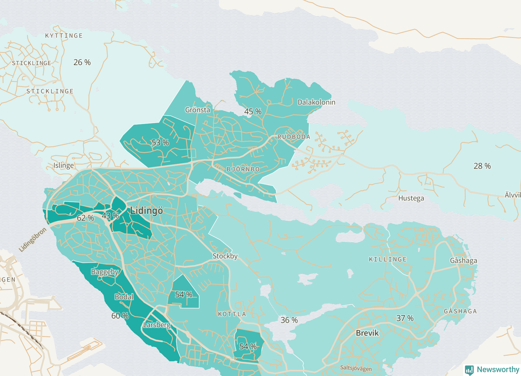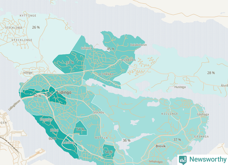 | Lidingö centrum-Torsvik | 545 | 62 % |