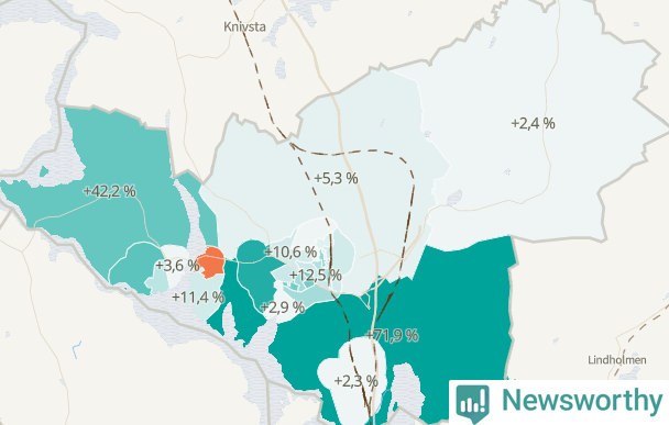 Men det växer inte överallt i kommunen. Det visar sig när när Newsworthy samlar SCB:s befolkningsdata från tio år för att se hur kommunen utvecklats. Medan området Skånela-Steningevik omland har ökat invånarantalet med 718 personer – 72 procent – har Björkbacka-Tilsjö minskat sin befolkning med 56 invånare.