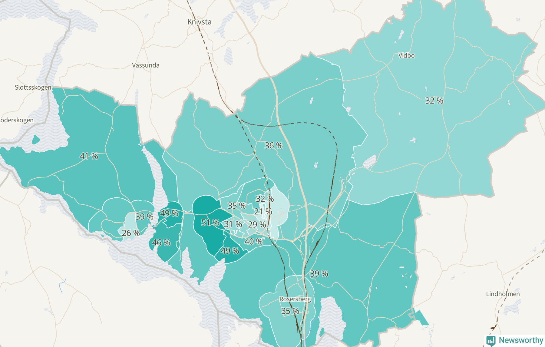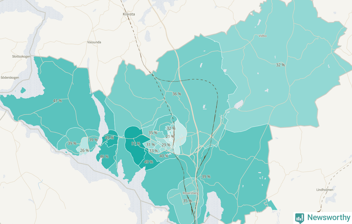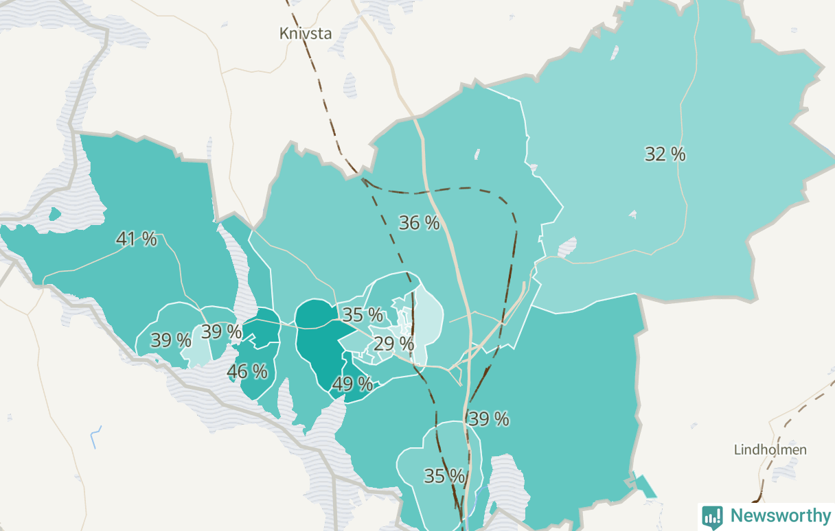 | Sjudargården-Prästängarna | 484 | 39 % |