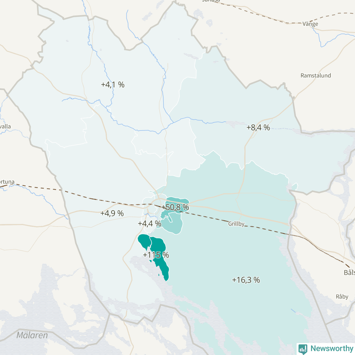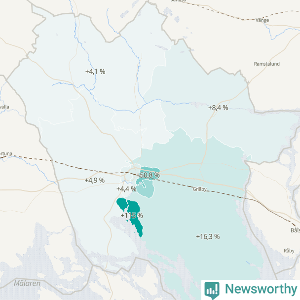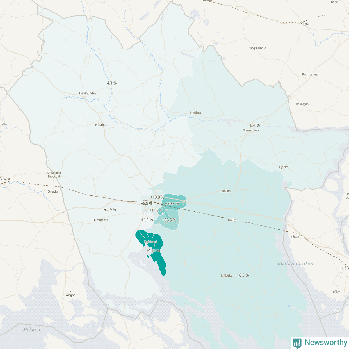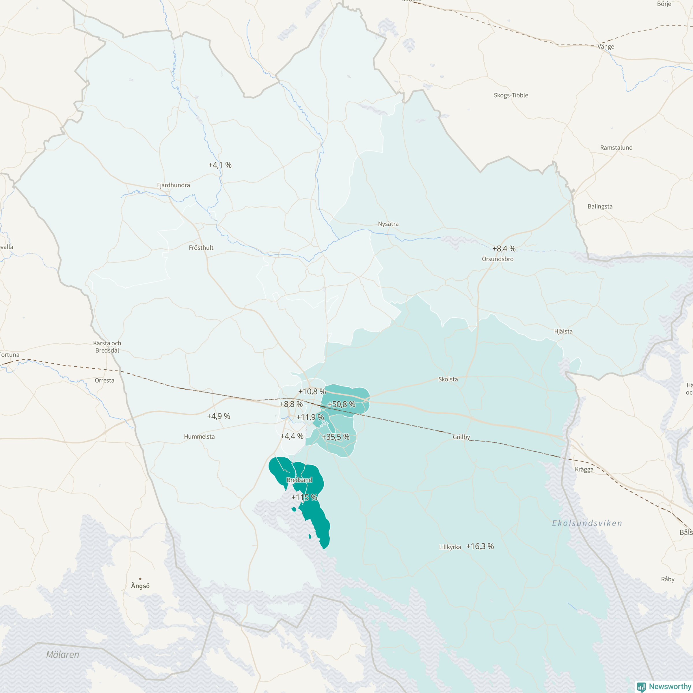| Åsunda | 4 314 | 4 525 | +211 | +5 % ▲ |