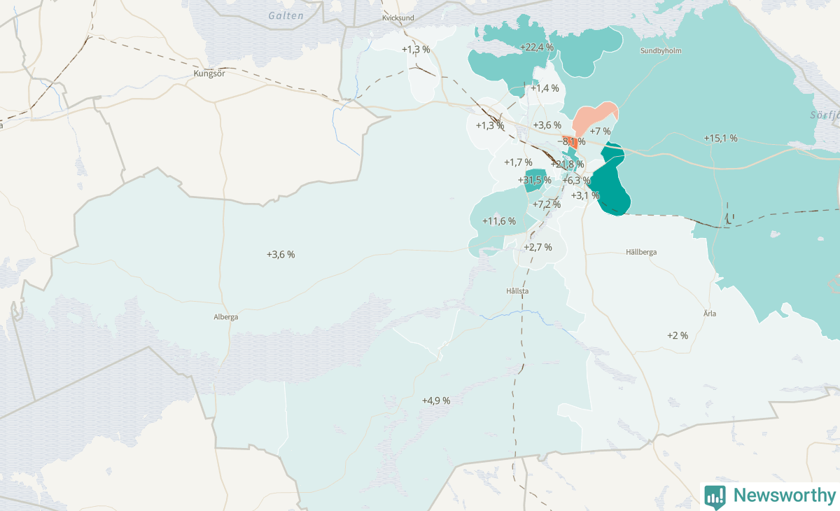 Men det växer inte överallt i kommunen. Det visar sig när när Newsworthy samlar SCB:s befolkningsdata från tio år för att se hur kommunen utvecklats. Medan området Trumtorp-Odlaren-Hagnestahill har ökat invånarantalet med 618 personer – 45 procent – har Årby-Vallby minskat sin befolkning med 247 invånare.