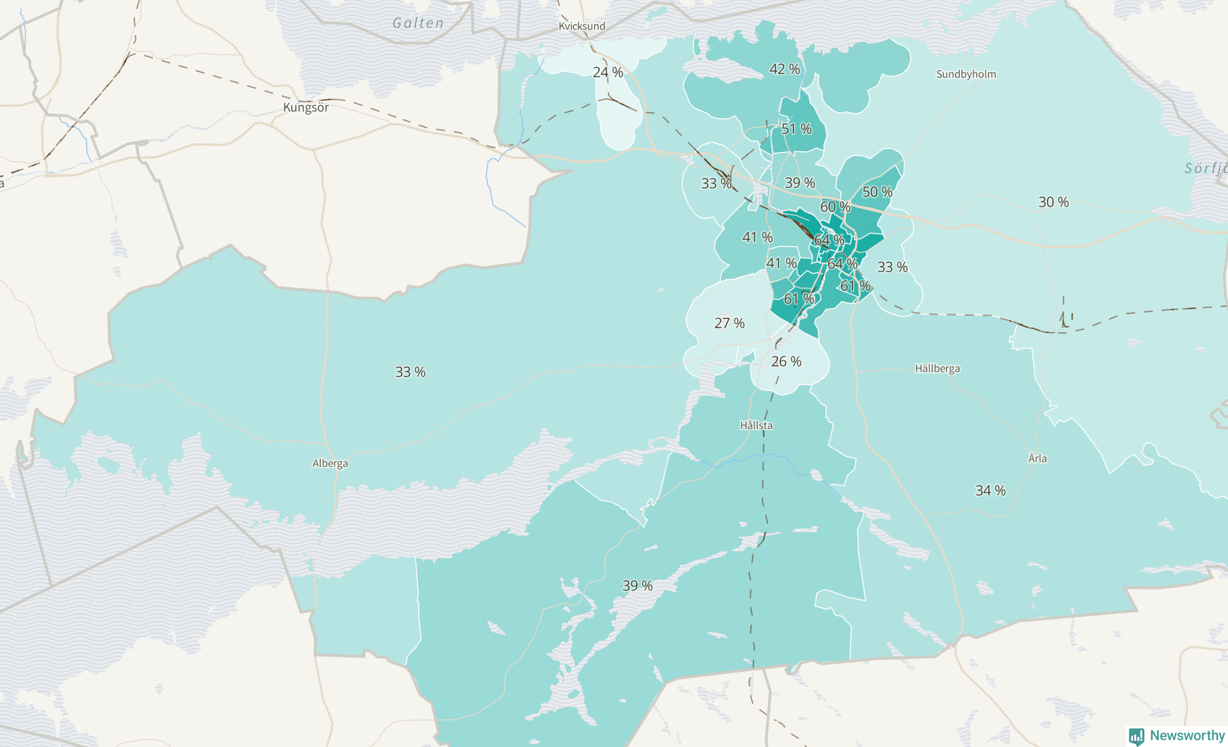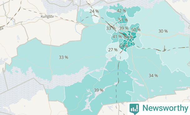 | Munktellstaden-Norr-Gamla staden | 3 323 | 67 % |