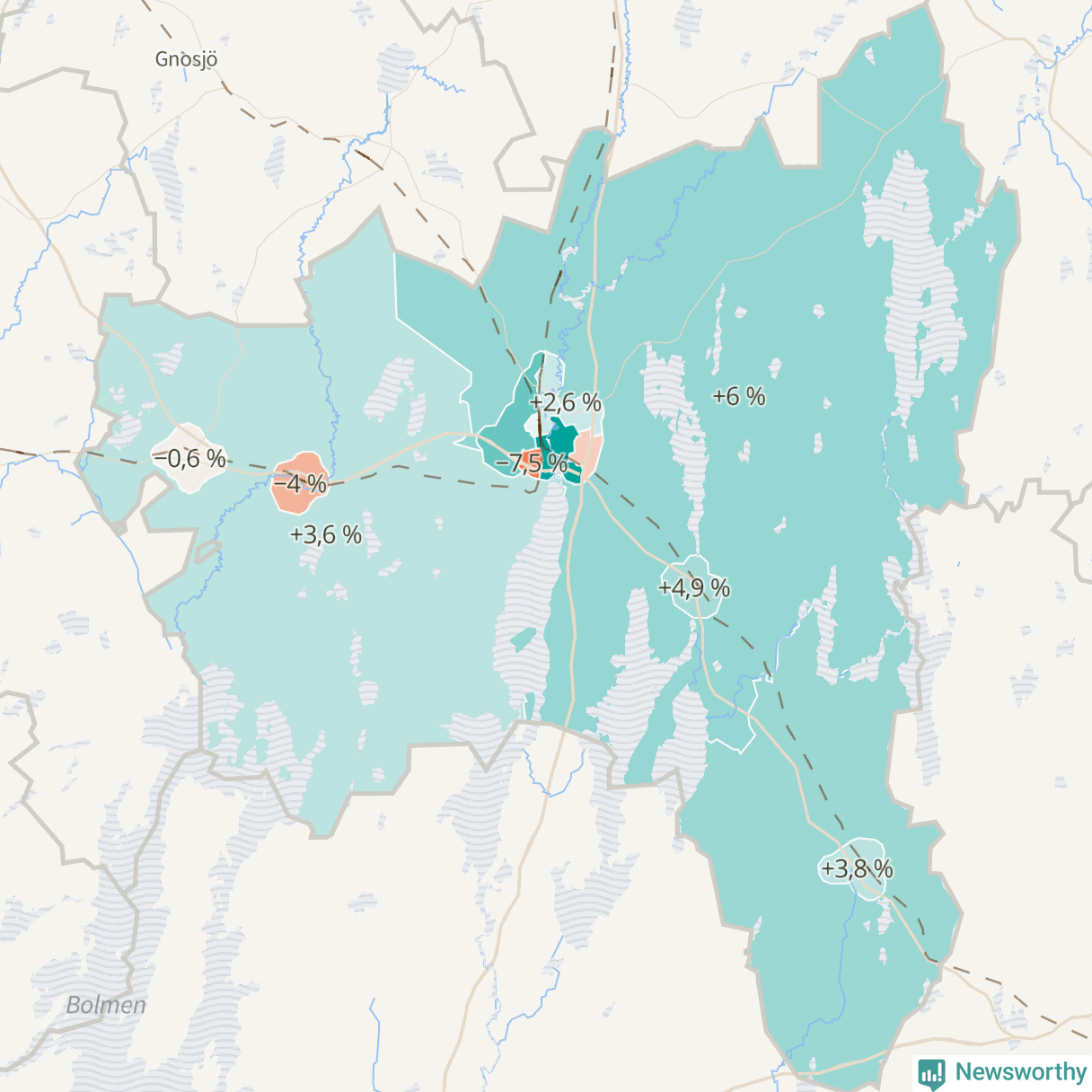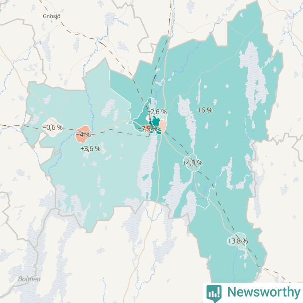 Men det växer inte överallt i kommunen. Det visar sig när när Newsworthy samlar SCB:s befolkningsdata från tio år för att se hur kommunen utvecklats. Medan området Centrum-Apladalen har ökat invånarantalet med 754 personer – 15 procent – har Mossle minskat sin befolkning med 108 invånare.