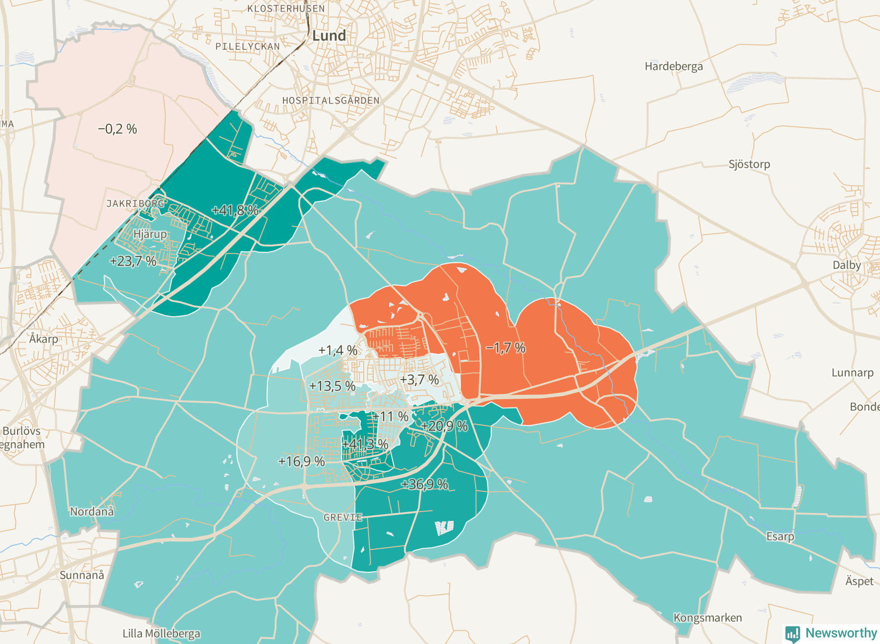 Men det växer inte överallt i kommunen. Det visar sig när när Newsworthy samlar SCB:s befolkningsdata från tio år för att se hur kommunen utvecklats. Medan området Norra Hjärup-omnejd-Bergströmshusen har ökat invånarantalet med 893 personer – 42 procent – har Nordöstra Staffanstorp-omnejd snarare minskat sin befolkning något.