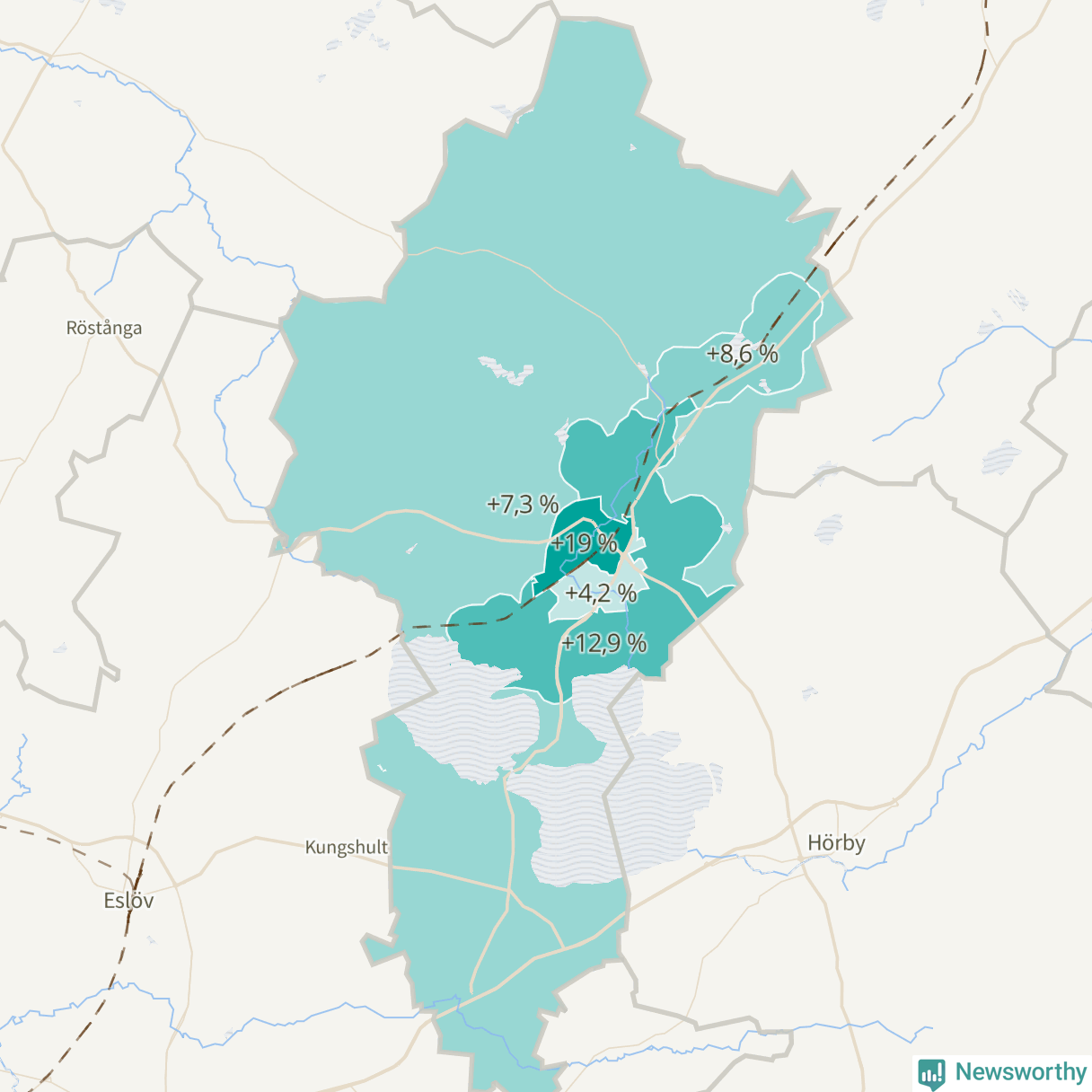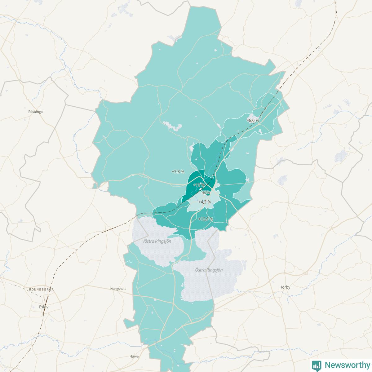 Ökningen syns i alla de fem områden som SCB delar upp kommunen i, visar Newsworthys genomgång av detaljerad befolkningsdata. Störst är ökningen i området Höör väster-Centrala Höör-Grönalund, som ökat från 3 705 till 4 408 invånare.