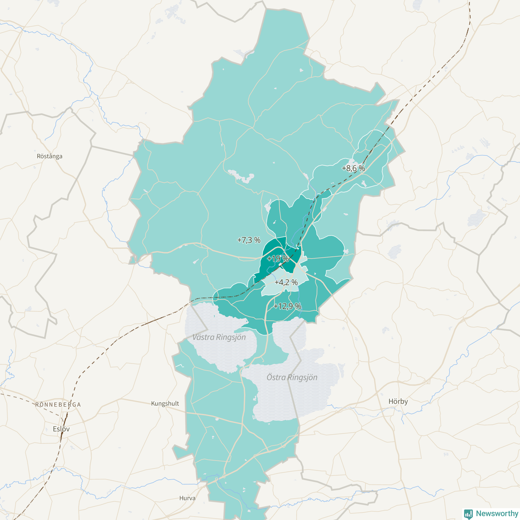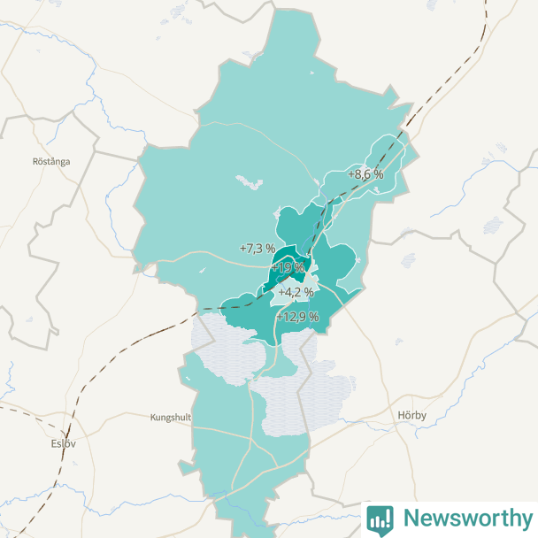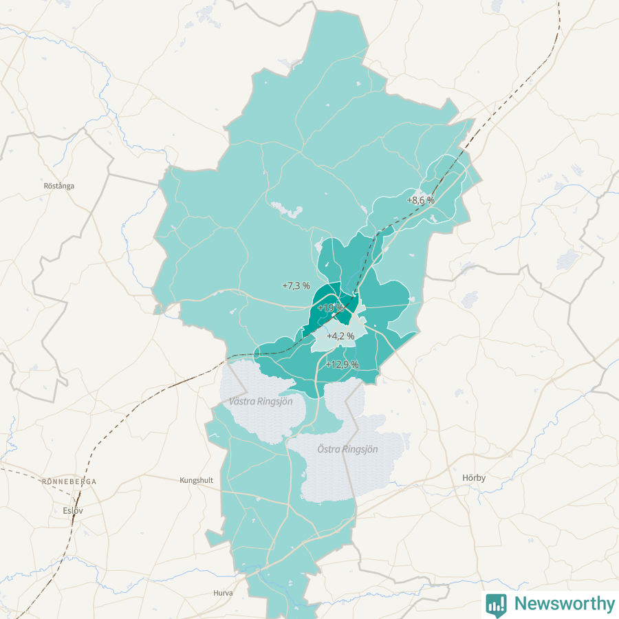 | Höör väster-Centrala Höör-Grönalund | 3 705 | 4 408 | +703 | +19 % ▲ |