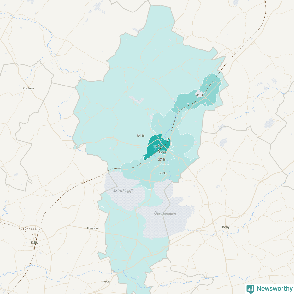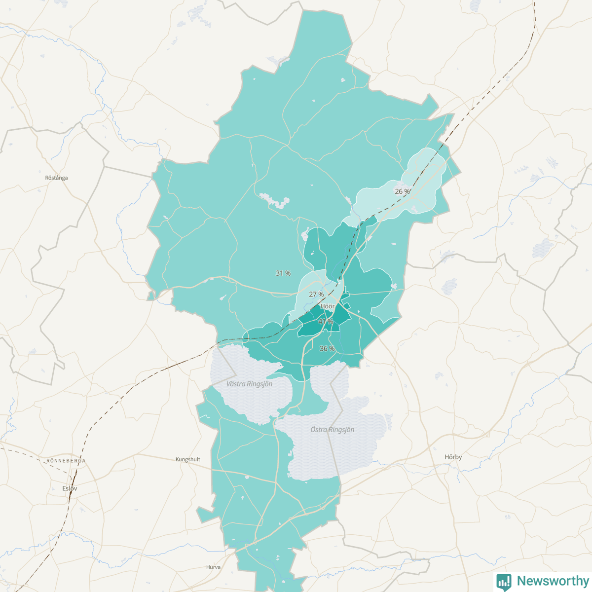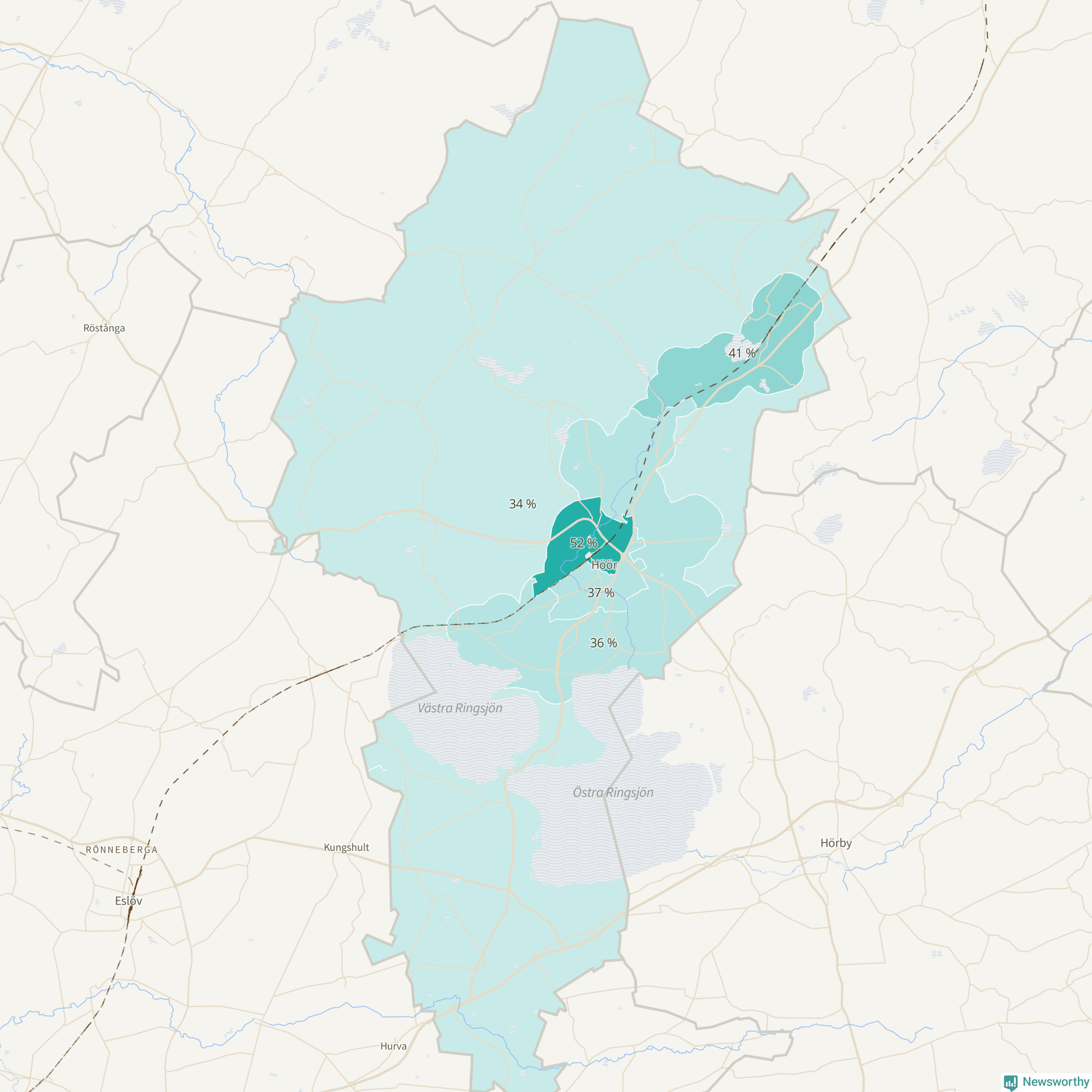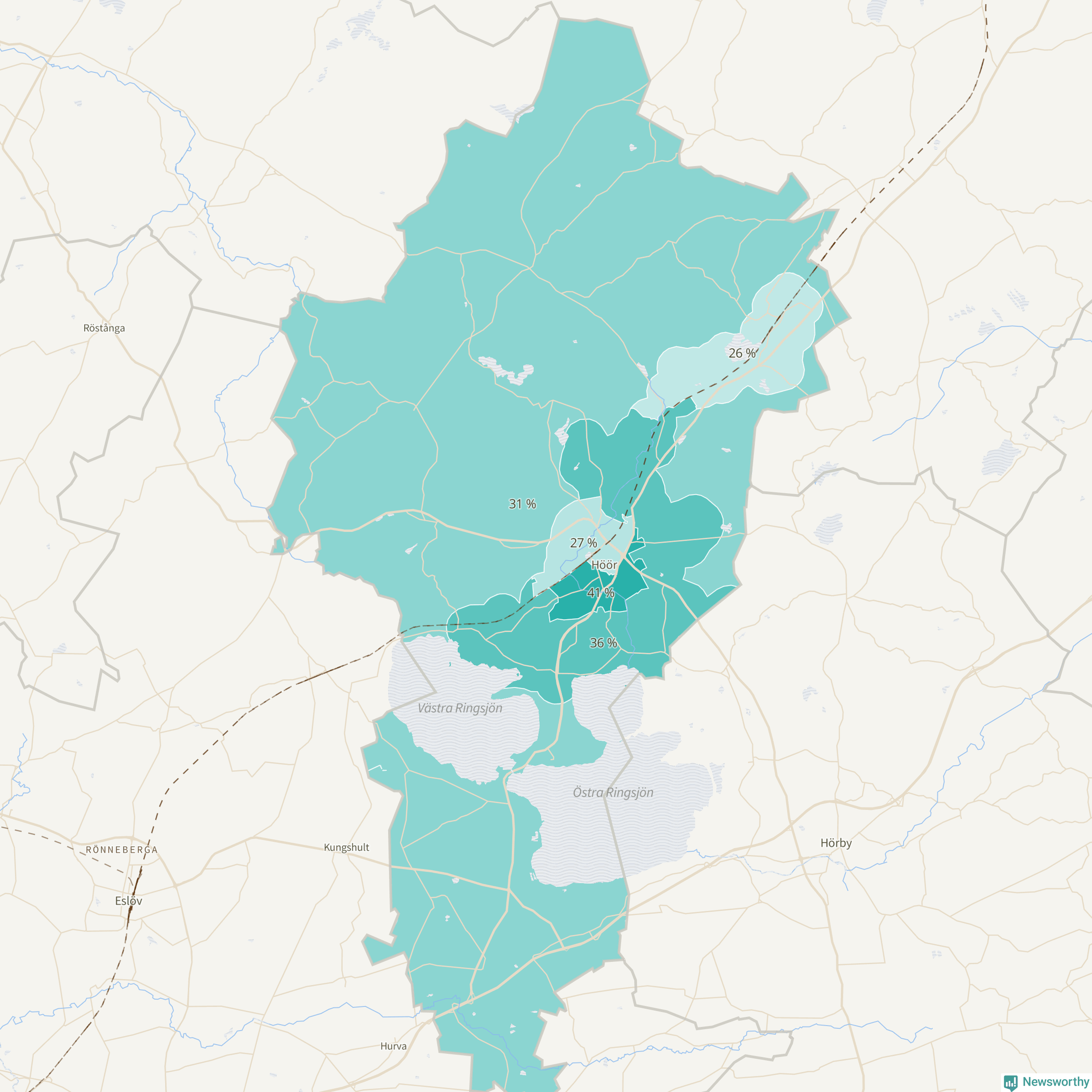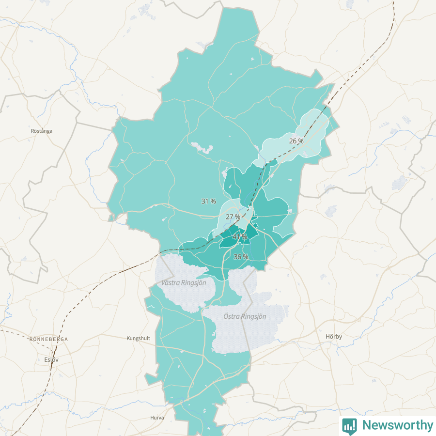 | Höör väster-Centrala Höör-Grönalund | 594 | 27 % |