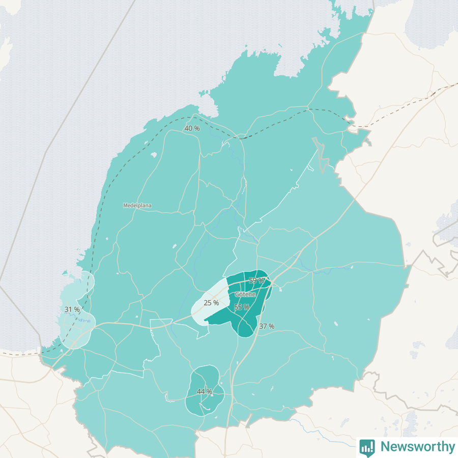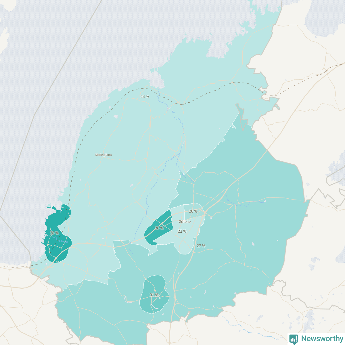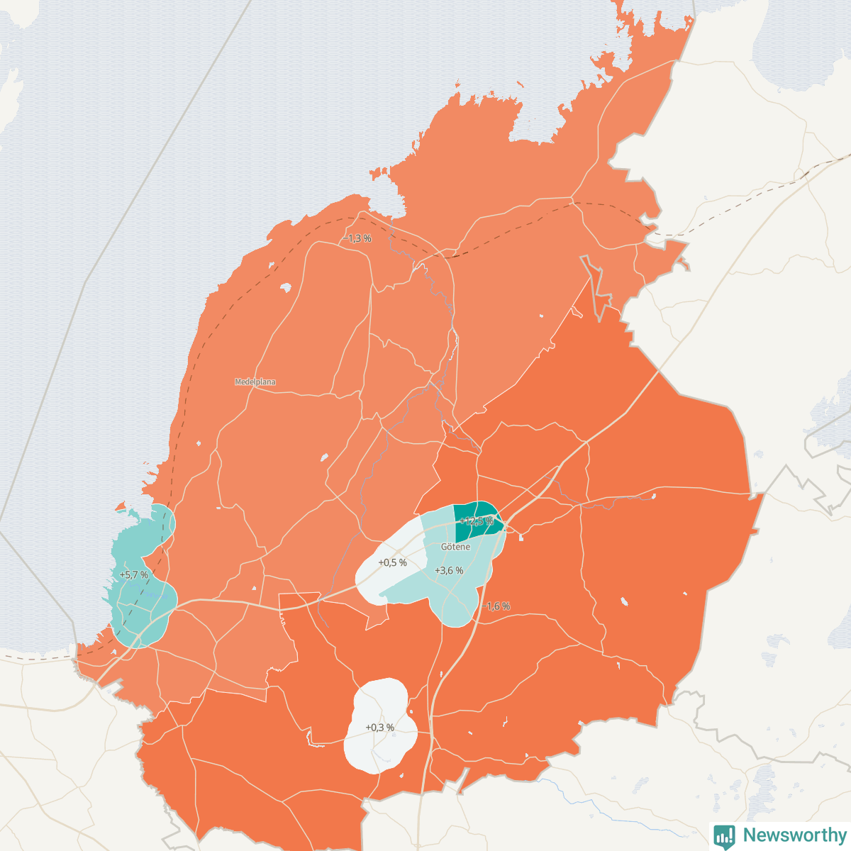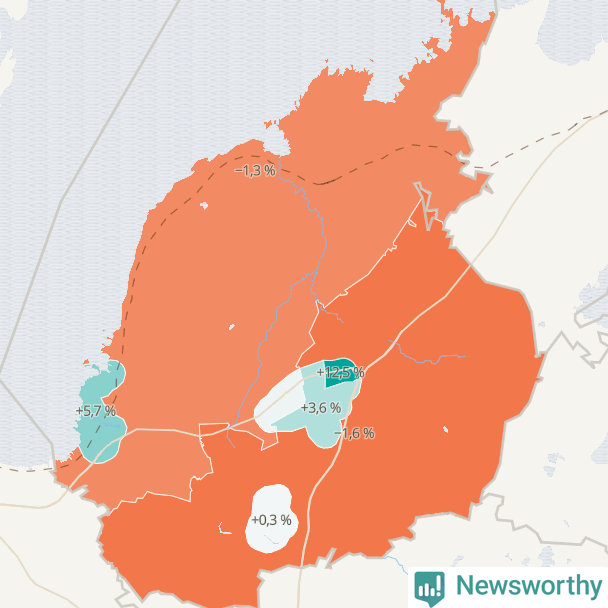 Men det växer inte överallt i kommunen. Det visar sig när när Newsworthy samlar SCB:s befolkningsdata från tio år för att se hur kommunen utvecklats. Medan området Götene tätort nordöstra har ökat invånarantalet med 112 personer – 13 procent – har Götene kommun sydöstra snarare minskat sin befolkning något.