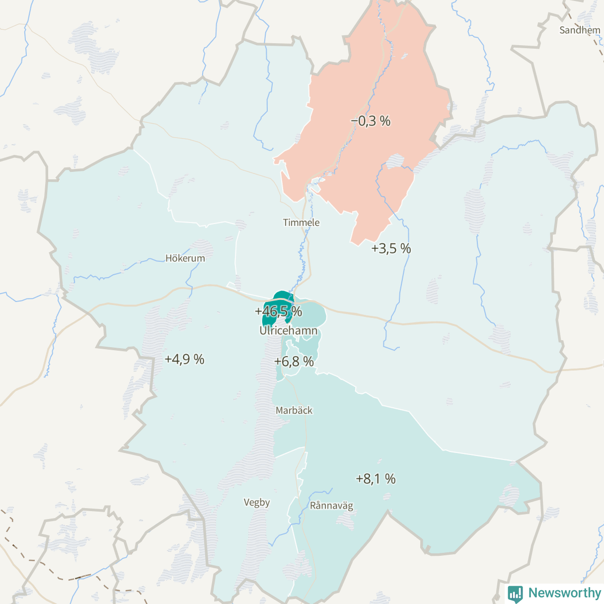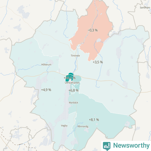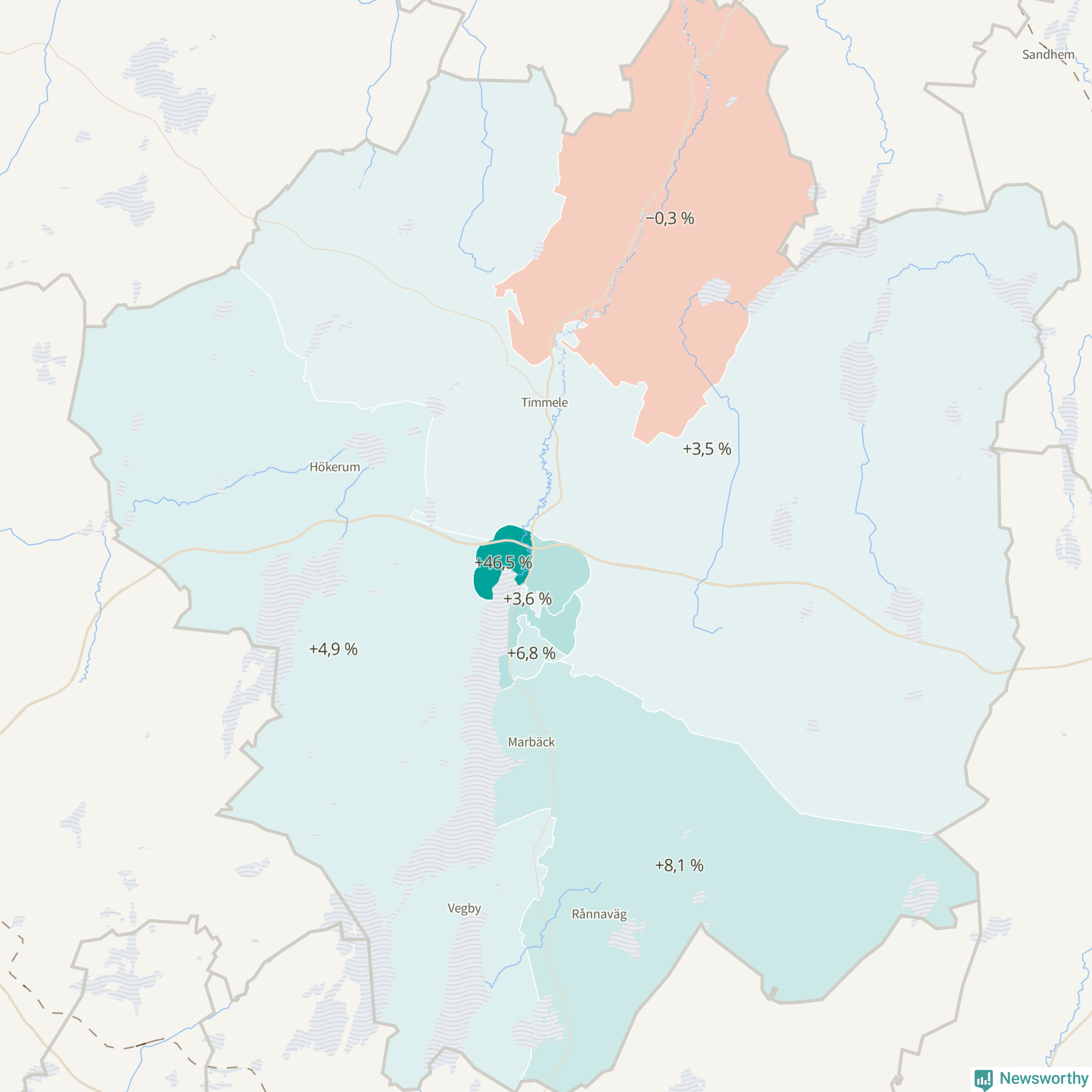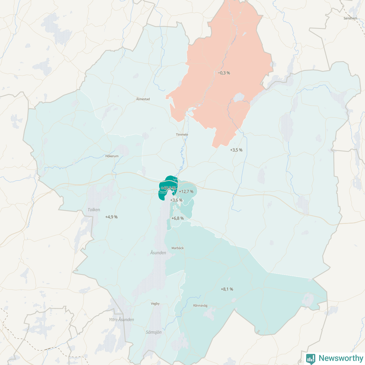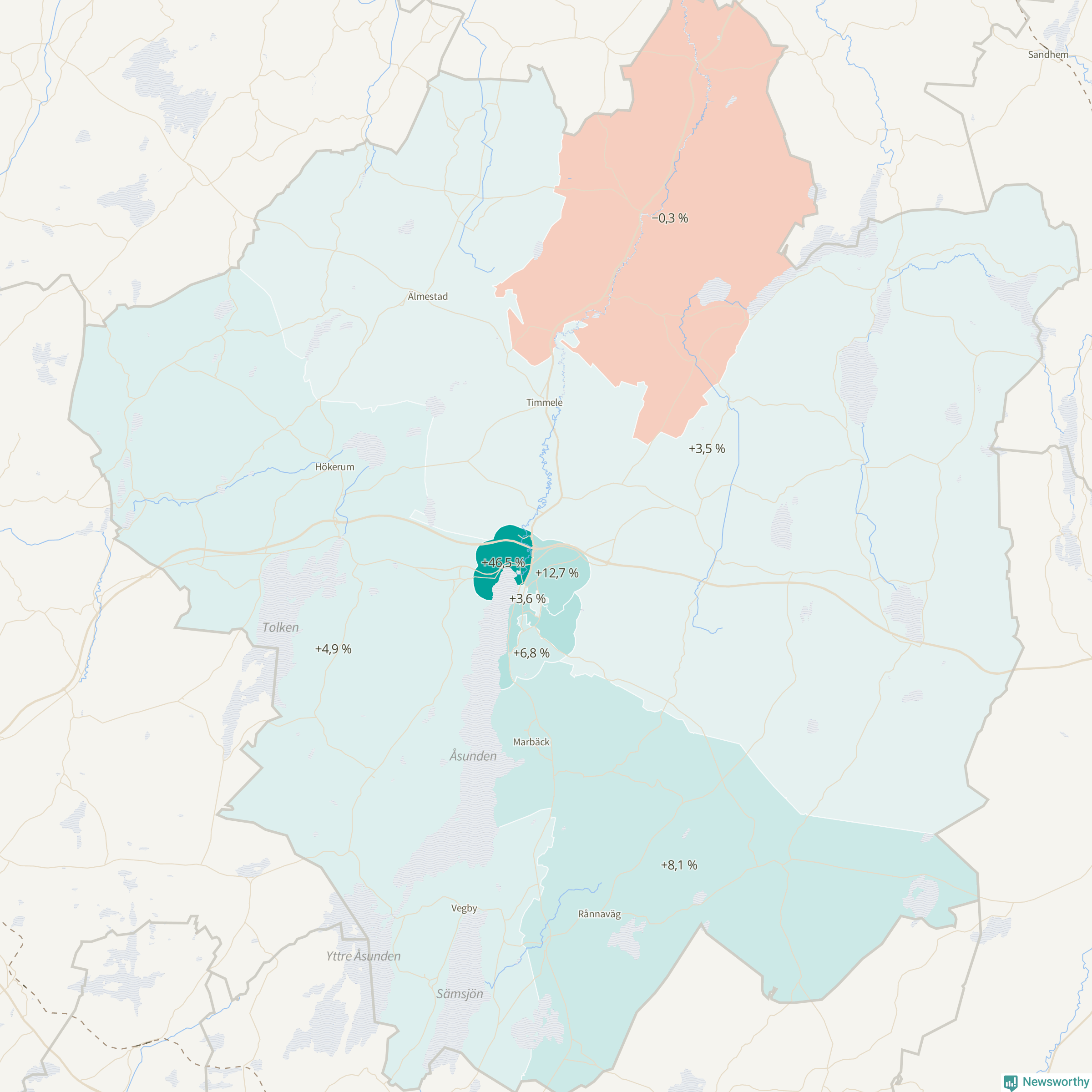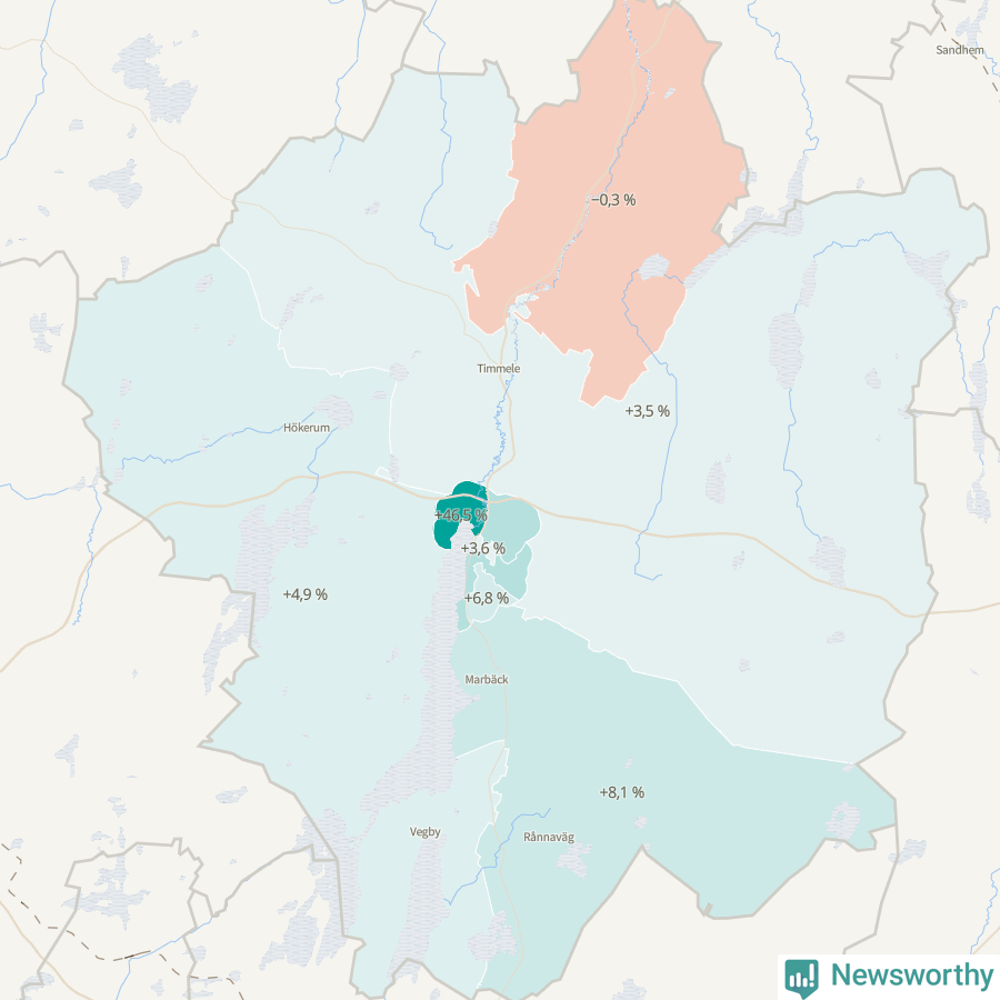 | Hökerum-Tvärred-Vegby | 4 736 | 4 967 | +231 | +5 % ▲ |