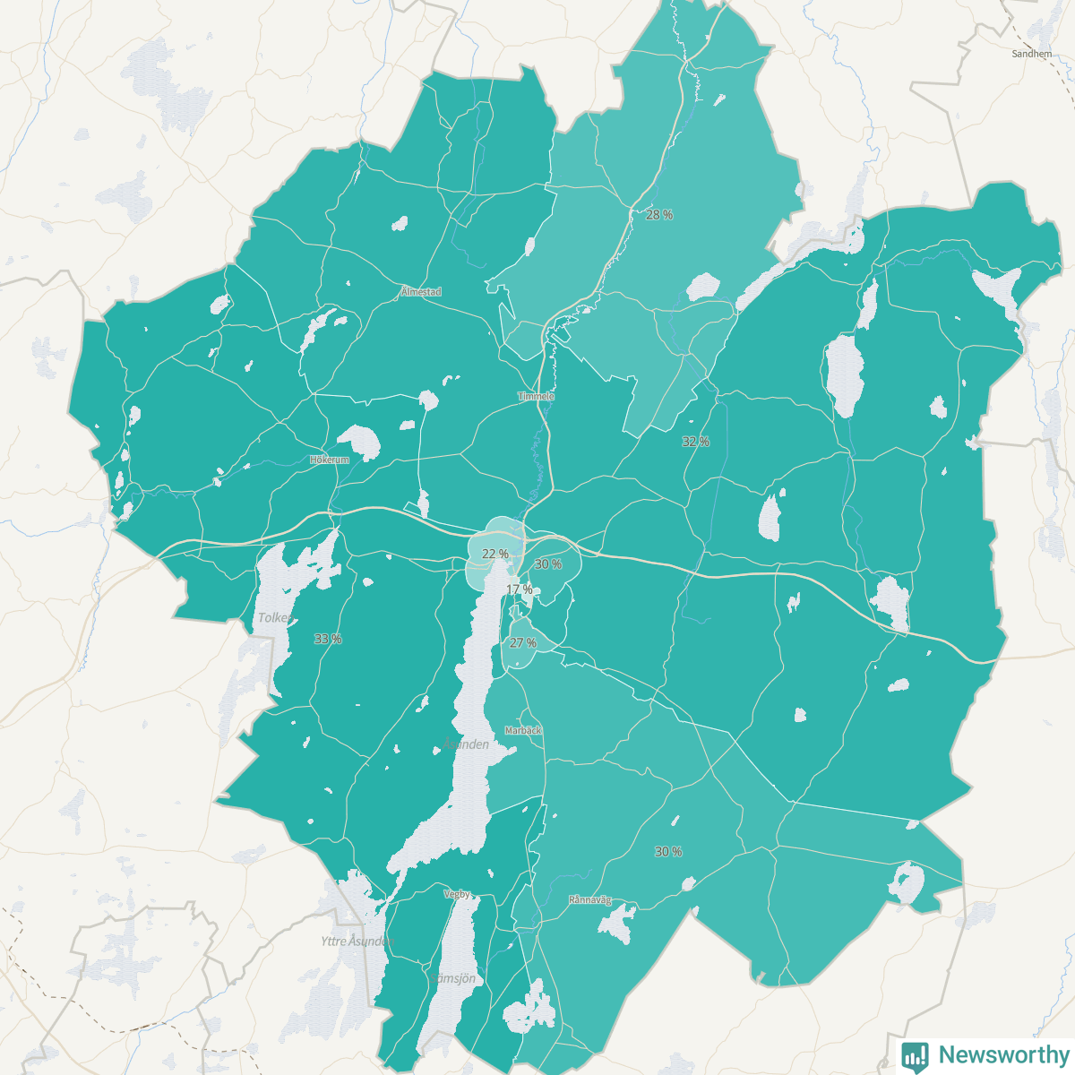 | Hökerum-Tvärred-Vegby | 696 | 33 % |