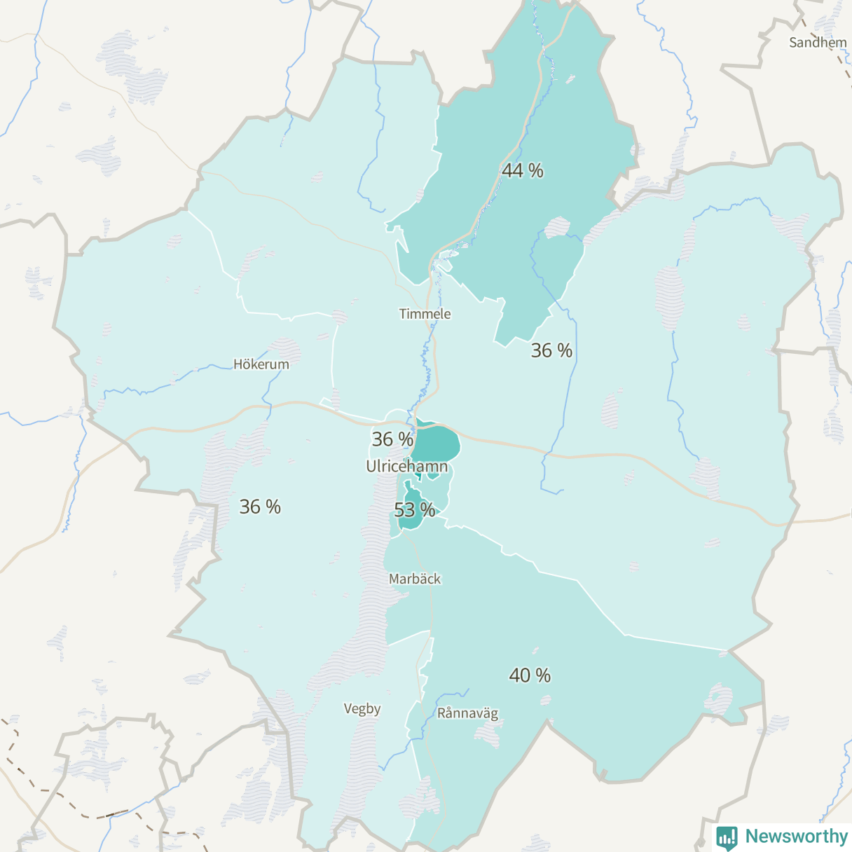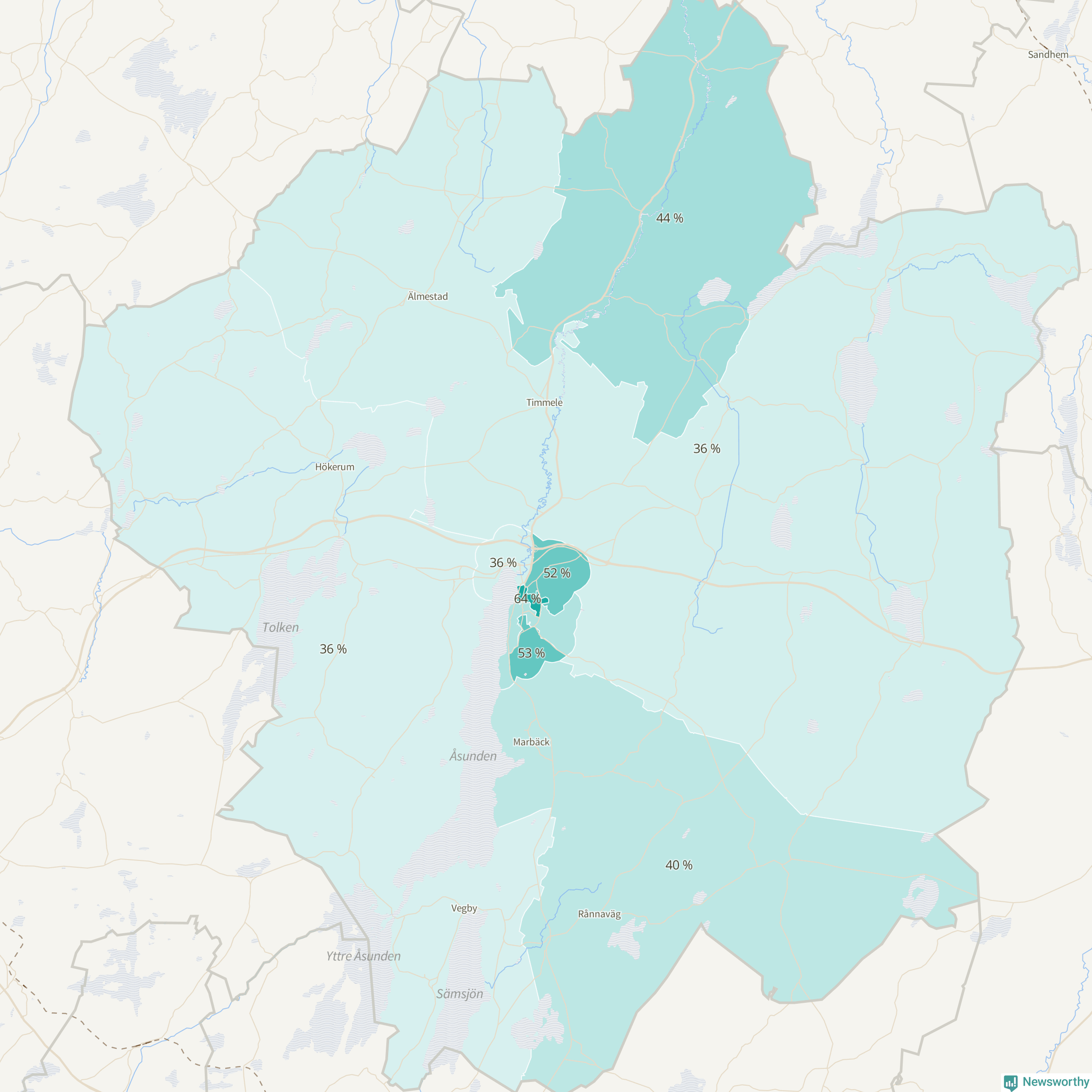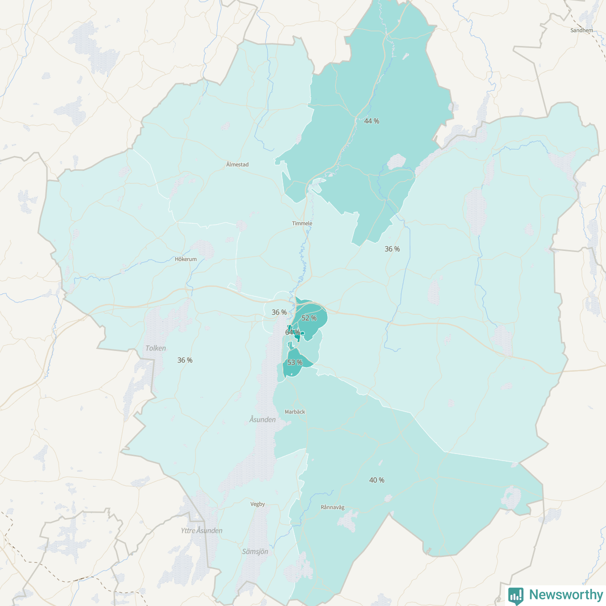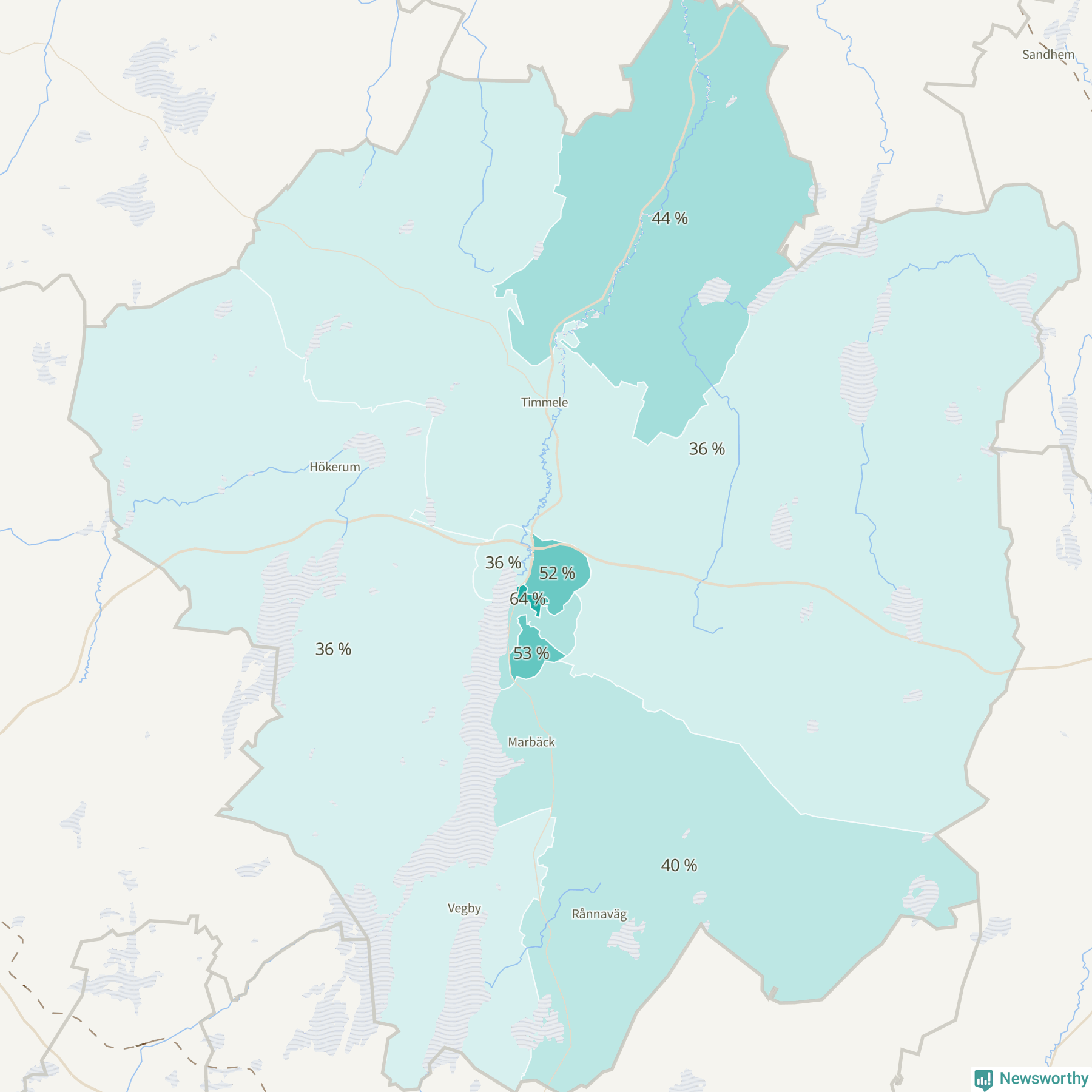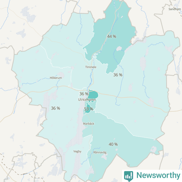 | Hökerum-Tvärred-Vegby | 761 | 36 % |