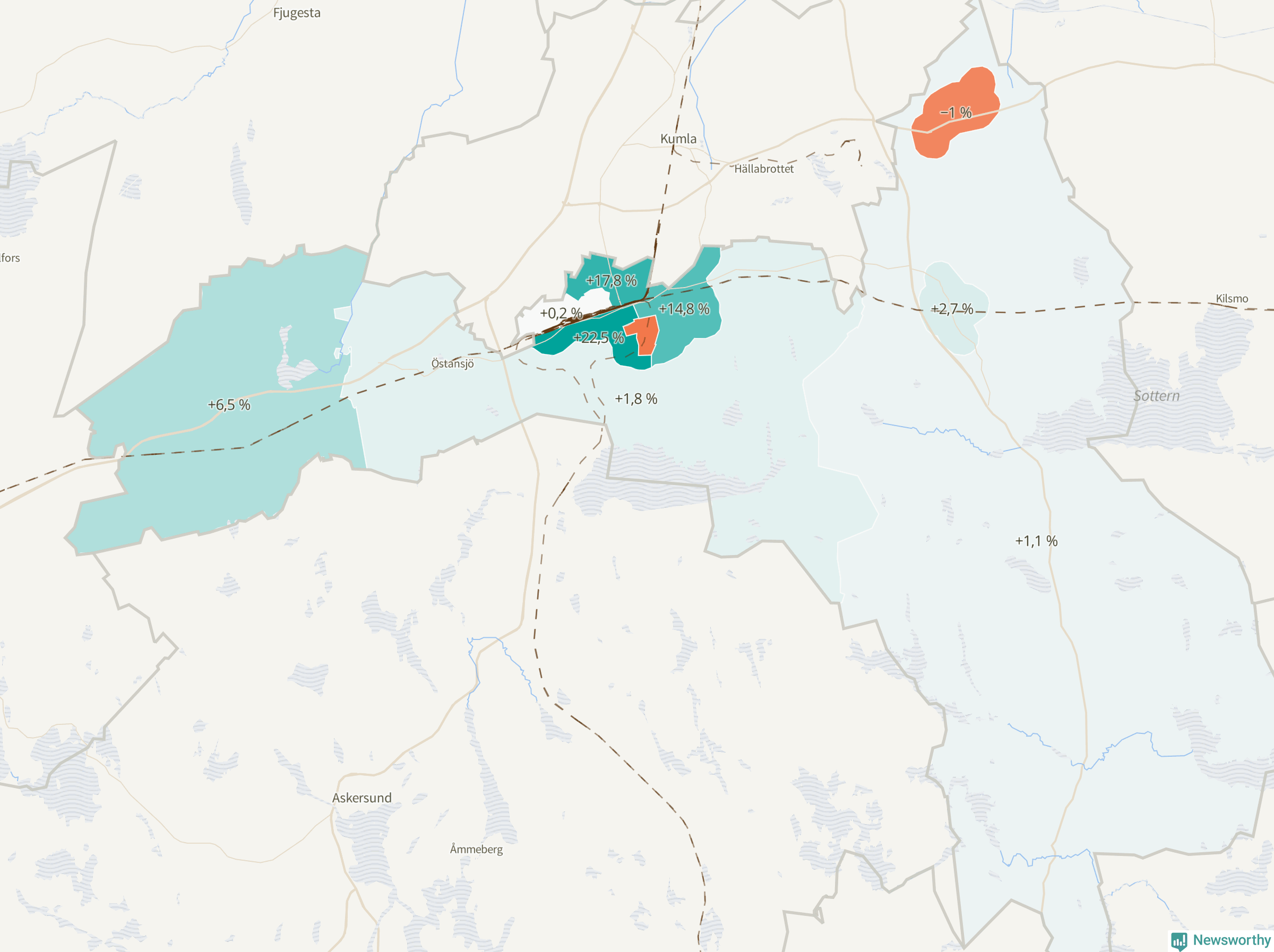 Men det växer inte överallt i kommunen. Det visar sig när när Newsworthy samlar SCB:s befolkningsdata från tio år för att se hur kommunen utvecklats. Medan området Hallsberg västra-Stortorget-Vibytorp har ökat invånarantalet med 289 personer – 22 procent – har Nya Långängen-Falla snarare minskat sin befolkning något.