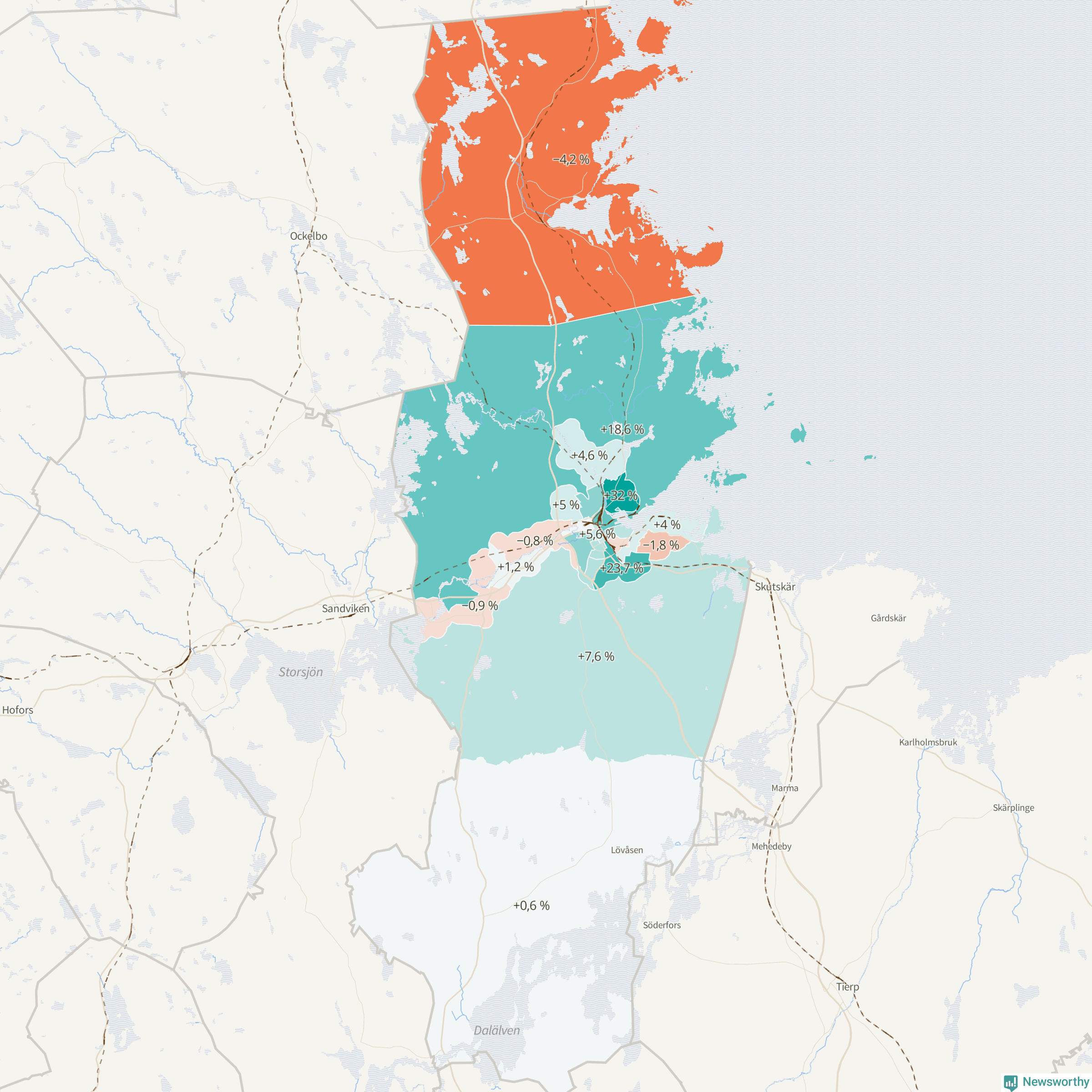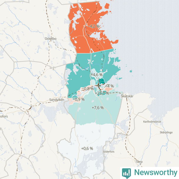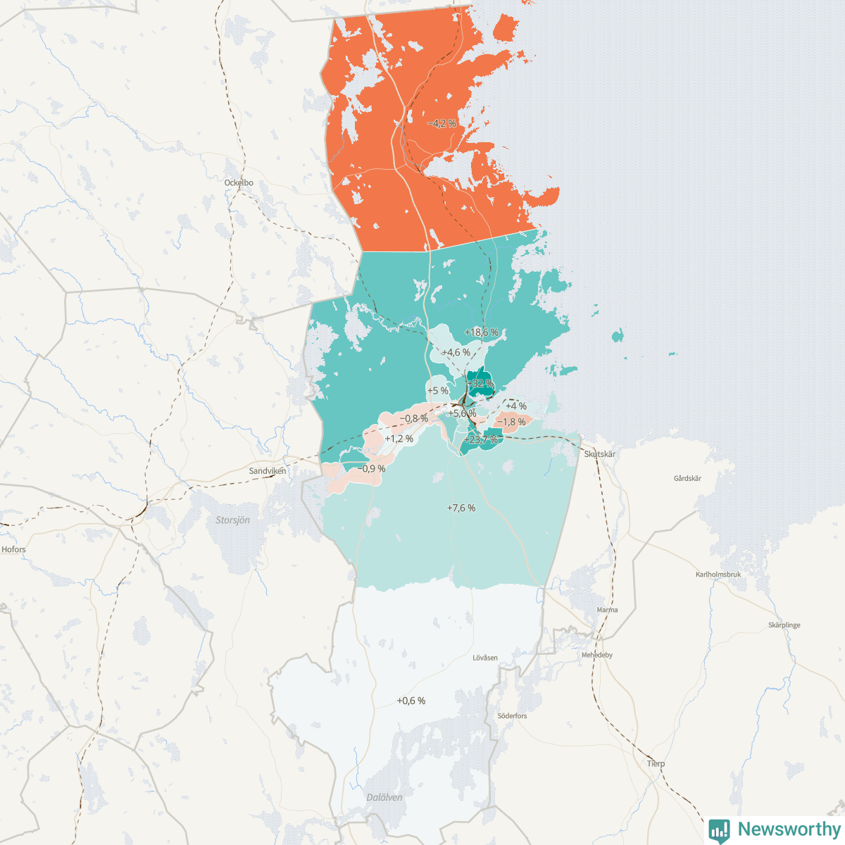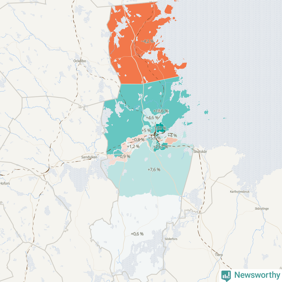 Men det växer inte överallt i kommunen. Det visar sig när när Newsworthy samlar SCB:s befolkningsdata från tio år för att se hur kommunen utvecklats. Medan området Jonstorp-Lindbacka-Strömsbro har ökat invånarantalet med 758 personer – 32 procent – har Bergby-Norrsundet minskat sin befolkning med 155 invånare.