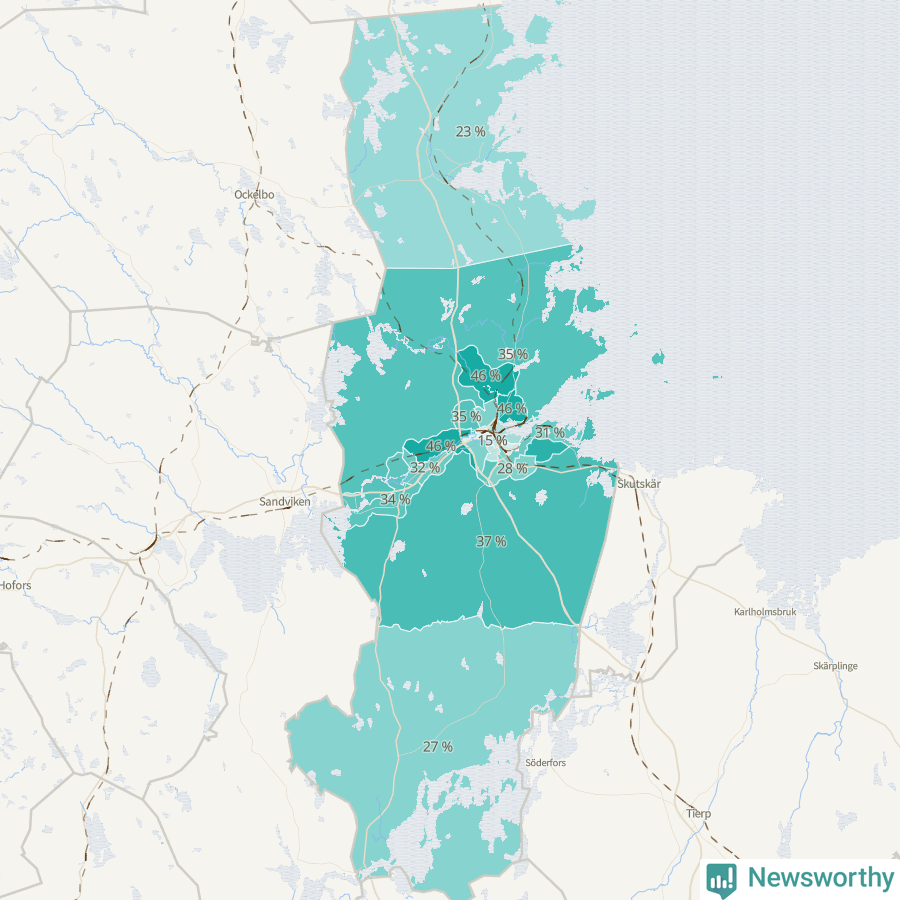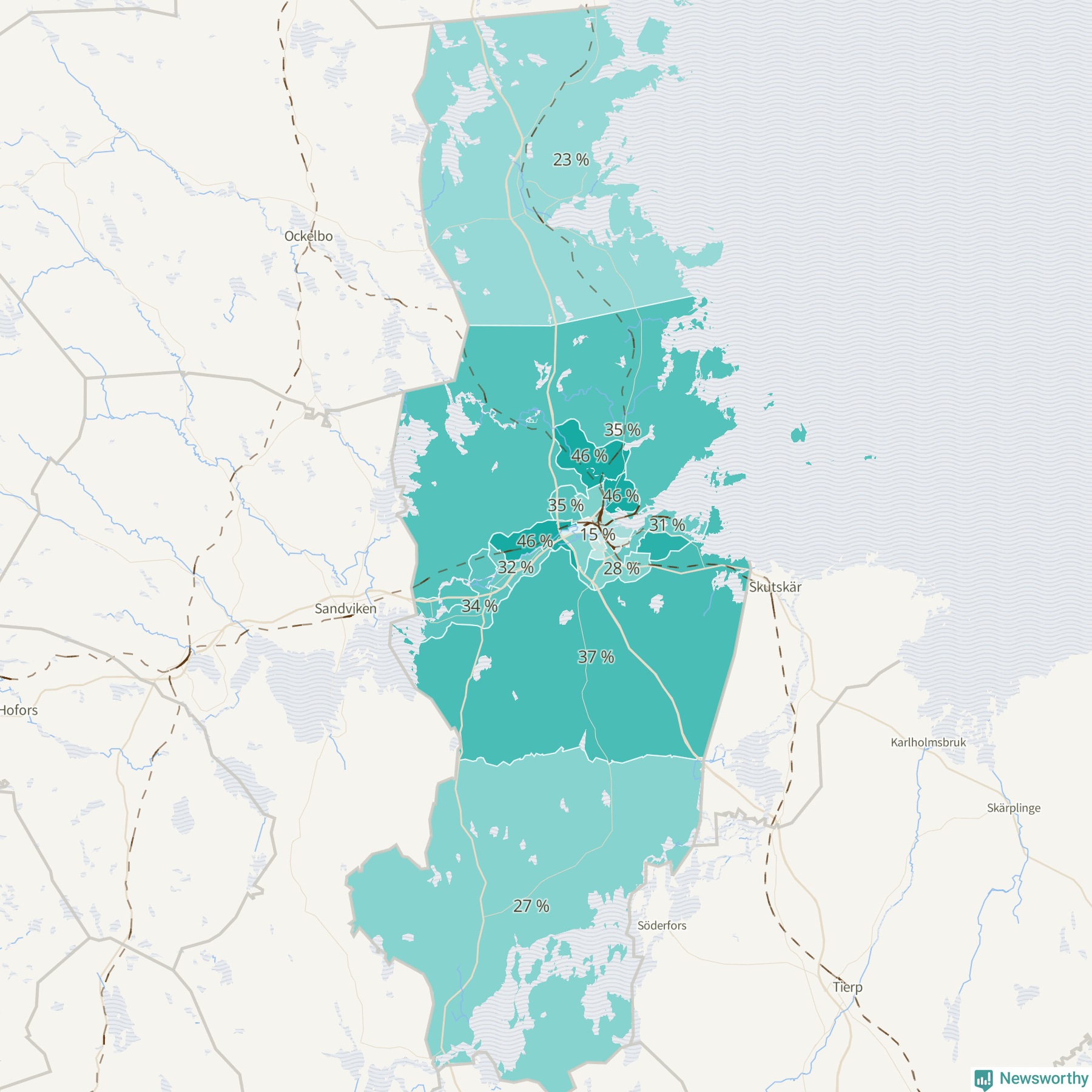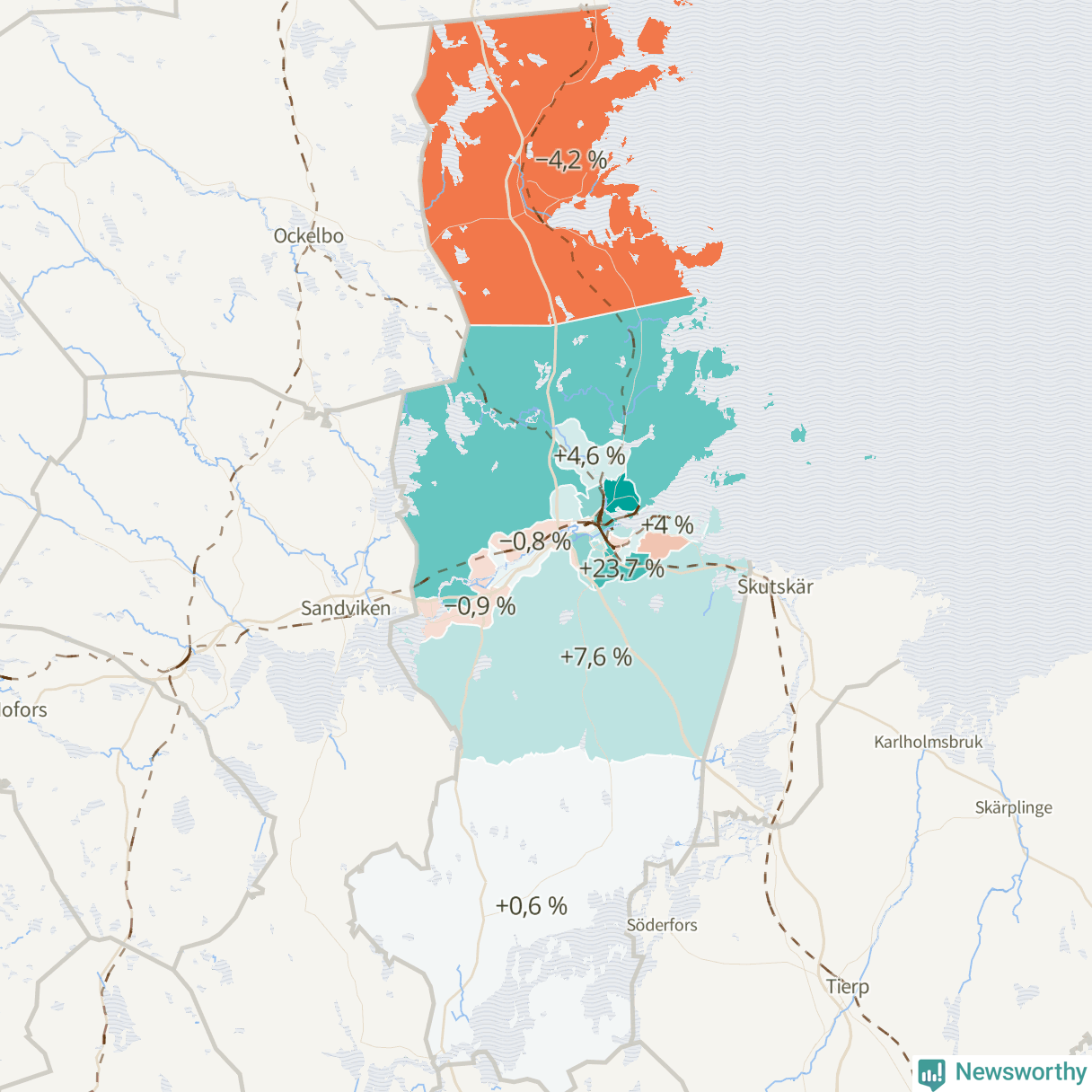 Men det växer inte överallt i kommunen. Det visar sig när när Newsworthy samlar SCB:s befolkningsdata från tio år för att se hur kommunen utvecklats. Medan området Jonstorp-Lindbacka-Strömsbro har ökat invånarantalet med 758 personer – 32 procent – har Bergby-Norrsundet minskat sin befolkning med 155 invånare.