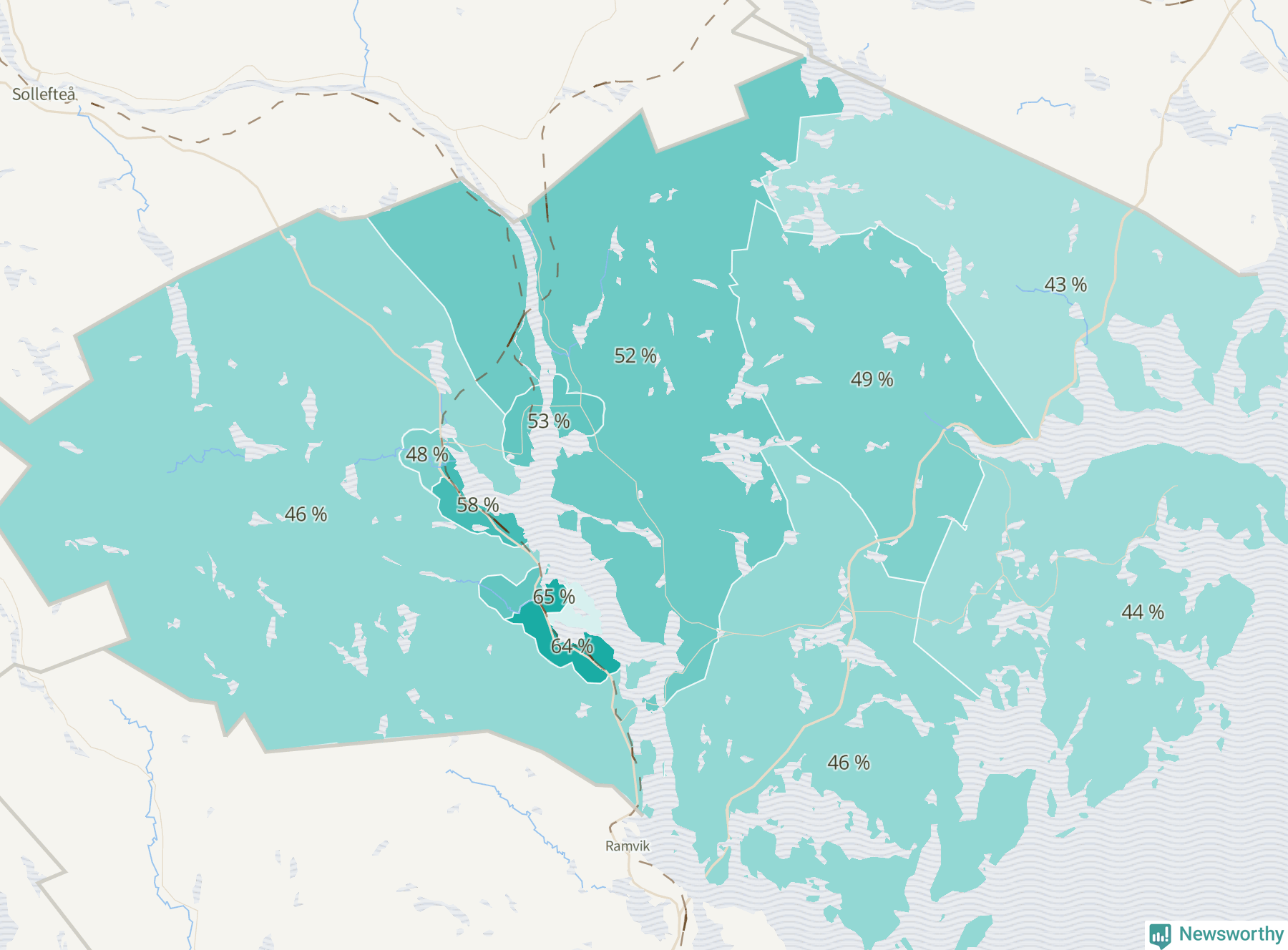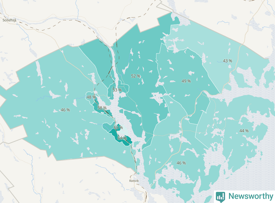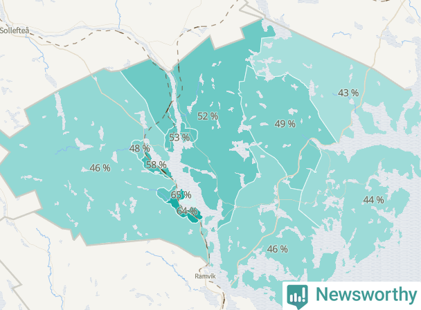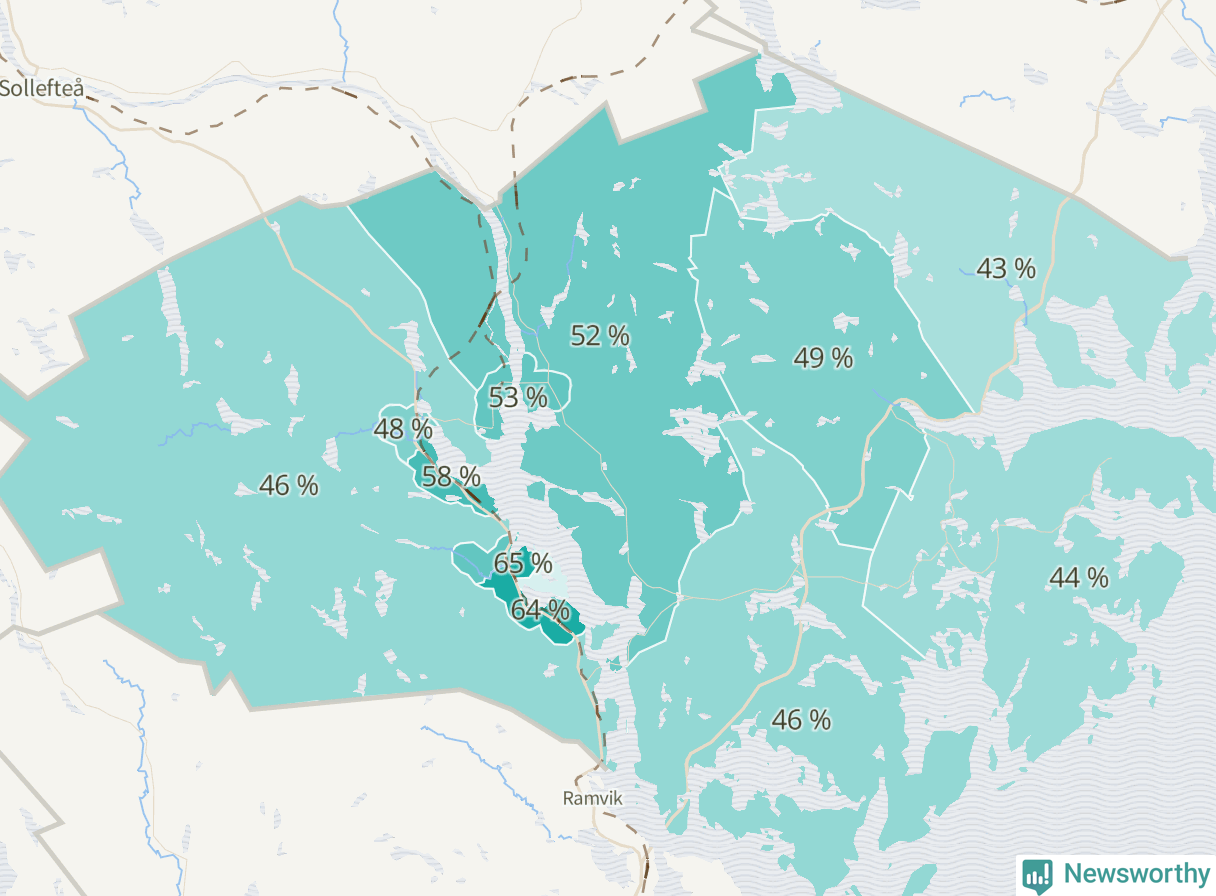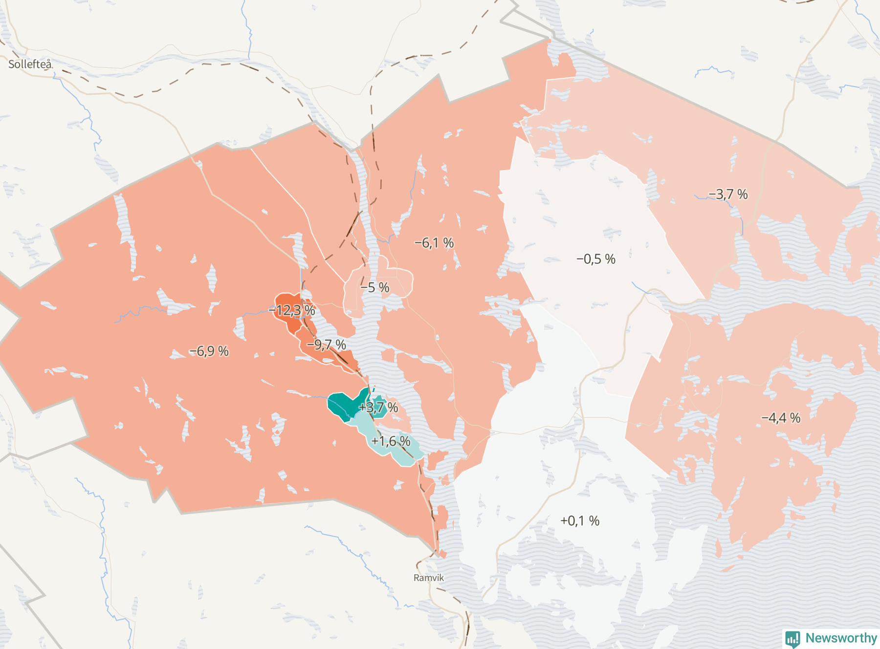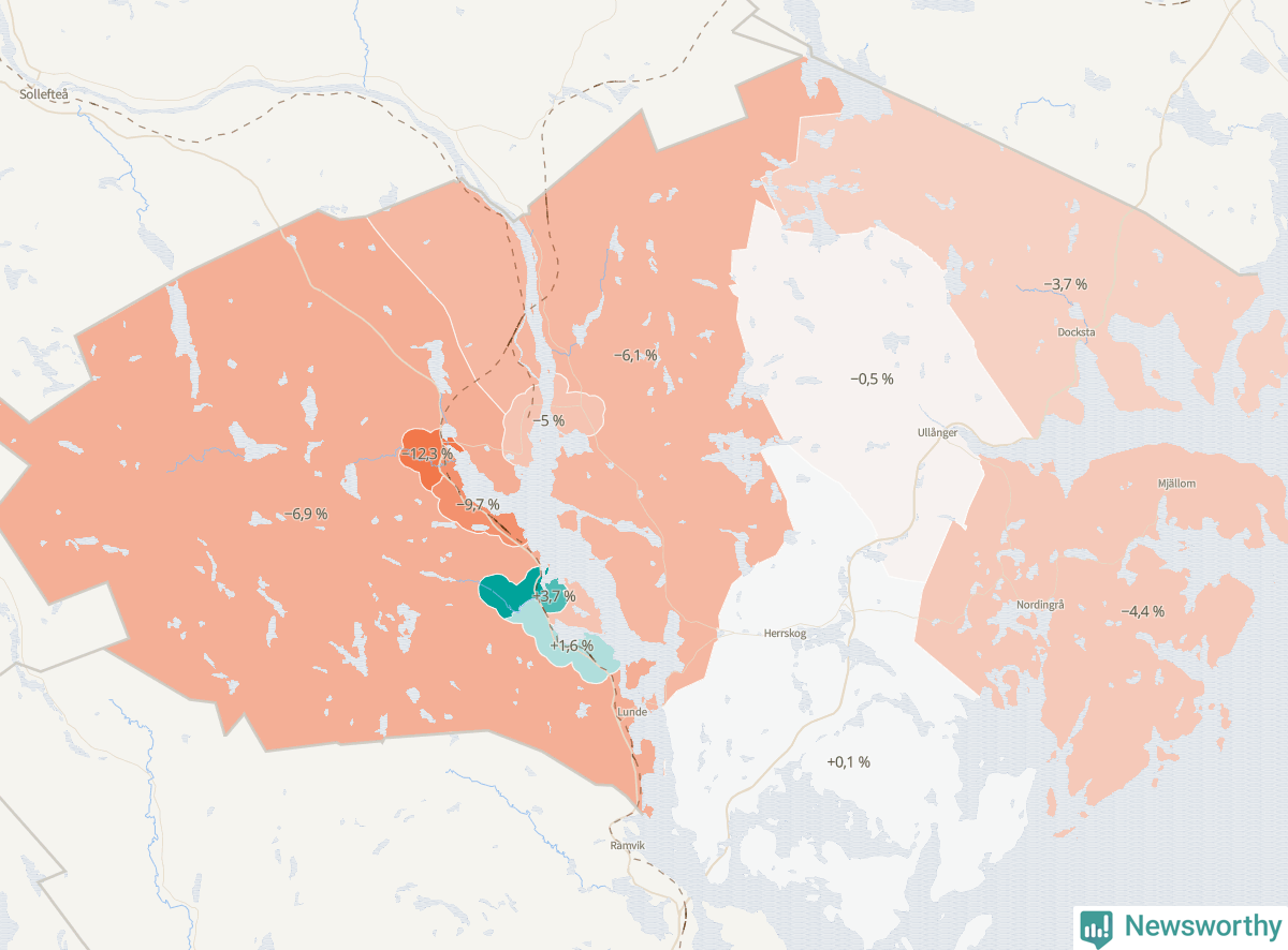 Men minskningen sker inte jämnt i hela kommunen. Det visar sig när när Newsworthy samlar SCB:s befolkningsdata från tio år för att se hur kommunen utvecklats. Medan området Kramfors stad västra har ökat invånarantalet med 60 personer – 5 procent – har Bollstabruk minskat sin befolkning med 126 invånare.
