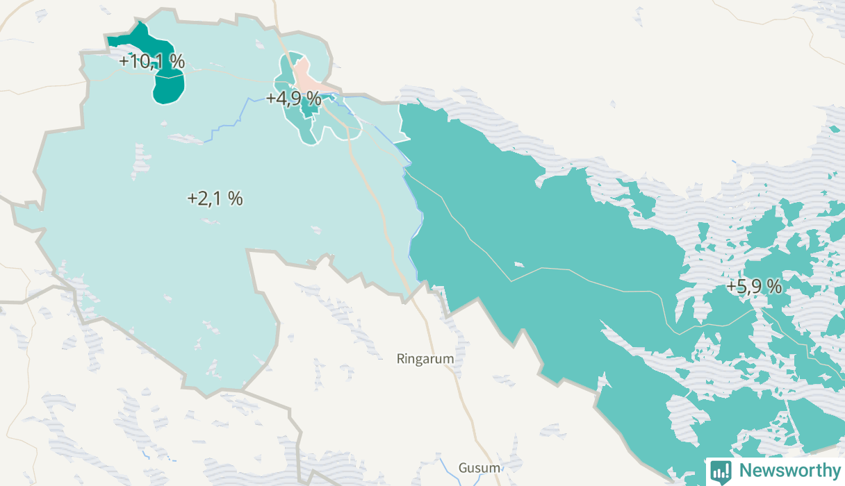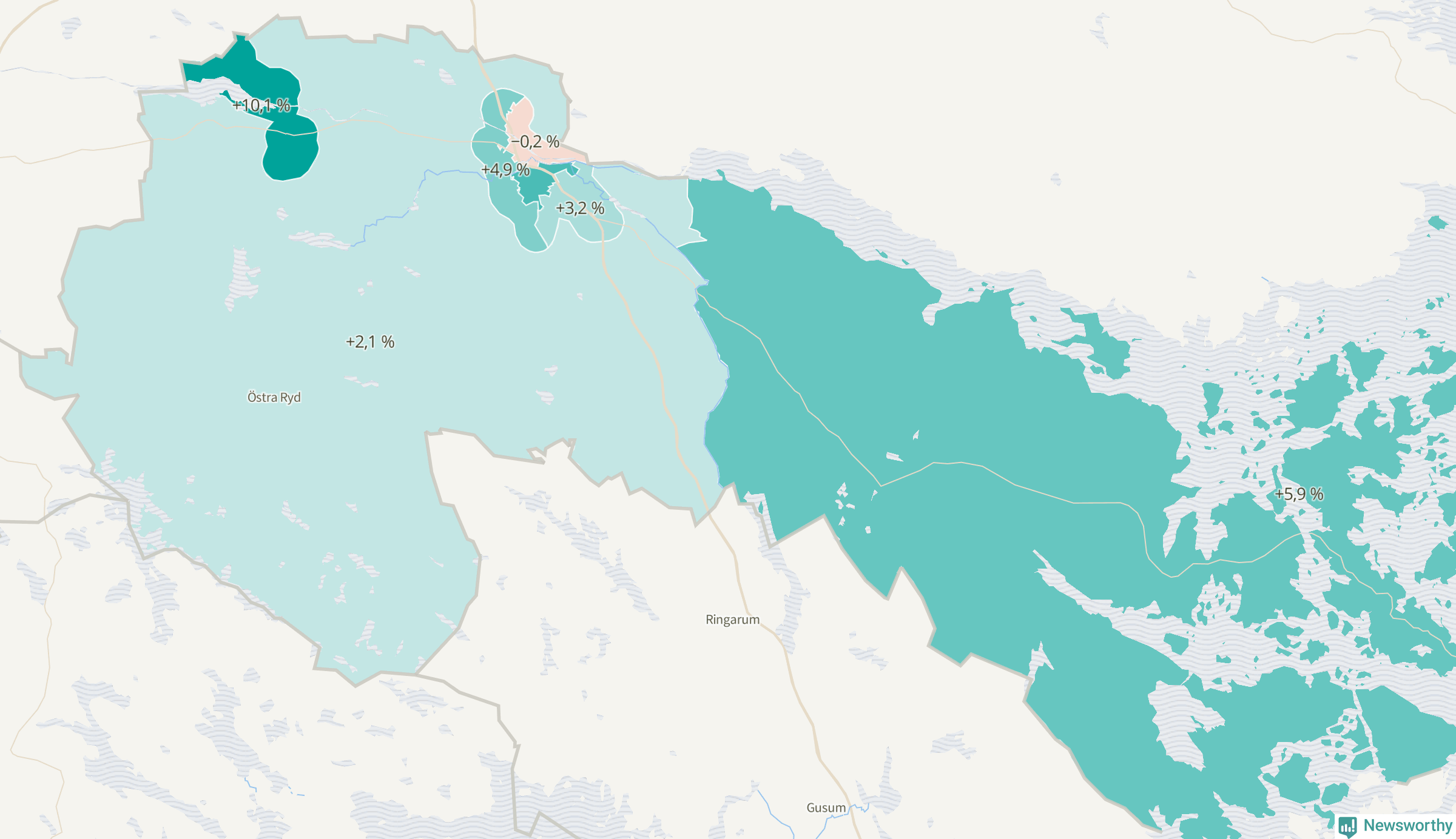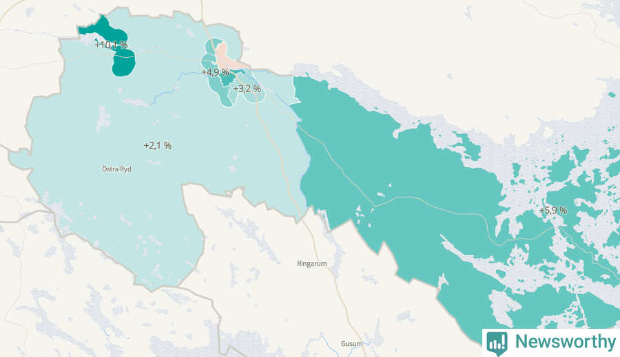| Söderköpings omland-Östra Ryd | 3 431 | 3 504 | +73 | +2 % ▲ |