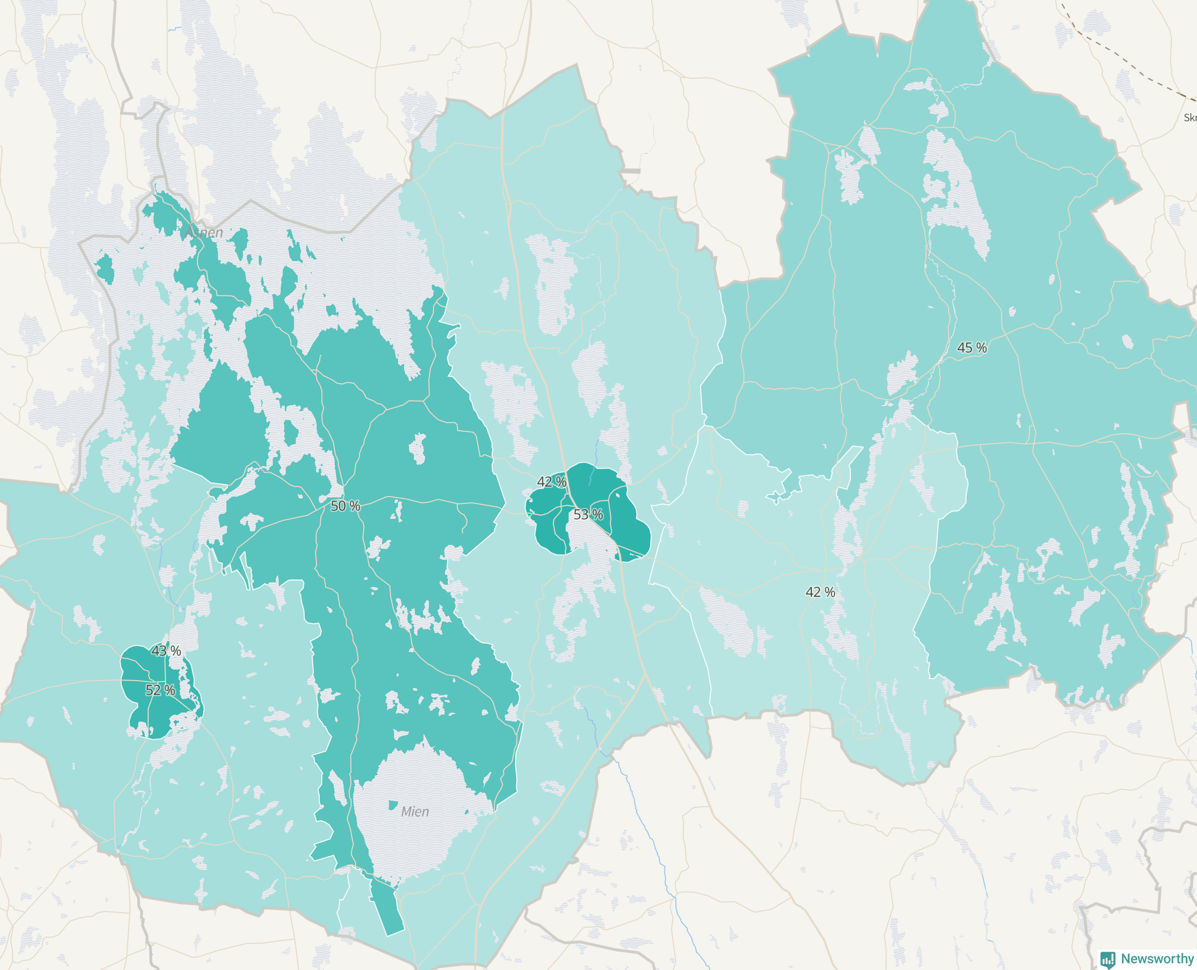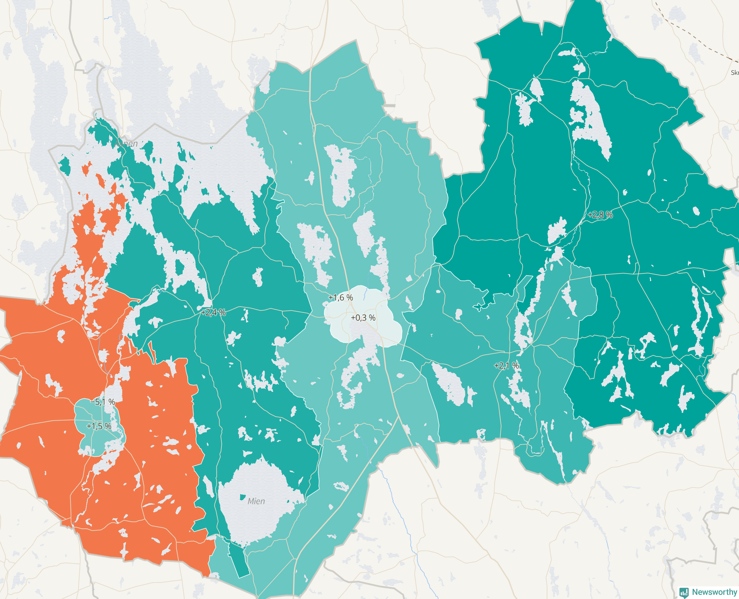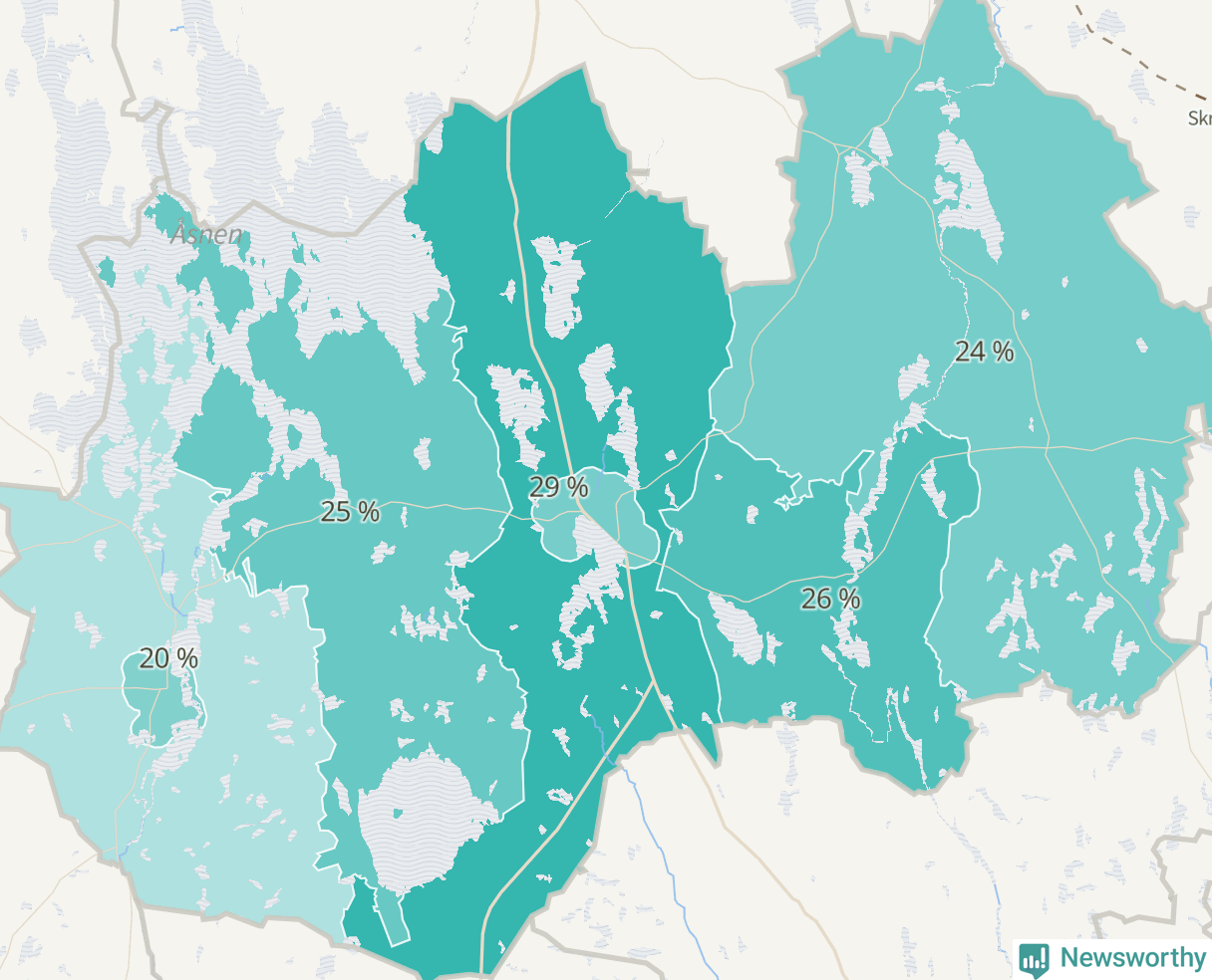 Men det växer inte överallt i kommunen. Det visar sig när när Newsworthy samlar SCB:s befolkningsdata från tio år för att se hur kommunen utvecklats. Medan området Linneryd-Älmeboda har ökat invånarantalet med 52 personer – 3 procent – har Ryds glesbygd minskat sin befolkning med 38 invånare.