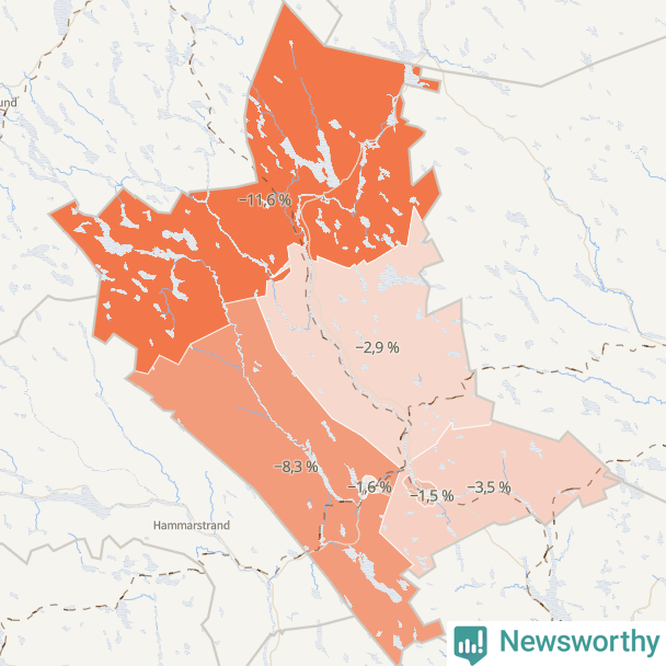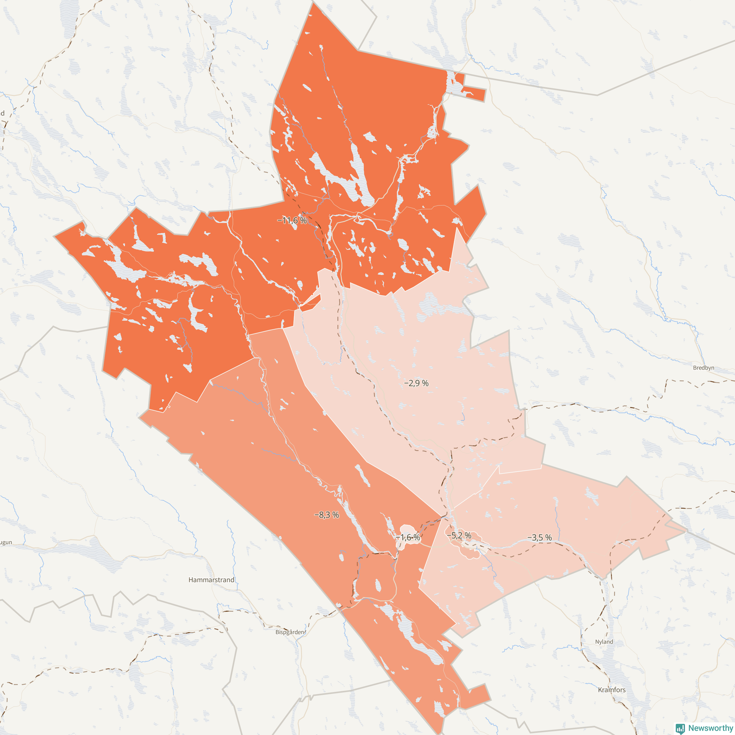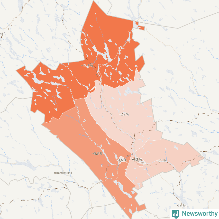 Minskningen syns i alla de sju områden som SCB delar upp kommunen i, visar Newsworthys genomgång av detaljerad befolkningsdata. Störst är minskningen i Junsele-Ramsele, som minskat från 2 818 till 2 492 invånare.