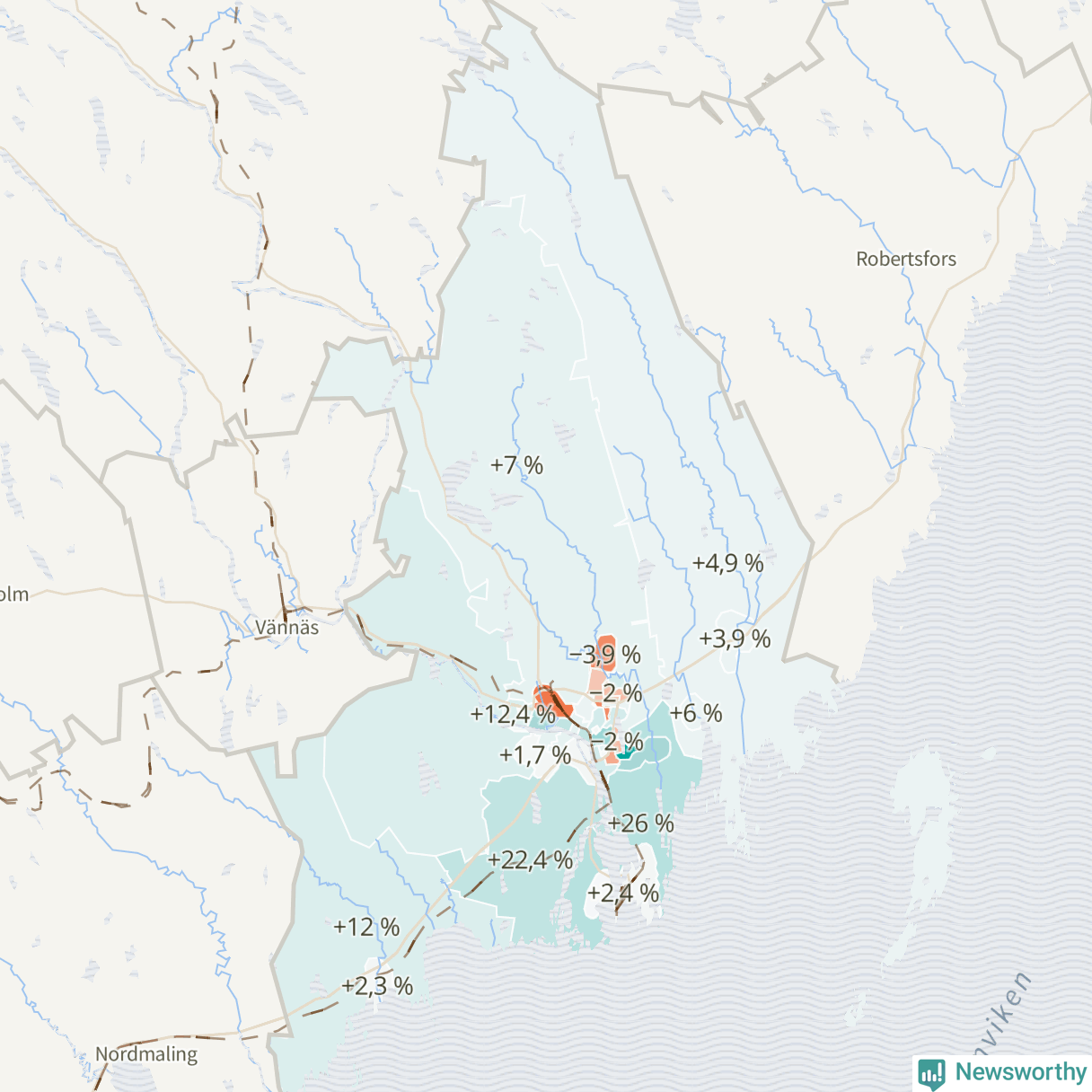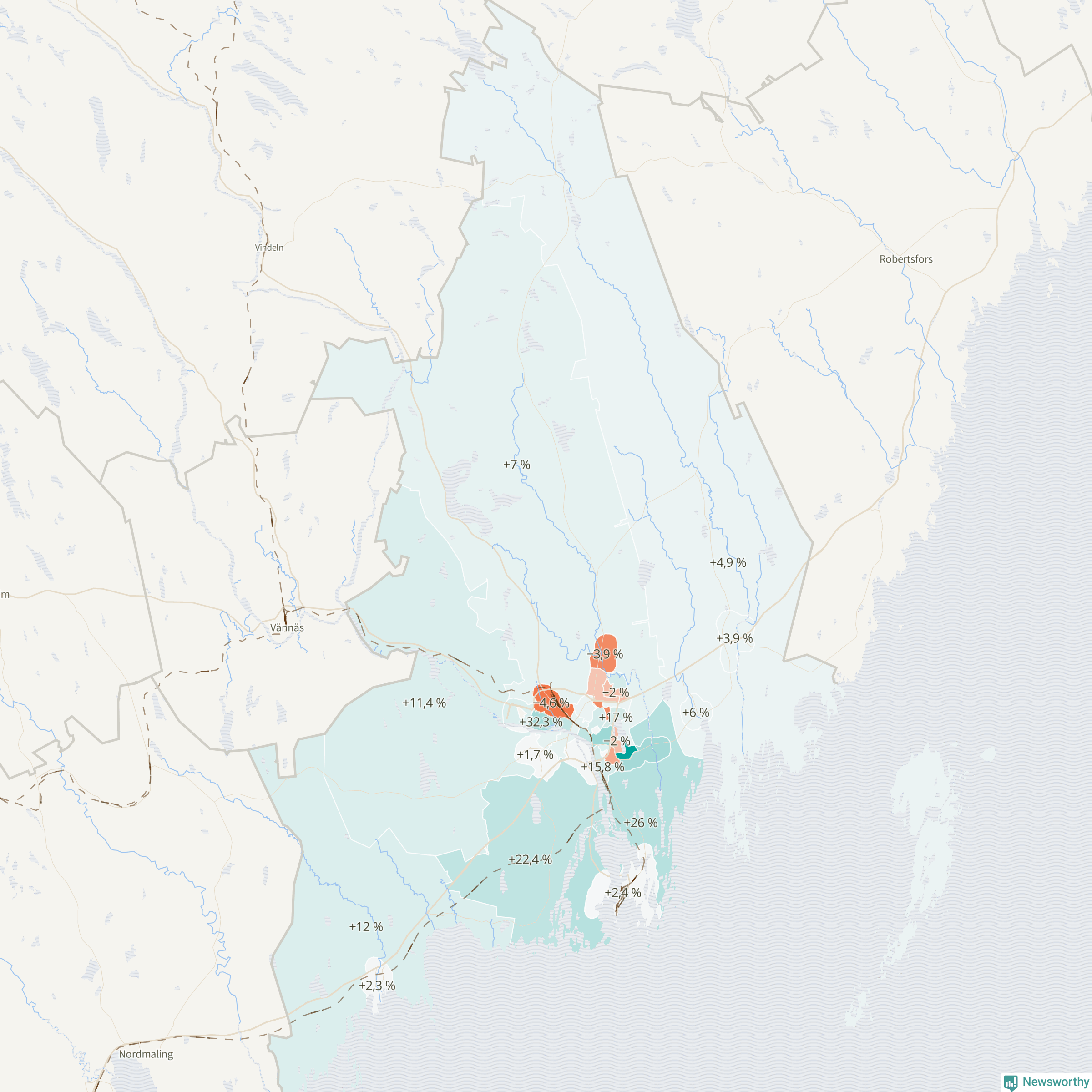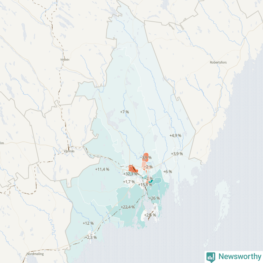 | Holmsund-Obbola omland | 1 364 | 1 719 | +355 | +26 % ▲ |