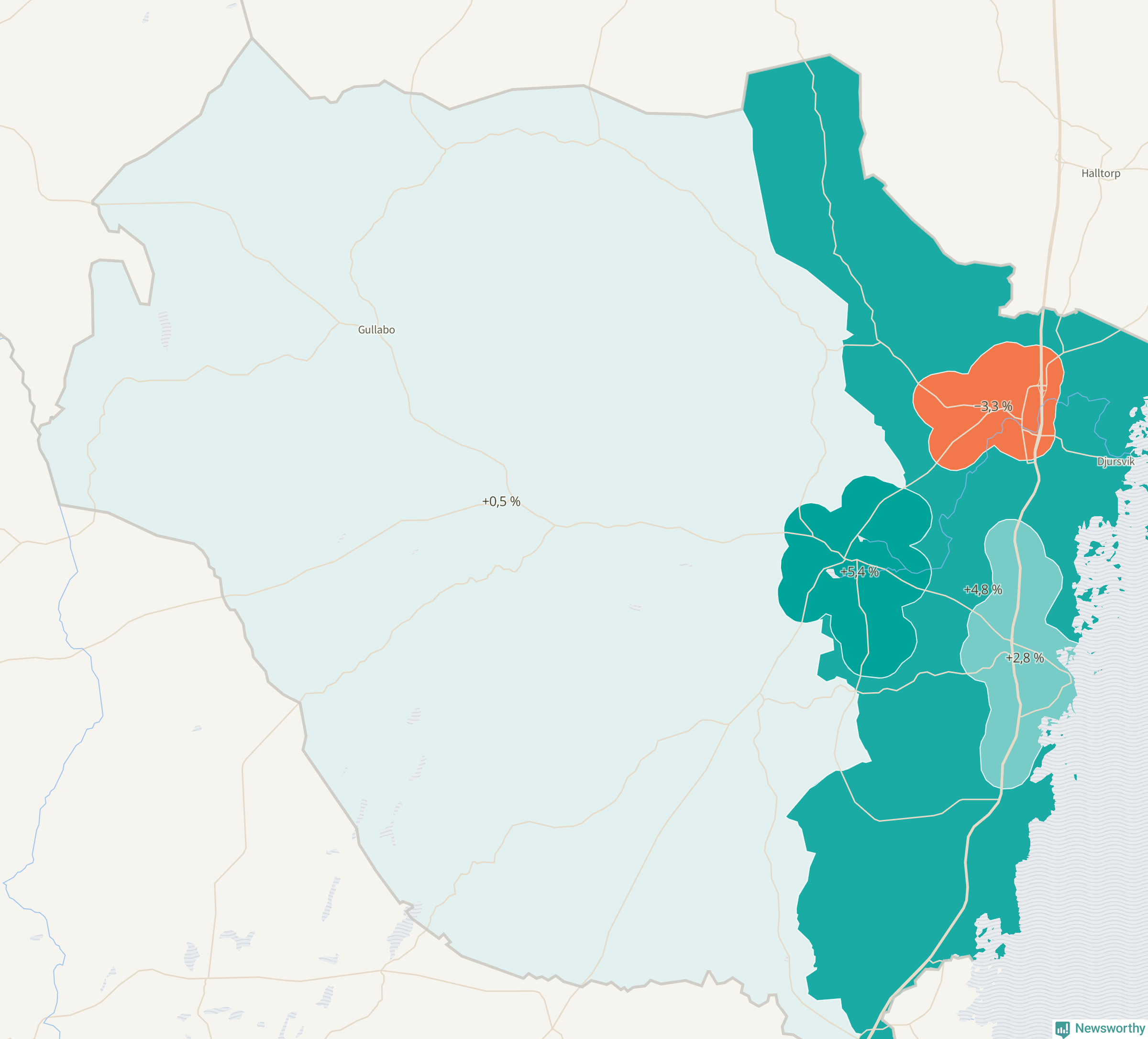 Men det växer inte överallt i kommunen. Det visar sig när när Newsworthy samlar SCB:s befolkningsdata från tio år för att se hur kommunen utvecklats. Medan området Torsås har ökat från 2 035 till 2 145 personer minskar befolkningen i Söderåkra och ligger i princip still i Gullabo.