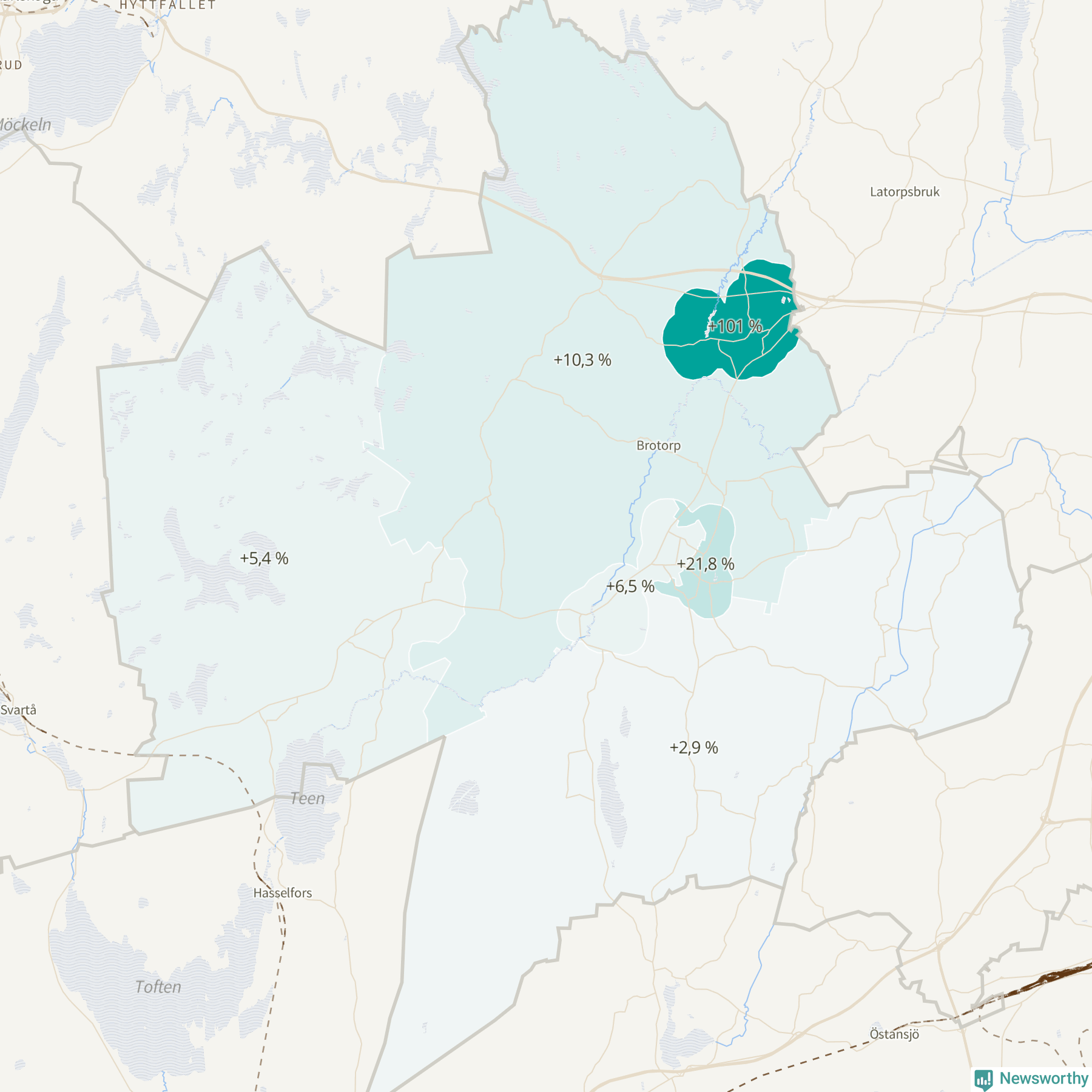 Ökningen syns i alla de sex områden som SCB delar upp kommunen i, visar Newsworthys genomgång av detaljerad befolkningsdata. Störst är ökningen i Lekeberg-Lanna, som ökat från 925 till 1 859 invånare.